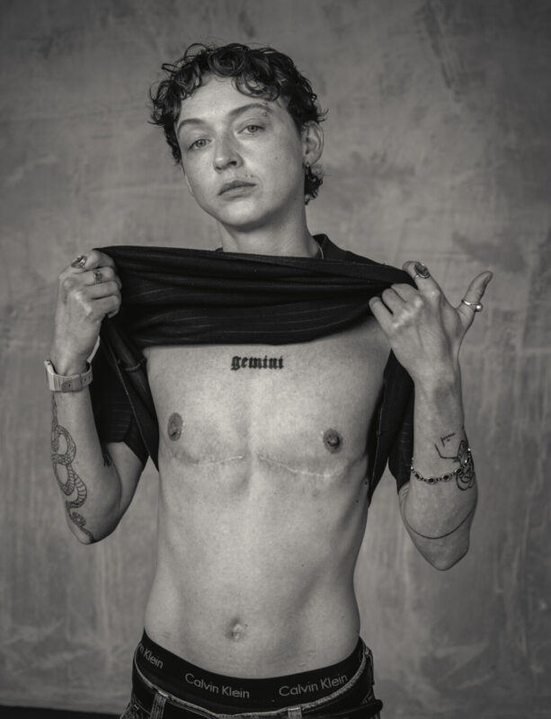 “Trans is what I am rather than who I am,” says Finn Buchanan. “Other aspects of what I do are more defining of me as a person than my gender history.” Still, he’s proud because everything he is now was earned. His home with girlfriend and fellow trans creative Charley Dean Sayers is his sanctuary. “I feel that I have nothing to hide or be ashamed of.” Testosterone, he says, has been “a priceless tool” and his moustache – finally coming in – is joy incarnate. His icons? A full house of trans brilliance, from the internet personality Cookie Tookie to the late, great musician and producer Sophie to Charley herself, whose photo diary is a touchstone. Buchanan’s message is clear: visibility matters, representation is vital and there is no shortcut to becoming yourself. “I’m a result of my mistakes,” he says, “and my responses to those have made me who I am.”