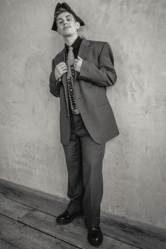 Oscar M – aka Hot Boi Yo – is here to take up space. “I do everything from modelling and performing to being sex-positive in events and queer spaces,” he says. Raised in Australia and now based in London, Oscar found a gap in the cultural landscape back home and filled it with style, grit and glitter. “I wanted to be the first trans [model] in Australia, and I fucking was,” he says with a laugh. “I got into all of this because I wanted people to see how amazing we are, so even though I’ve been terrified to do some things, I always push myself.” His aesthetic is power, his mission is visibility and his vibe is unmistakably main character.