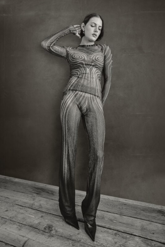 Elix Toci, which she pronounces each letter of, as in E-L-I-X, after she says her name, is a biohacker in the boldest sense. “I was not satisfied with my genetics, my biology… so I was like, no. I can change it,” she says. To her, transitioning isn’t just transgressive, it’s transcendental. The self-professed “interdimensional alien” moves through fashion, social media, indie film (yes, she’s on IMDb, and yes, she stabbed someone in the eye on screen) and art. Her 4D installation Matcha Code 132, which can be found on her TikTok (@elix.ai), is, as expected, matcha-themed and slightly unhinged. “That’s why biohacking describes me a lot,” she says with a laugh. Formless, genreless, fabulous: Elix exists at the intersection of beauty and glitch.