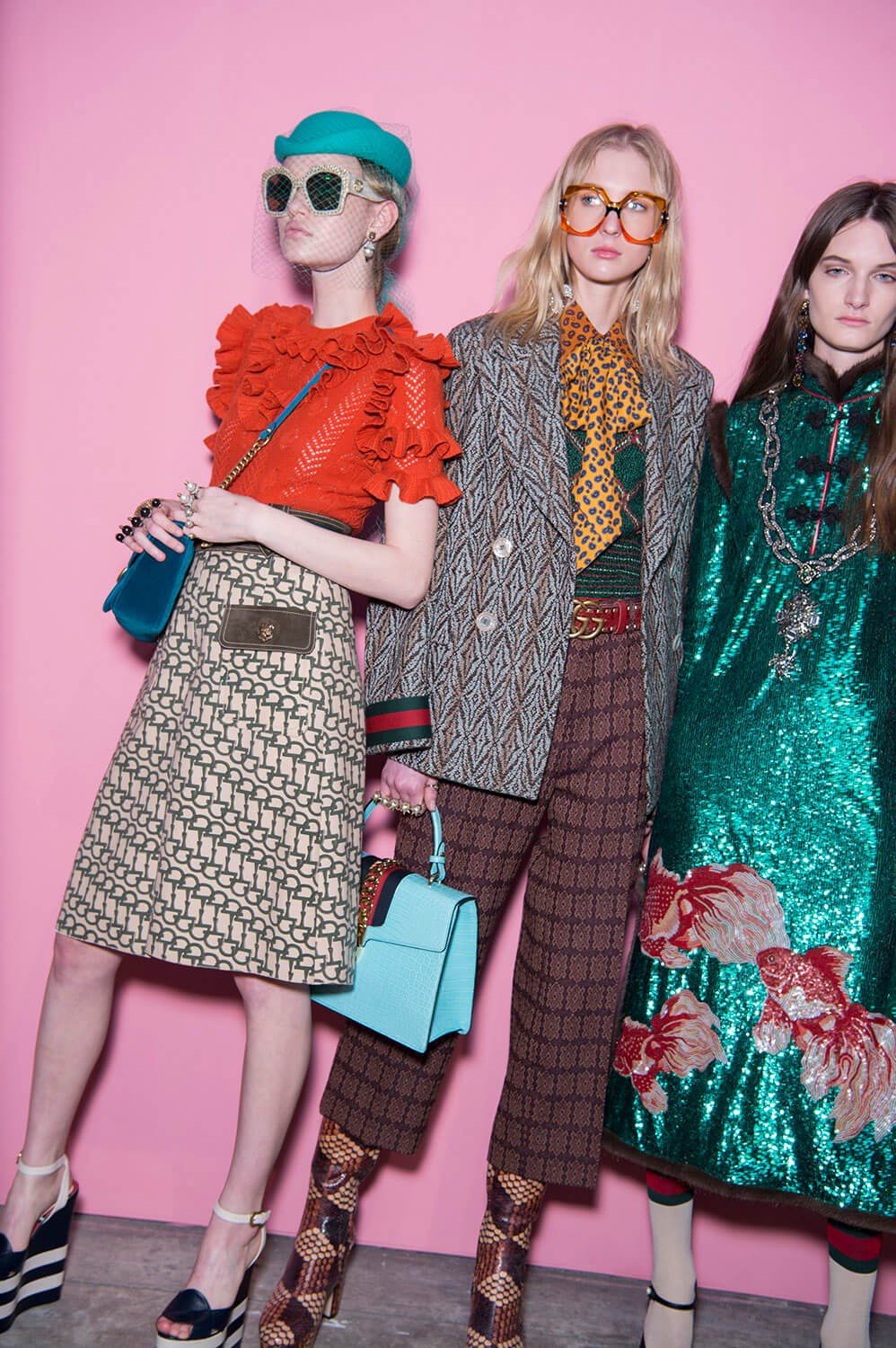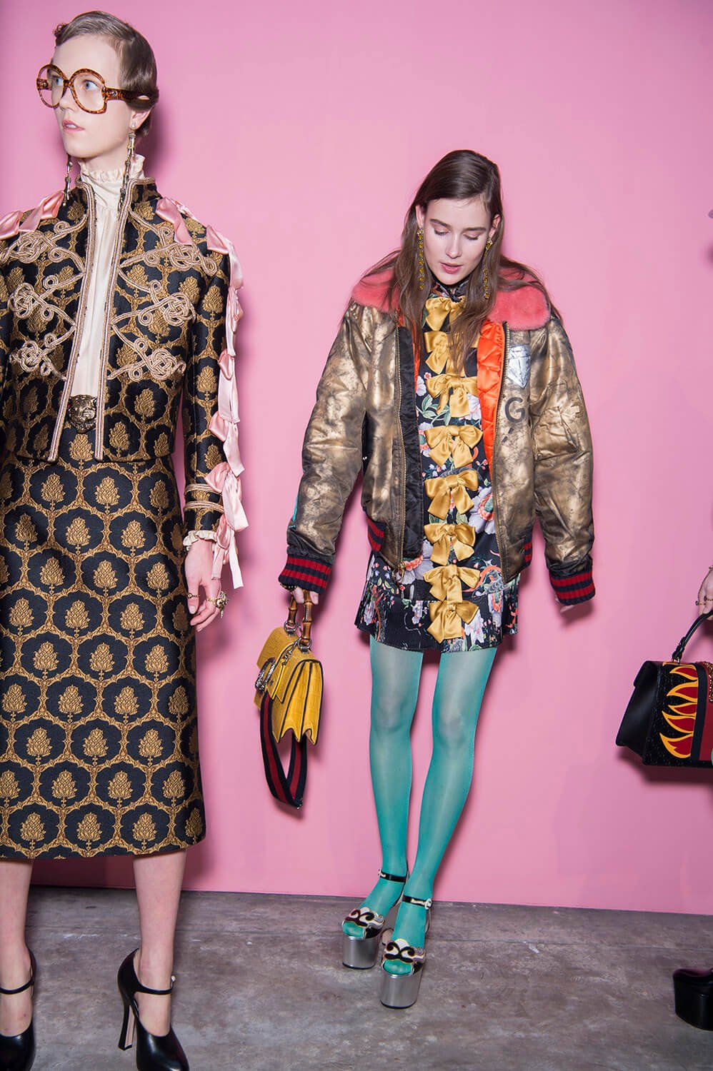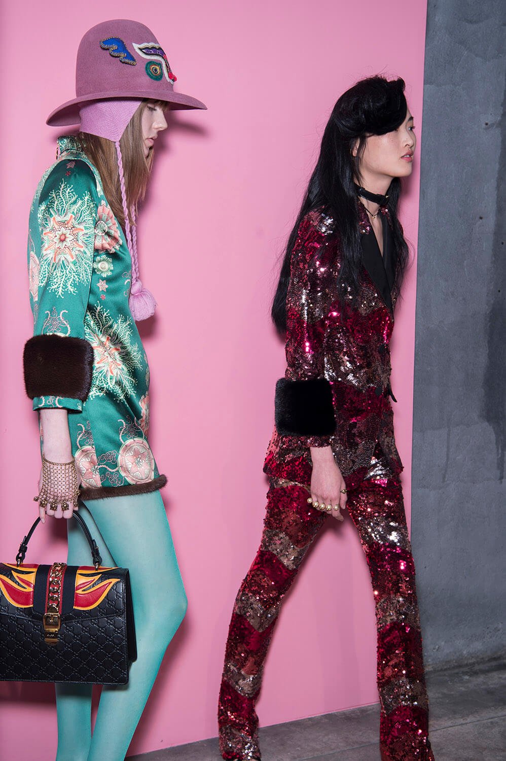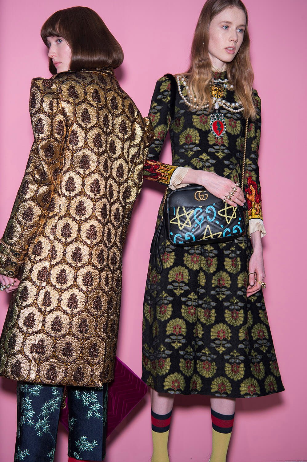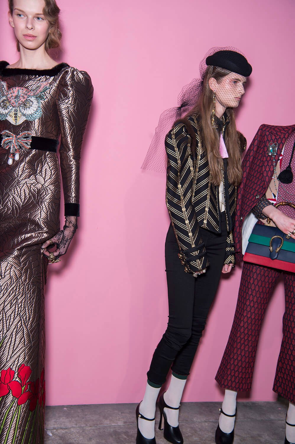 The 1970s via the 1570s. Studio 54 with the Renaissance. Borgias meets Bianca Jagger? It’s a mad mad mix at Gucci, a glorious mash up of histories and loves, whirled together in a blender and laid out for all to feast on. God it’s difficult to reconcile the fact Alessandro Michele has just passed the 12 month mark, offish, as the company’s creative head, given how thoroughly and – we must say – radically he’s overhauled the image and reinvented the style of this most Italian of brands. As ever there was an undercurrent of lust to this Gucci show – something he shares with his predecessors at the label. This lust feels more consumer than carnal though. There’s an urge to acquire, to get your mits on the sequin dresses, the brocade jackets, the chiffon gowns and the graffiti-sprayed bags and mink coats. Form an orderly queue punters.