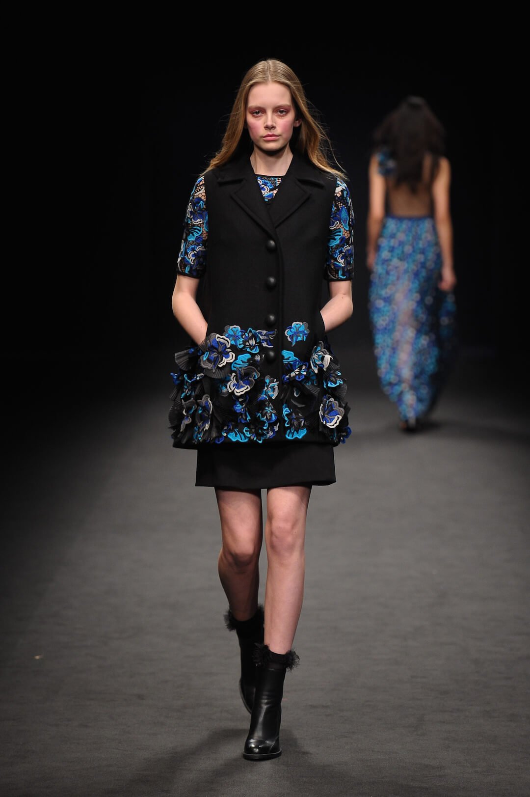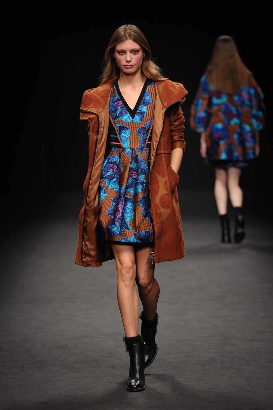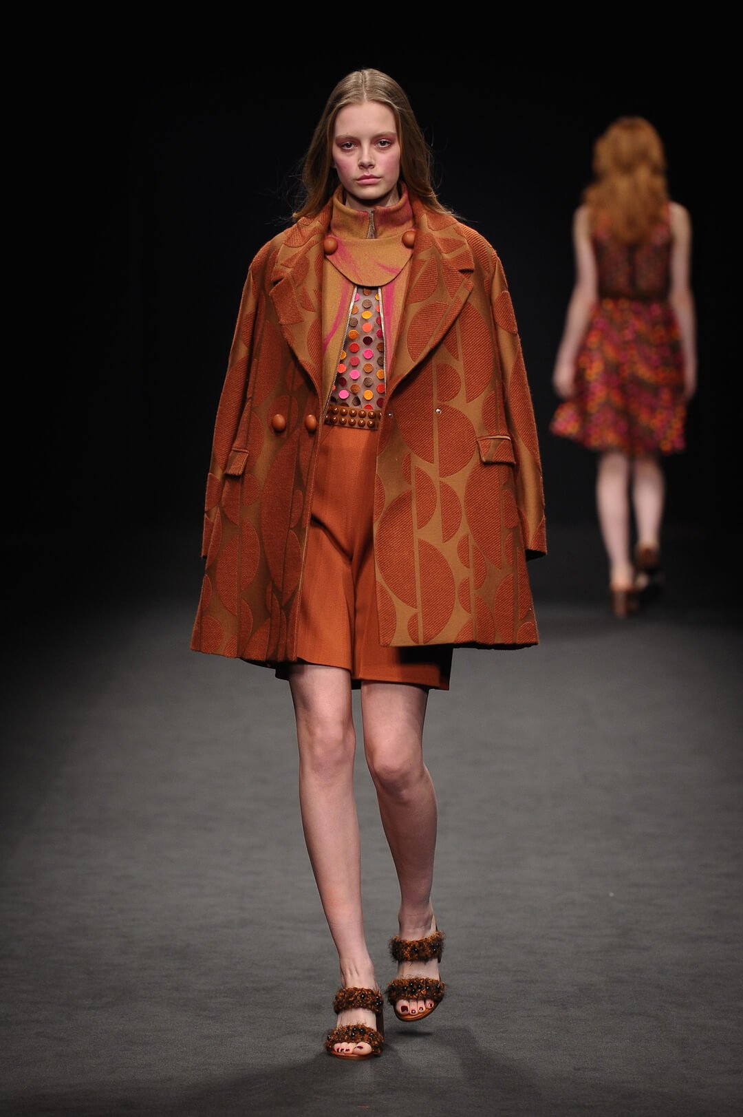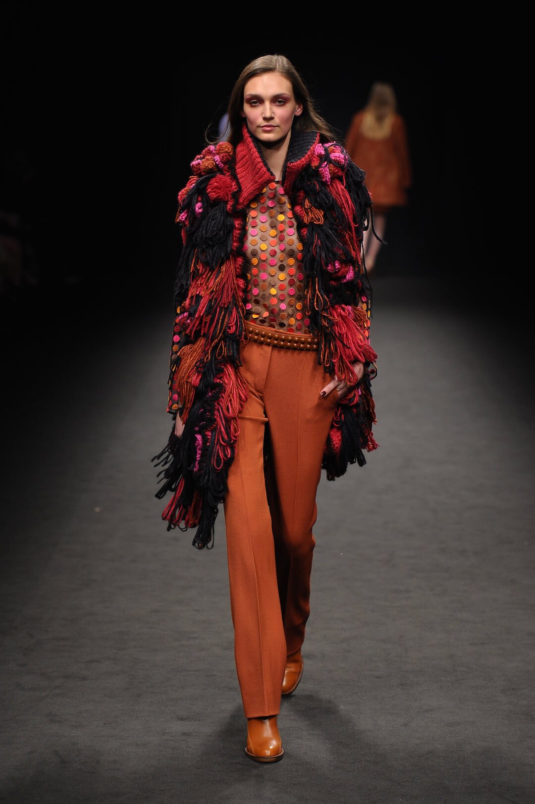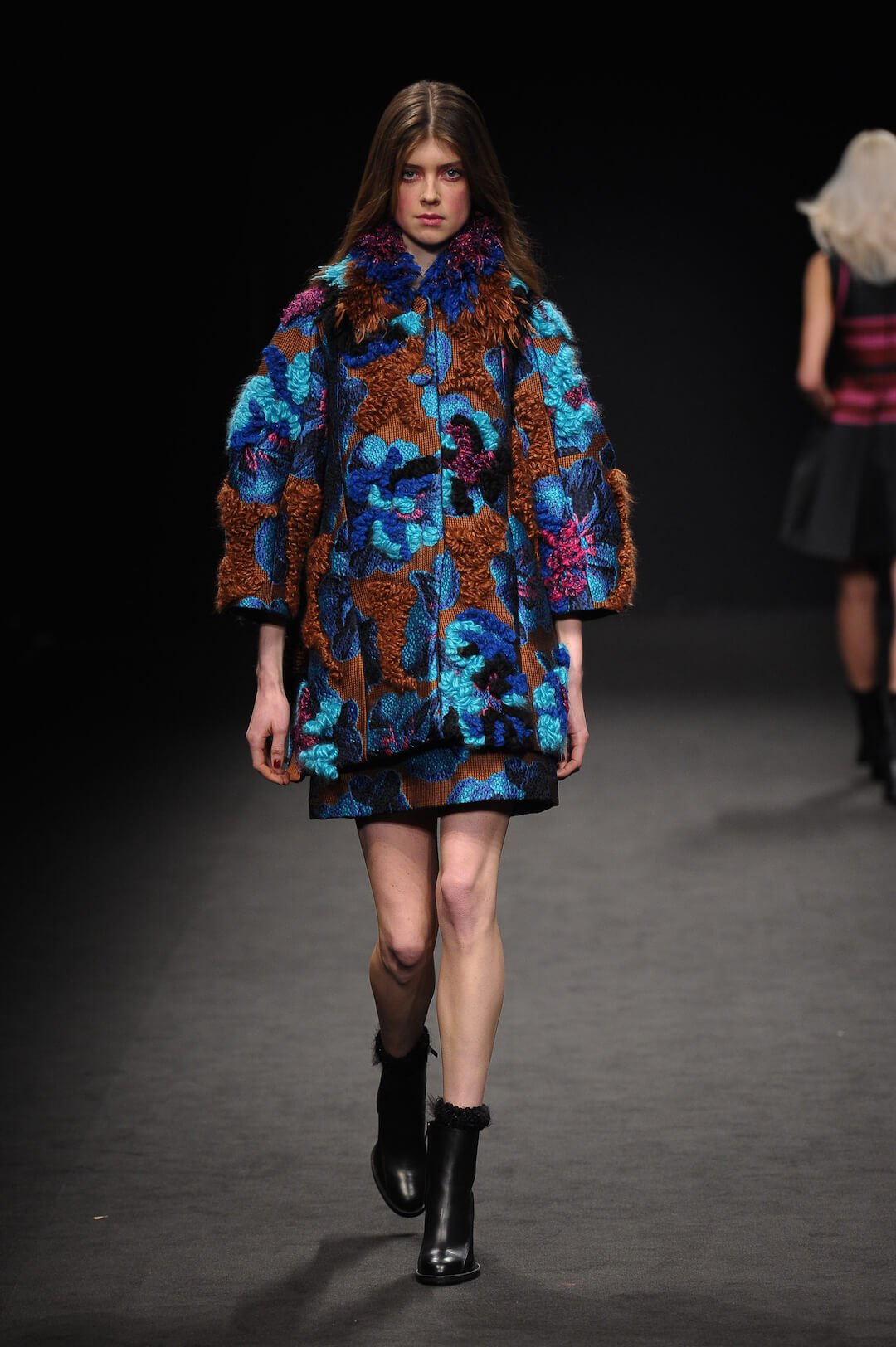 Alice in Flowerland. Thats the name of the Byblos newest collection and to quote from the show notes, “Alice 2.0 by Byblos Milano goes through the looking-class to experience a dream-line dimension filtered through artistic suggestions to create a unique floral couture style”. The result, a floral explosion in blue of three dimensional florals that explode all over baby doll dresses, like a field of bluebells in springtime. The sixties feel continues with devore a-line coats and shaggy crochet knits in a rich palette of autumnal hues giving the whole collection a slight free wheeling hippy vibe.