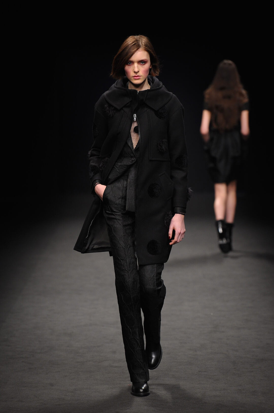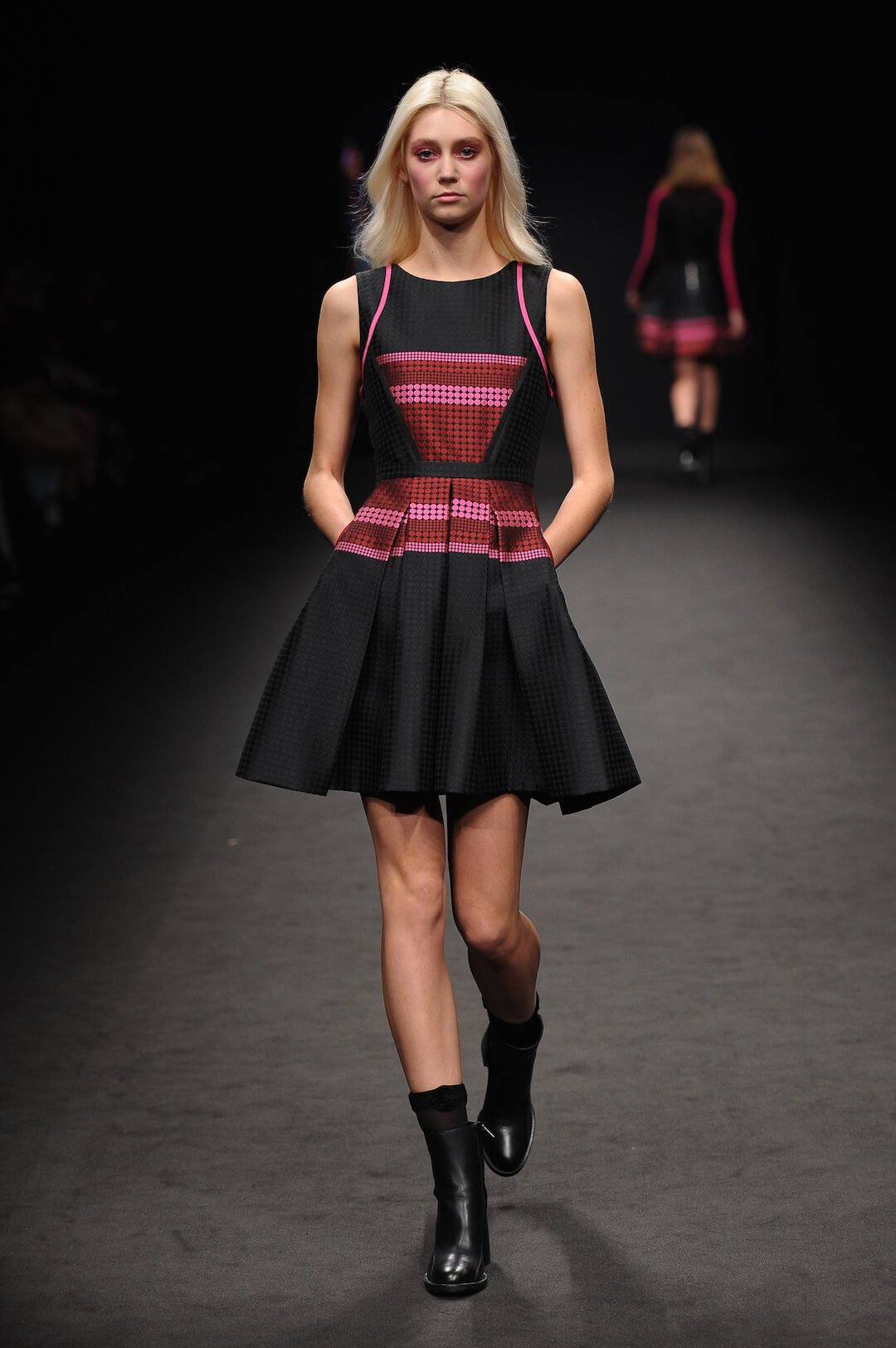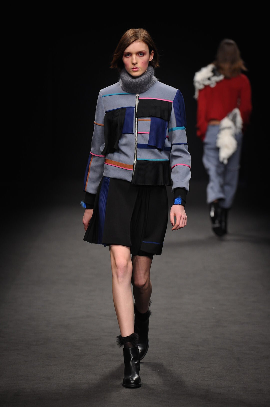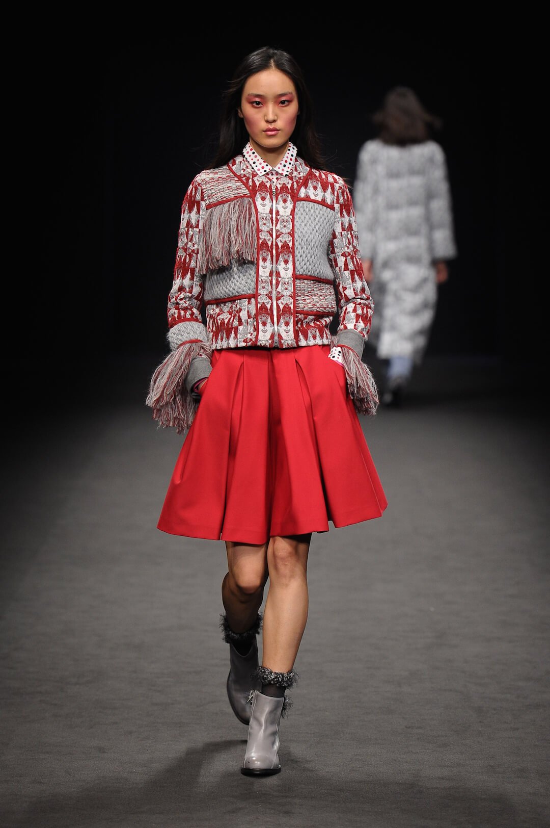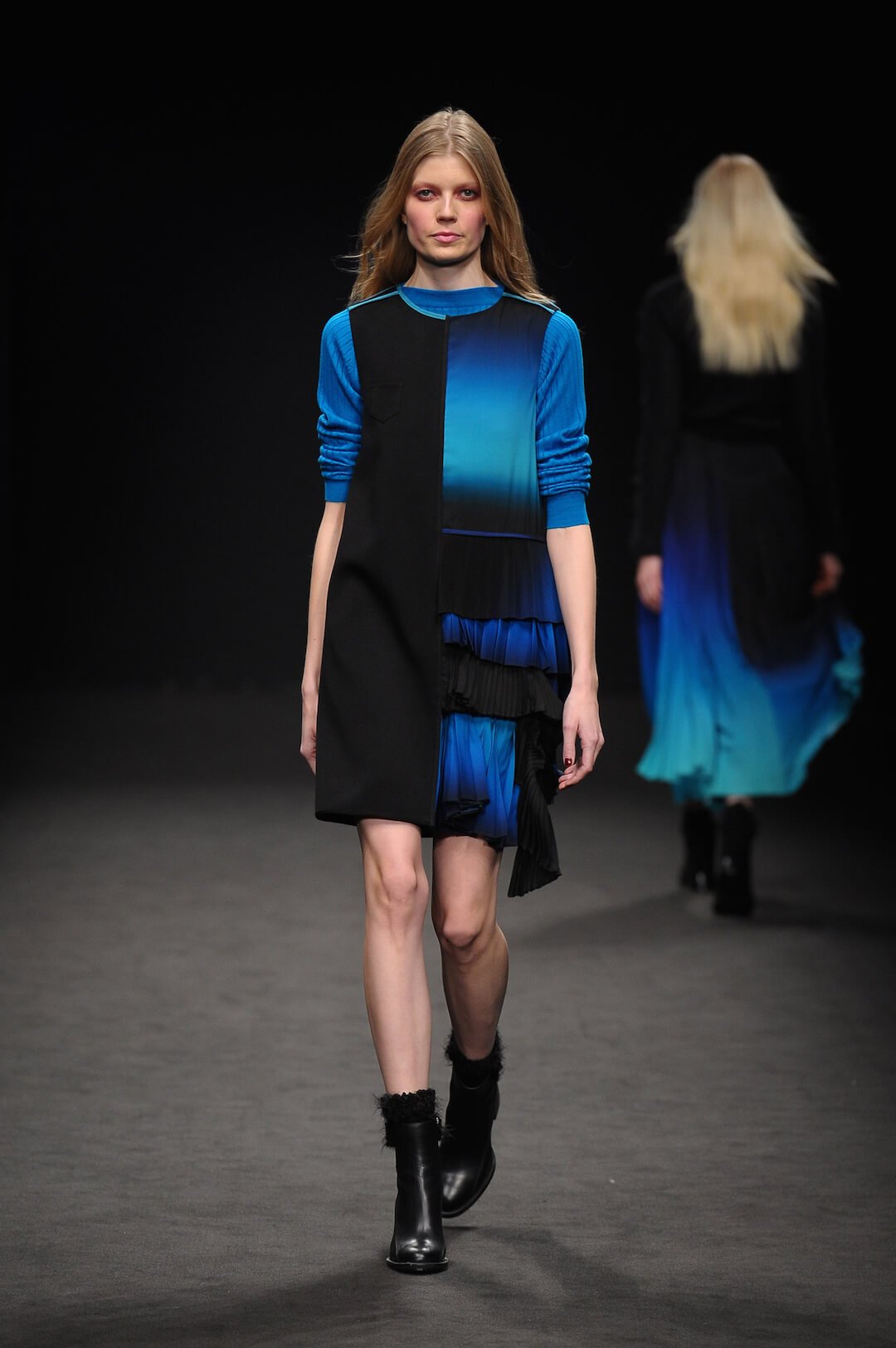 Alice in Flowerland. Thats the name of the Byblos newest collection and to quote from the show notes, “Alice 2.0 by Byblos Milano goes through the looking-class to experience a dream-line dimension filtered through artistic suggestions to create a unique floral couture style”. The result, a floral explosion in blue of three dimensional florals that explode all over baby doll dresses, like a field of bluebells in springtime. The sixties feel continues with devore a-line coats and shaggy crochet knits in a rich palette of autumnal hues giving the whole collection a slight free wheeling hippy vibe.