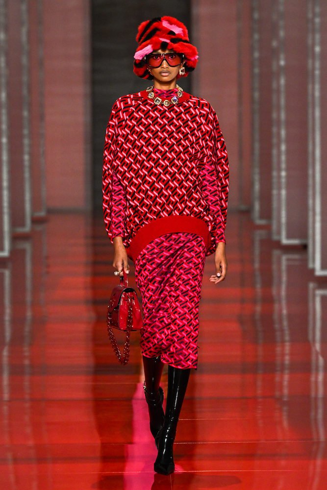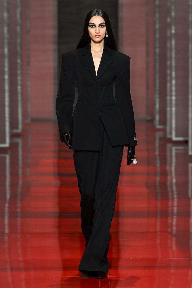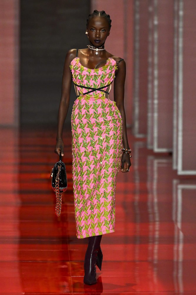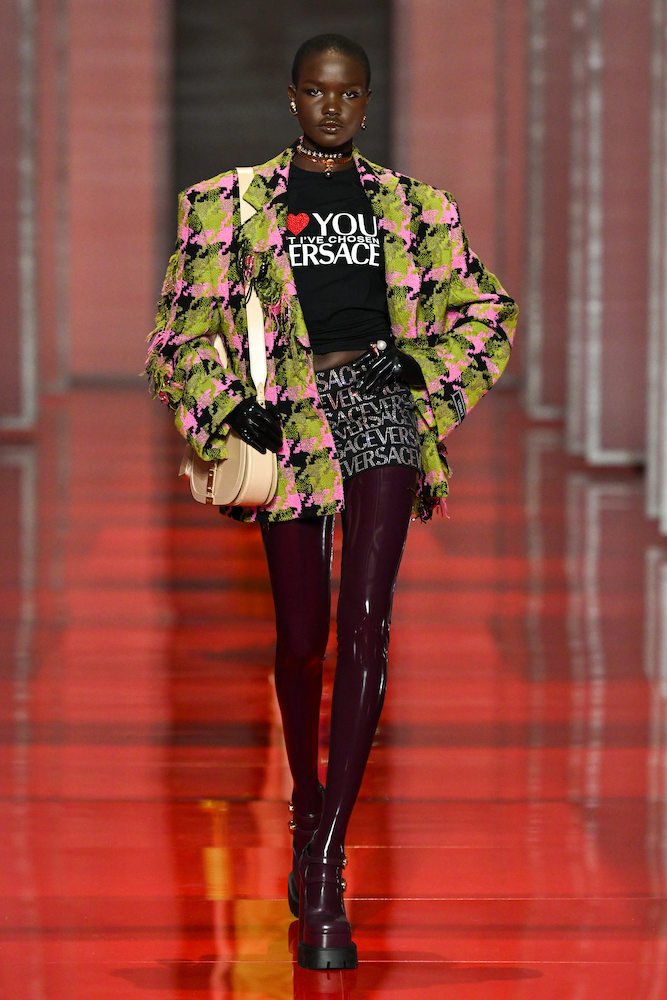 This was, as ever, Donatella’s love letter to women. “Never shy or retiring, the Versace woman for AW22 has a powerful and seductive sense of mystery…with unapologetic certainty, she fully owns her allure and knows exactly when to unleash her power”. Adut Akech, Precious Lee, Avanti Nagrath, Emily Ratajkowski and Gigi and Bella Hadid were out in force to do the unleashing in a casting that was representative of the brand’s “new-generation attitude,” with an emphasis on diversity, relayed Donatella. Joining the hot-house symphony of silhouettes, the designer also introduced a casual note. Coated denim, cropped puffa jackets and knit co-ords featuring the Greca motif joined this season’s Versace tee that stated: “I love you, but I’ve chosen Versace”. How apt.