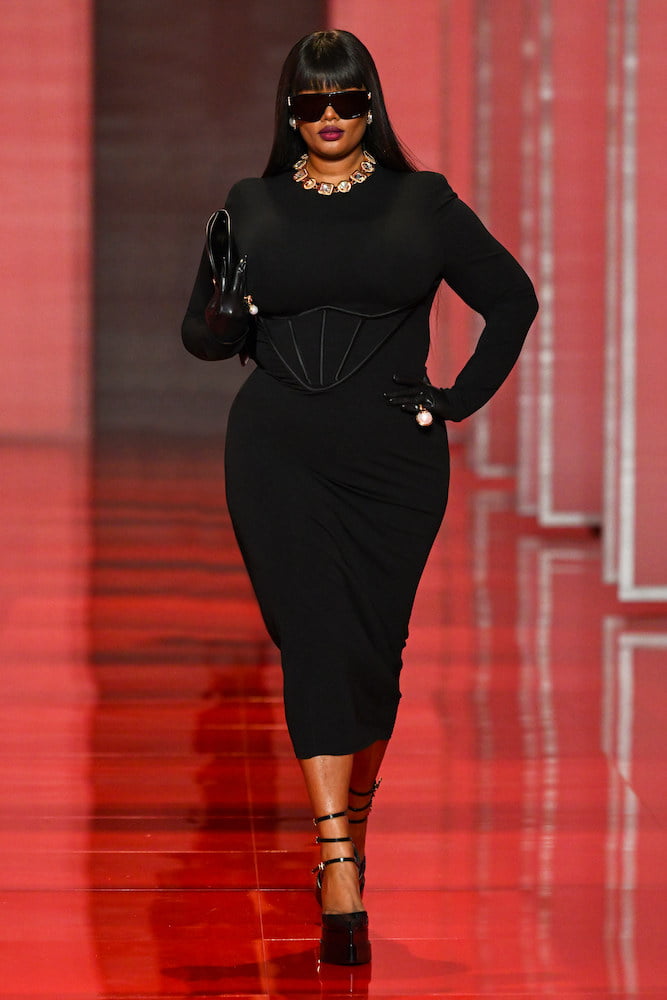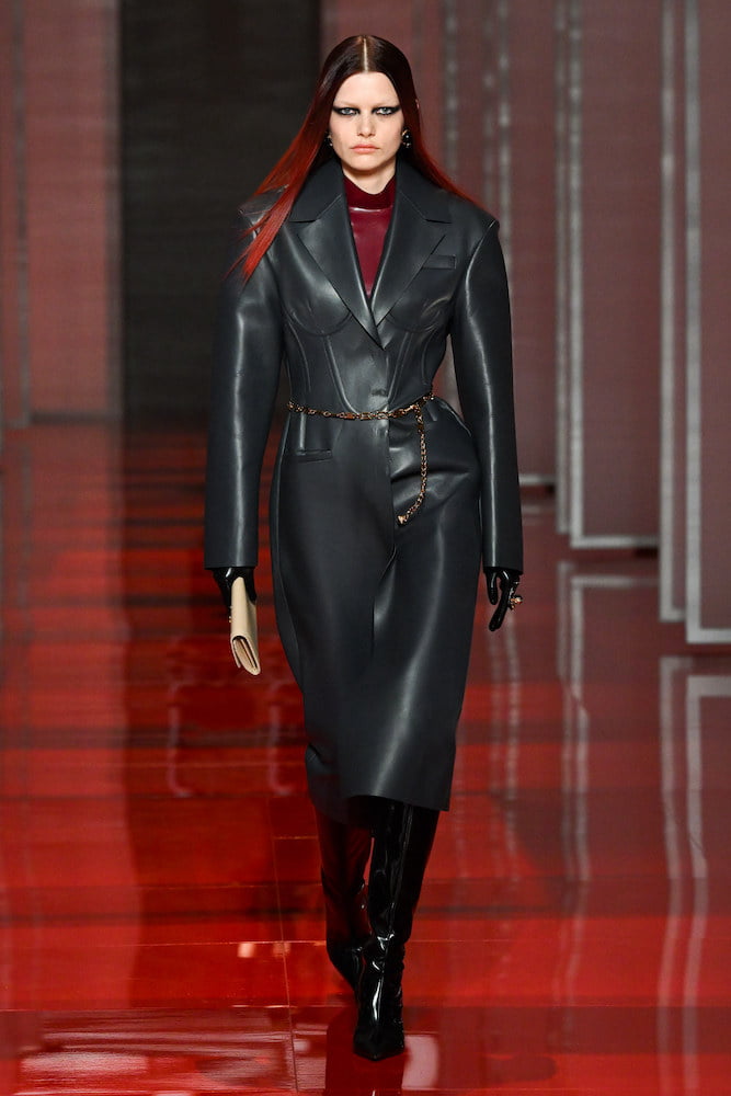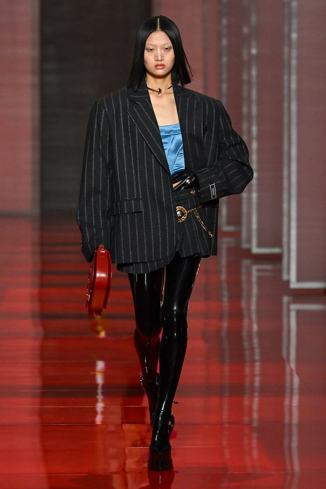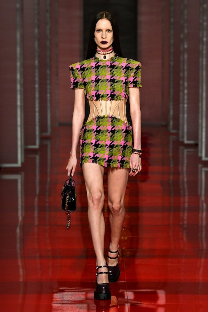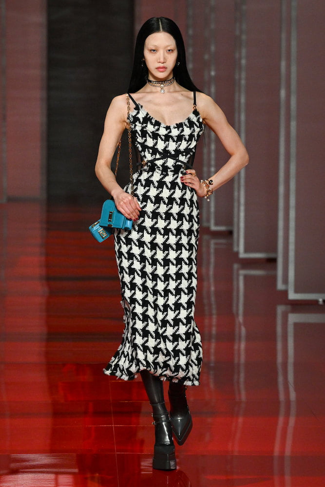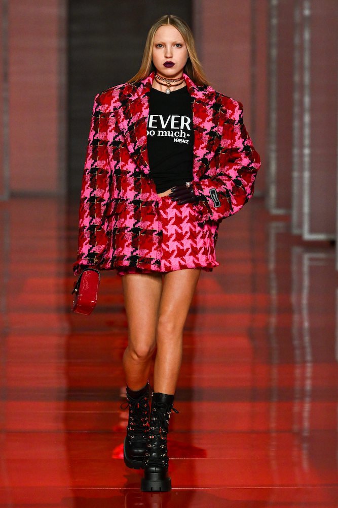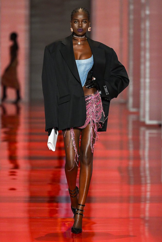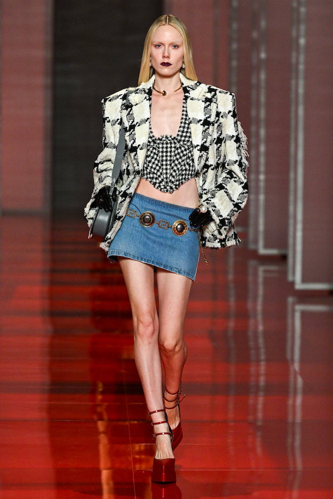 Donatella Versace isn’t anything if not a pioneer and rightfully reminded us on Friday night that she is, in fact, the queen of corsetry. A predominant trend at the Milan shows so far – see Fendi, Blumarine, Emporio Armani, No. 21 – “the unmistakable Atelier Versace bustier is at the collection’s core” read the show notes. From suiting to satin mini dresses, leather coats to LBDs, it featured in each of the 60 looks on display, reinvented in tweed, dogstooth, denim and silk, embellished with rhinestones and dripping with chains.