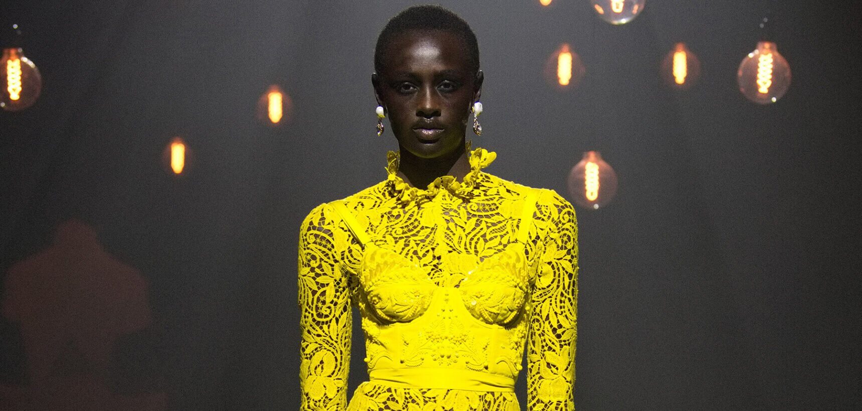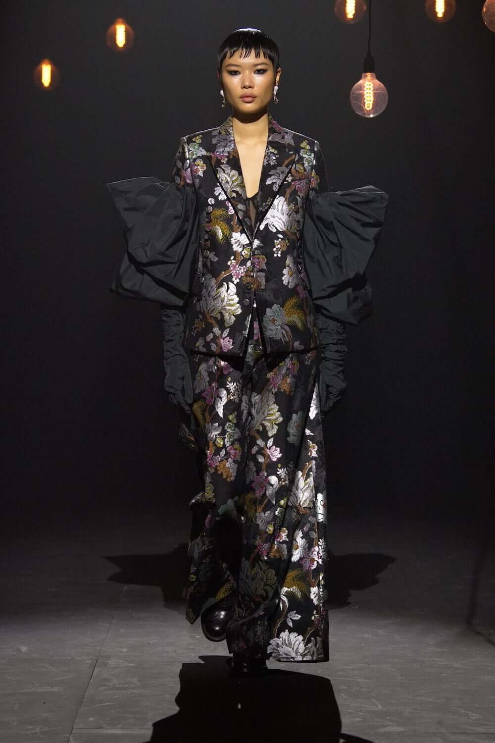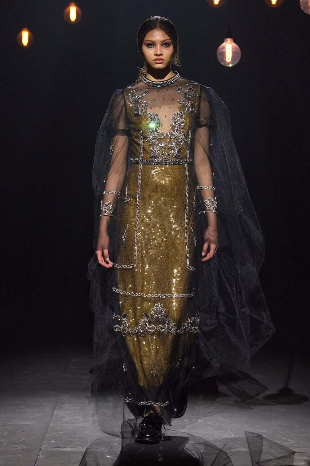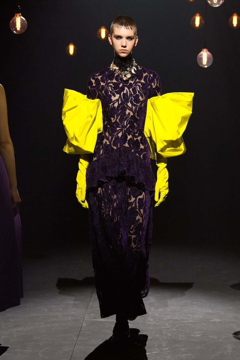 Are you in the mood for gothic Victoriana? Erdem is. He was Inspired by the renovations to his Bloomsbury townhouse which he discovered was a house for fallen women in the 19th Century. Peeling back the layers of arsenic green wallpaper he began to think about the lives lived there, discovering that by 1892, the house had been a sanctuary for 3216 women. With them in mind, he lavished his collection with jet beads (made fashionable by a mourning Queen Victoria, who sourced them from the Yorkshire town of Whitby, of Dracula fame). He played with Victorian silhouettes from flounced hems and full skirts, to ballooning leg-o-mutton sleeves which appeared on gowns and coats. The designer gave these historical elements a 21st-century twist by presenting his swagged, lace dresses and taffeta-sleeved overcoats in neon green and orange. rave-meets-romance? That would have had the old Queen reaching for her vapours.