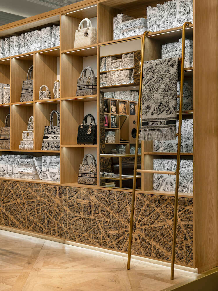 Start your journey by stepping into the City of Lights where a Parisian-inspired library is adorned by the Plan de Paris motif first introduced by Monsieur Dior via a scarf design in the 1950s. The same motif covers the iconic façade of the Harrod’s store, bringing the maison’s Parisian roots to London. A walk down memory lane, find famous streets of the French capital and the house’s iconic address 30 Avenue Montaigne mapped along the walls, floors and cabinets inside the space, as well as covering home goods and an entire wardrobe of bags, skirts, trenches, cardigans, jackets, dresses and even an umbrella.