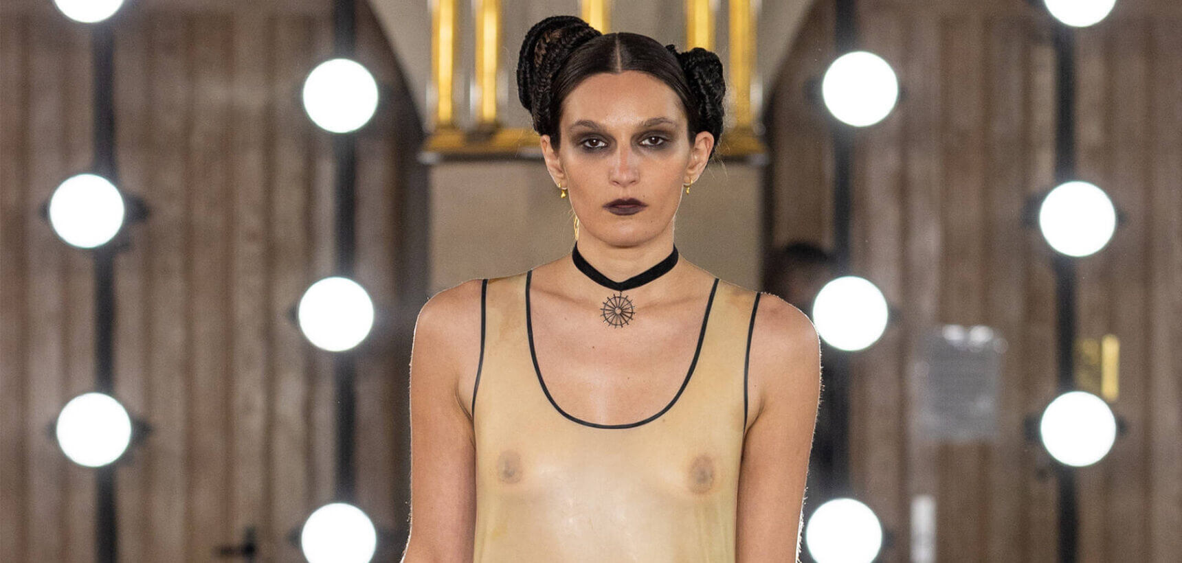 The last look out, was a lithesome gown that reminded everyone that Edward Crutchley’s opus has always been about sultry, uncannily queer codes of dress. Constructed from a nude-hued latex, its tiered skirt billowed and bounced with every step through the aisles of the church. Condom dresses for summer anyone?