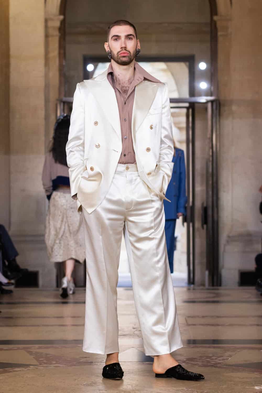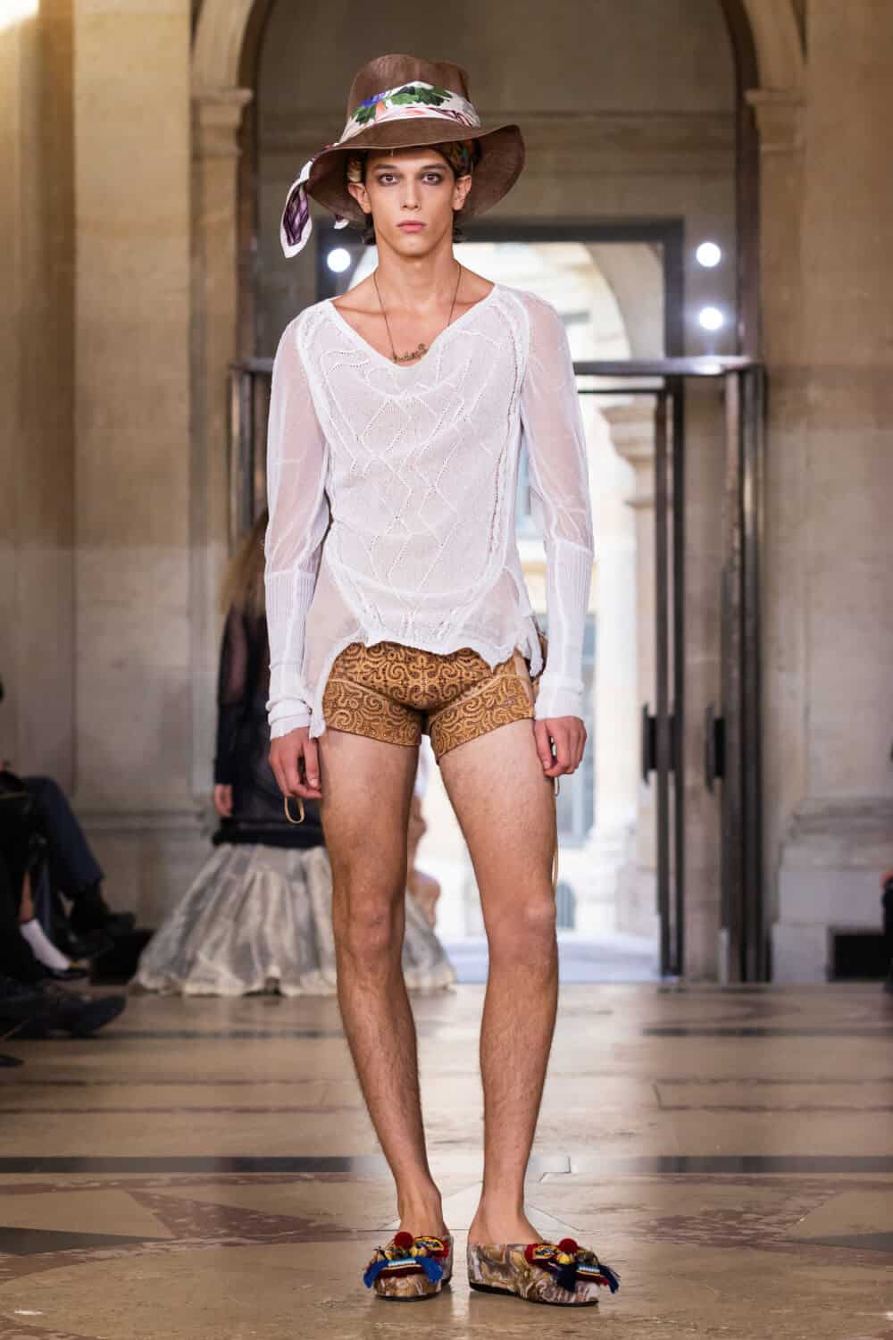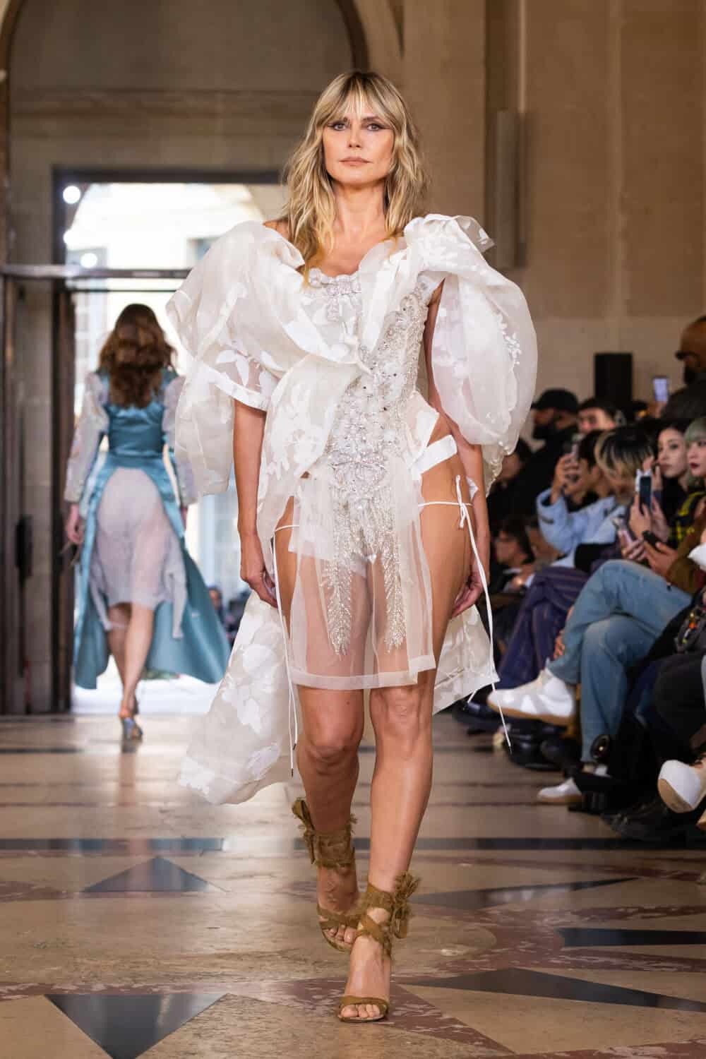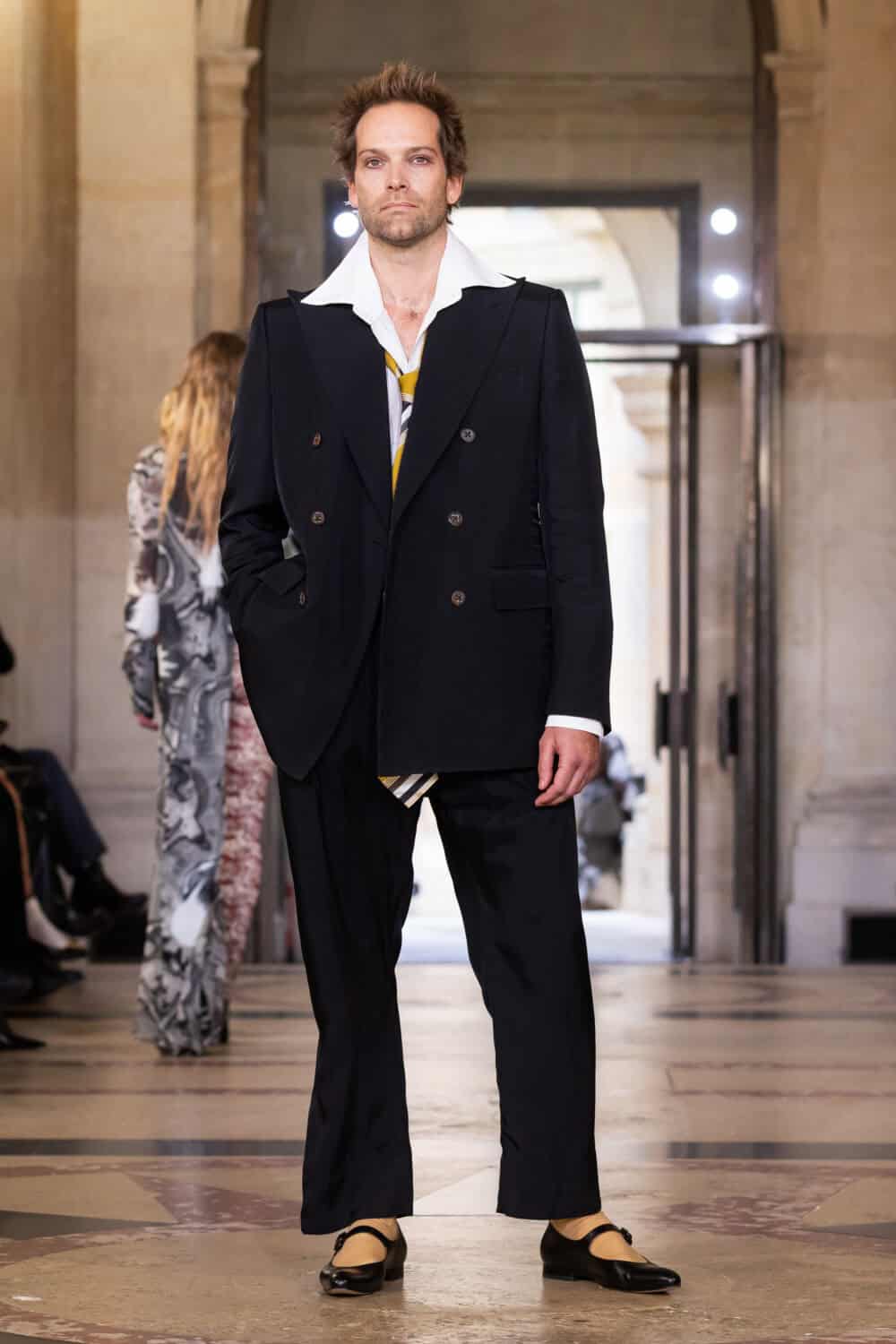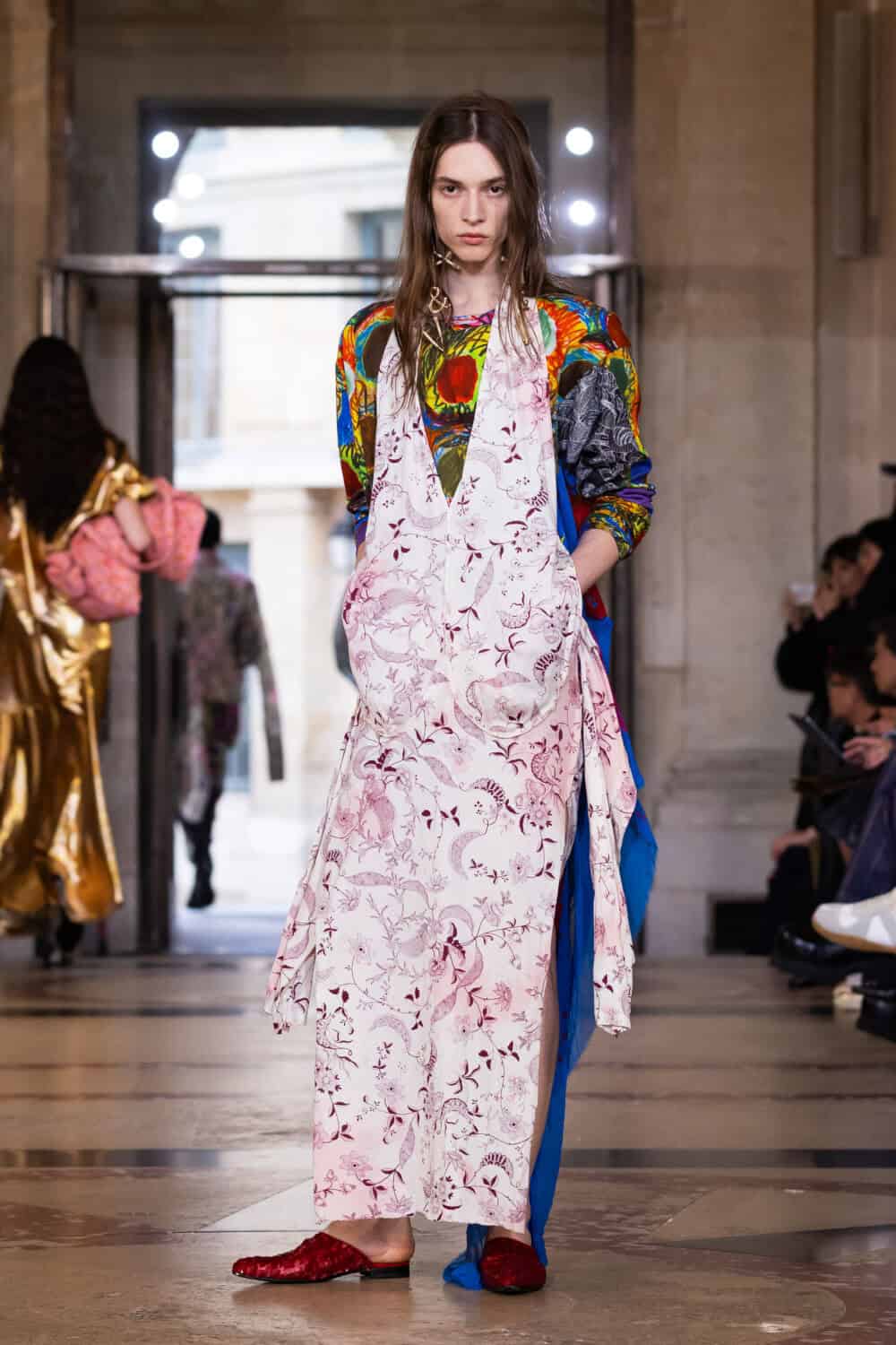 Staged inside L’Institut de France, his troupe of models came out in dresses made from lace, leather and loud prints on fabrics the designer had sourced rummaging through Italian markets. He had been studying old curtains which inspired the drape of many of his dresses, worn by the likes of Simonetta Gianfelici and Heidi Klum, who both made an epic return to the Westwood catwalk. While the gents donned easy-breezy suiting worn over unbuttoned shirts with Peter Pan collars, the women’s looks felt like the sort of pieces that could occupy your wardrobe for a lifetime. Those dresses you turn to time again that still look as great as the first time you put them on.