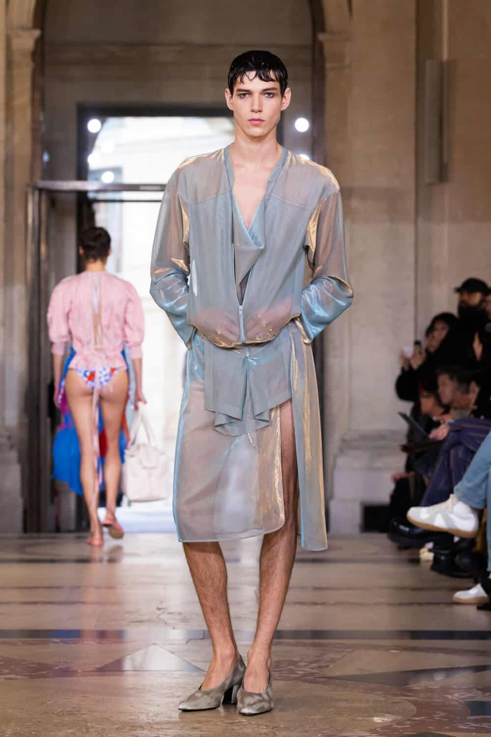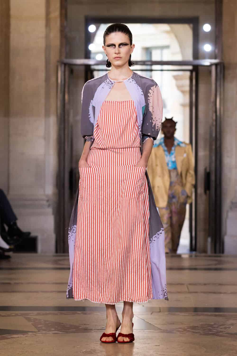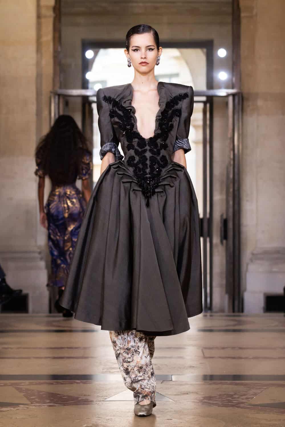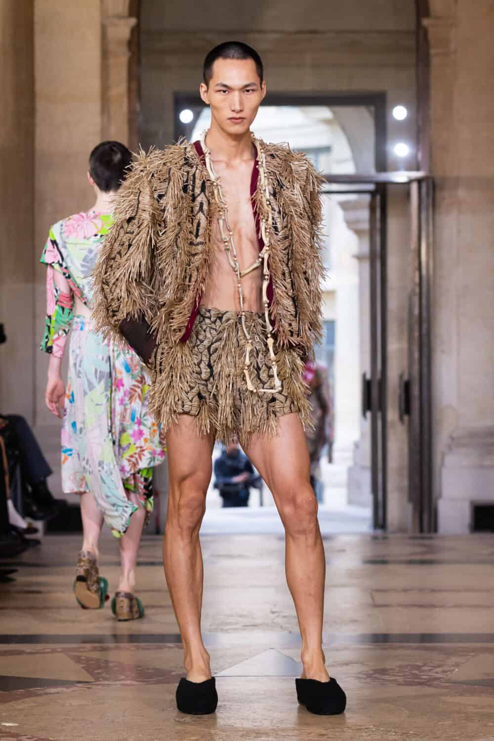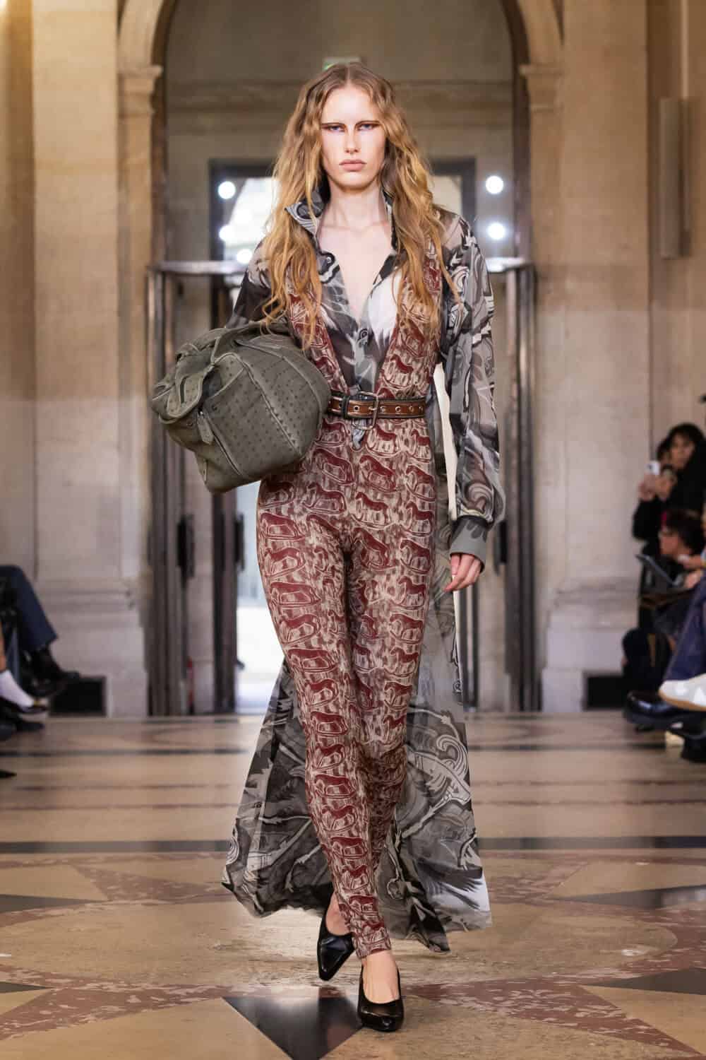 Staged inside L’Institut de France, his troupe of models came out in dresses made from lace, leather and loud prints on fabrics the designer had sourced rummaging through Italian markets. He had been studying old curtains which inspired the drape of many of his dresses, worn by the likes of Simonetta Gianfelici and Heidi Klum, who both made an epic return to the Westwood catwalk. While the gents donned easy-breezy suiting worn over unbuttoned shirts with Peter Pan collars, the women’s looks felt like the sort of pieces that could occupy your wardrobe for a lifetime. Those dresses you turn to time again that still look as great as the first time you put them on.