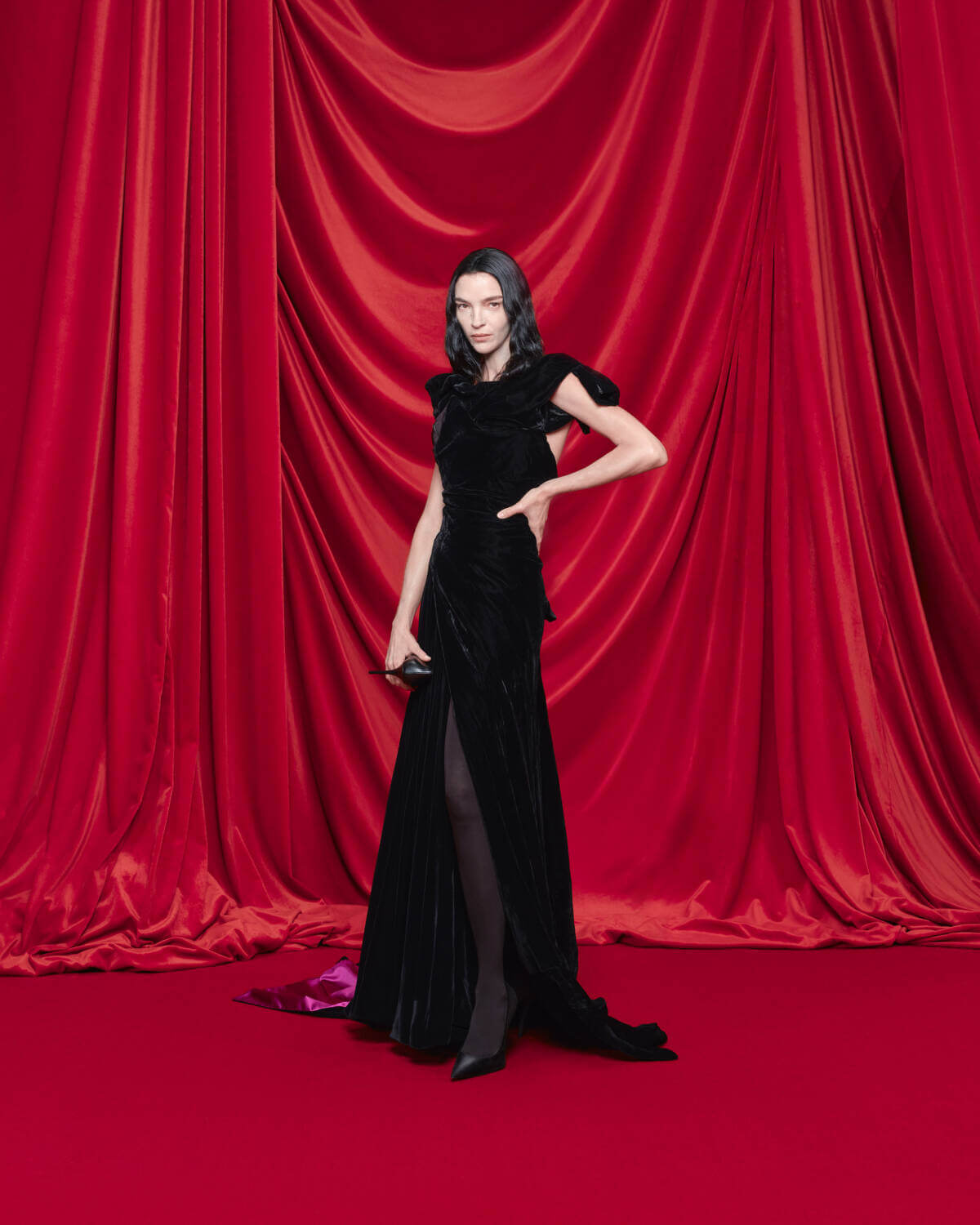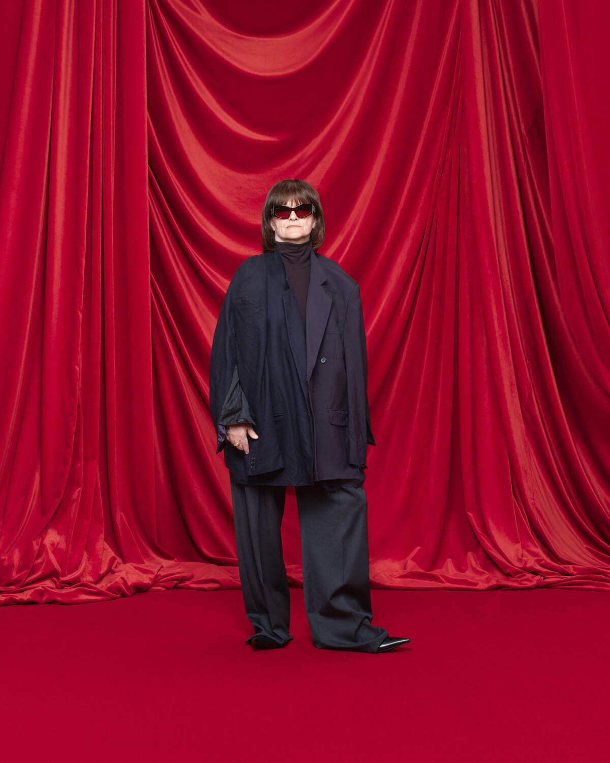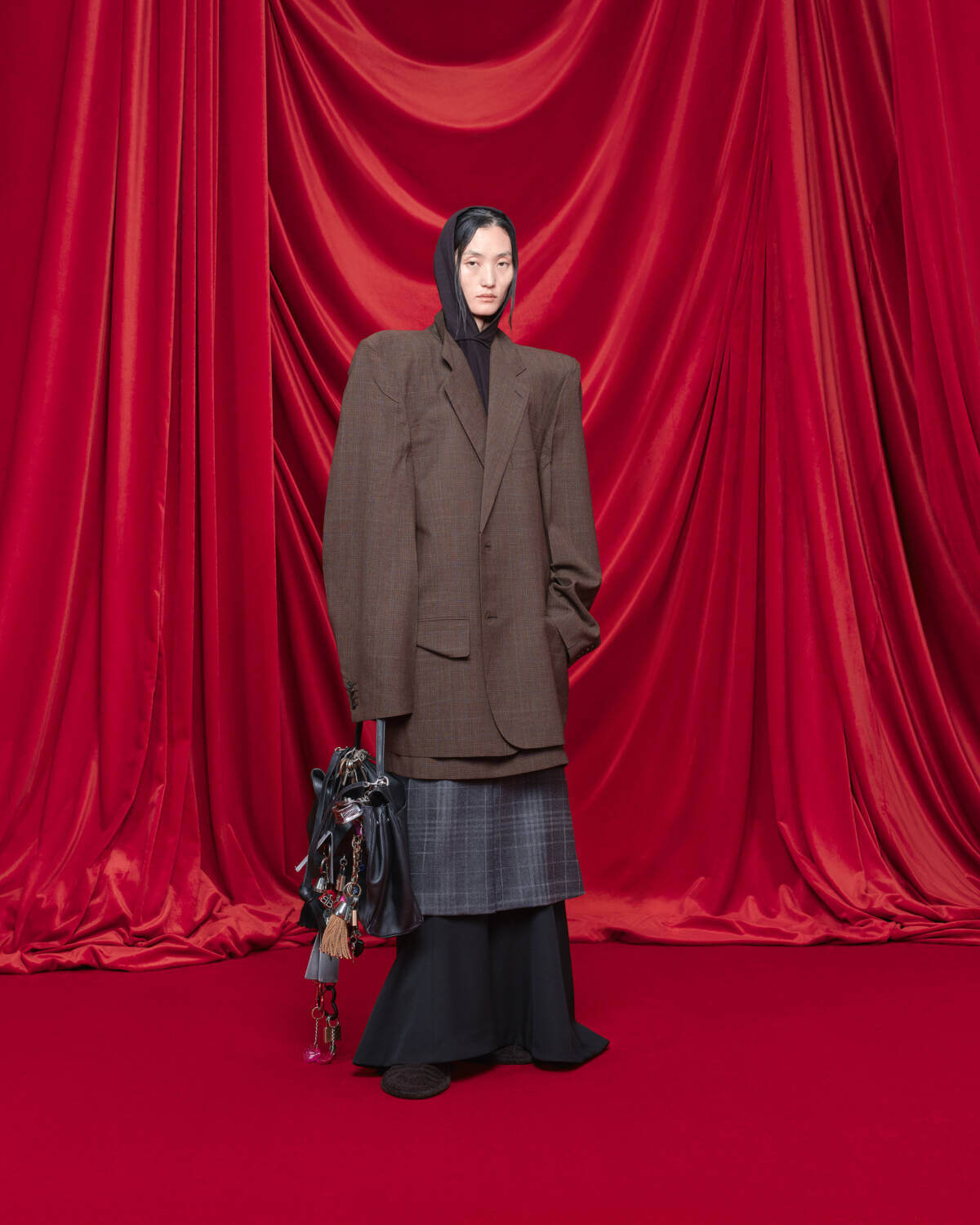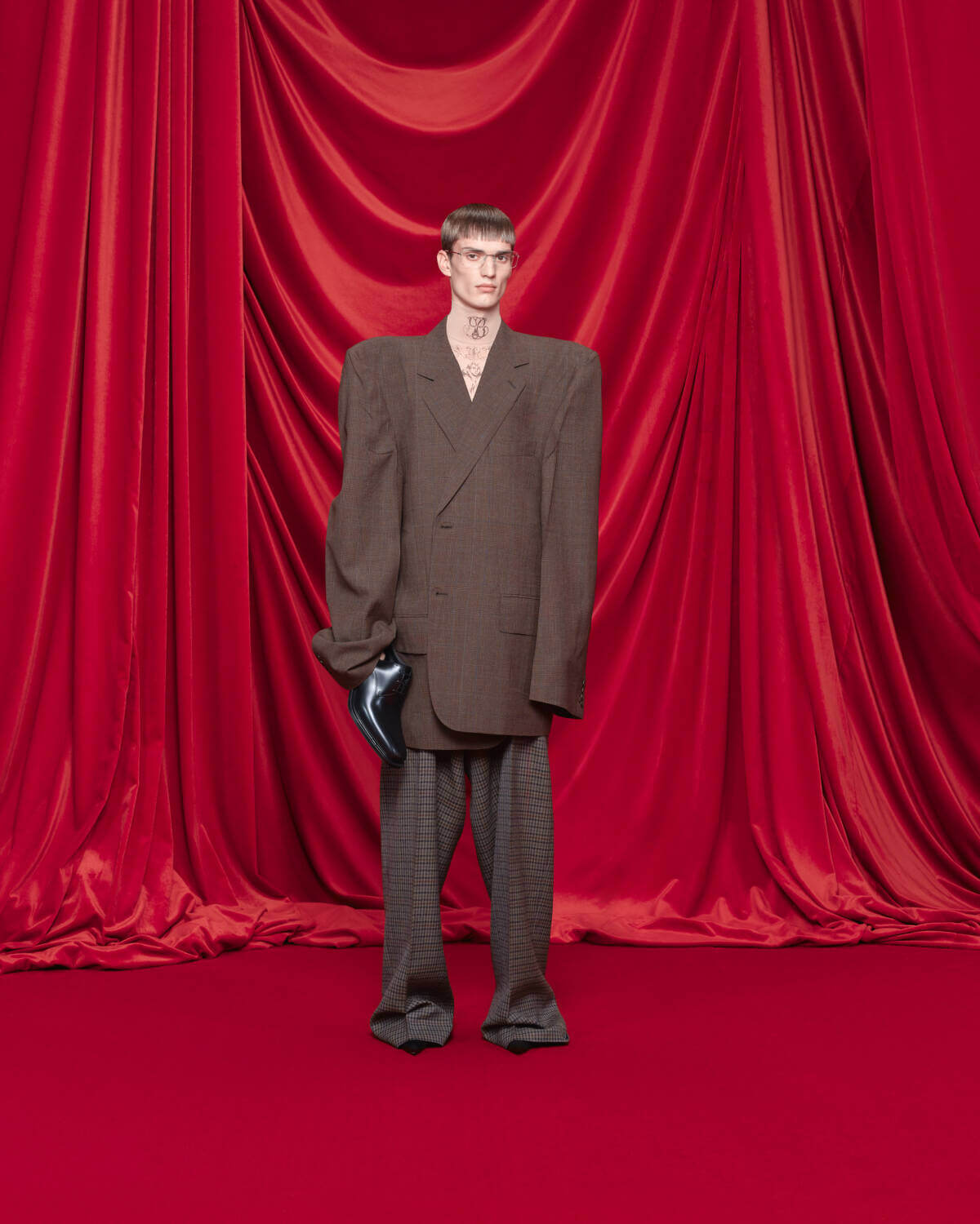 Inside a lush red velvet curtained theatre, the sombre, rich strings of BFRND’s (Demna’s husband) “Fugue in D Minor” played out. Accompanied by the ambassador of the house, Isabelle Huppert, over the soundtrack the actress recited instructions about how to make a tailored jacket. Demna’s mother Ella opened the show in a two-tone jacket. This was a personal collection dedicated to the ones closest to him and a reflection of his world and community – and what fashion is. This was pure Demna-core.