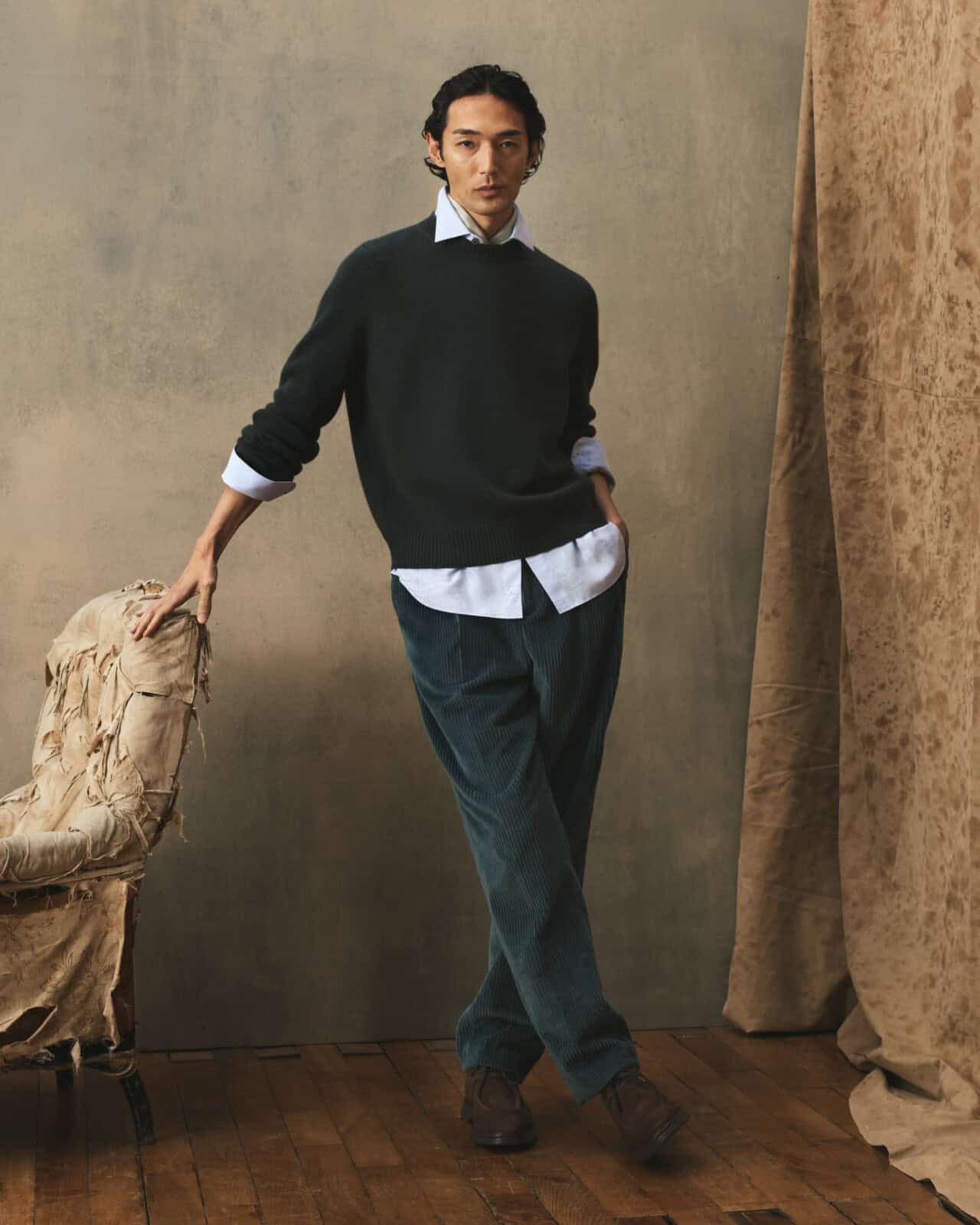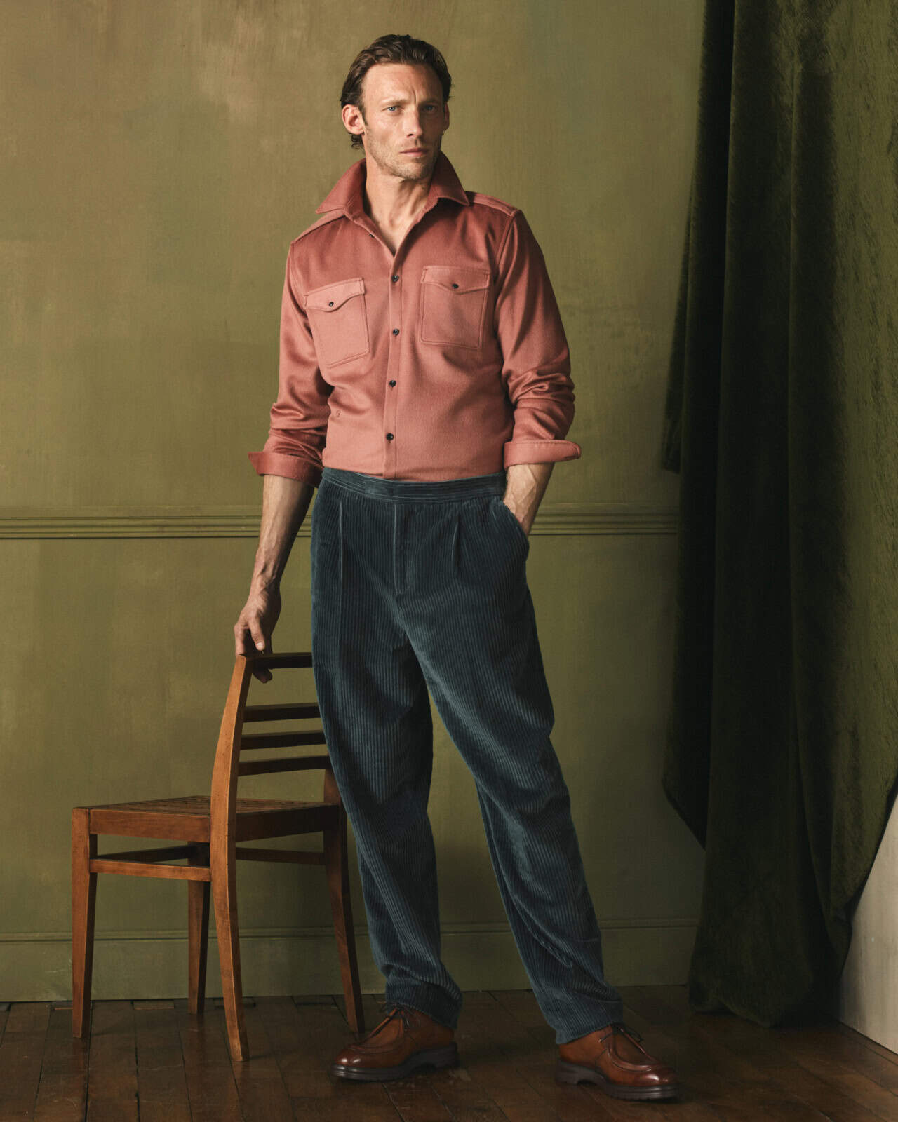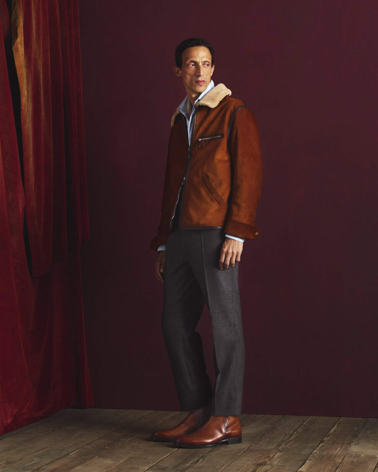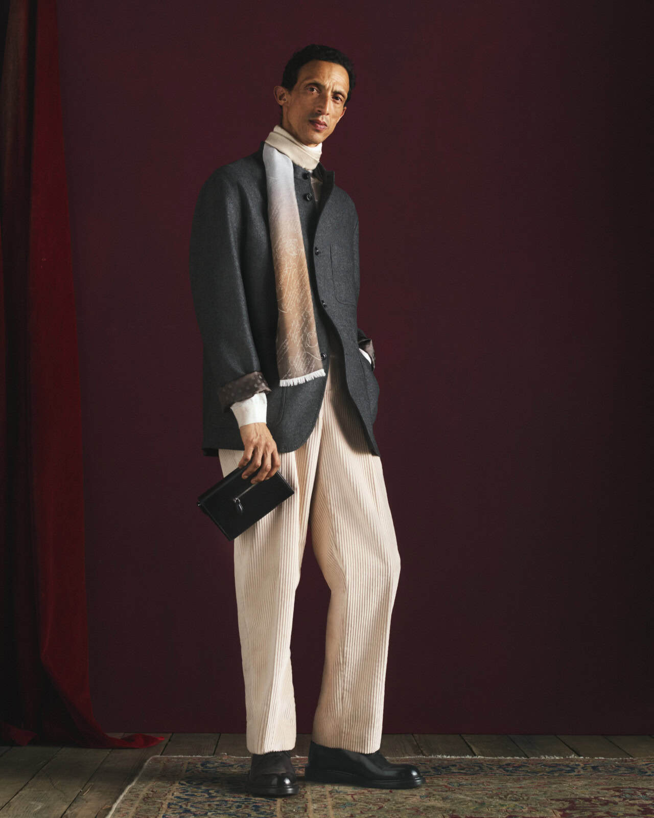 The ready-to-wear follows the same logic of ease meeting structure. Forestière jackets return as a key silhouette, this season expanded with the option of matching trousers, allowing for a more intentional, coordinated look. An anthracite stretch cashmere version, discreetly lined in polka-crest silk, shows Berluti at its best: formal but relaxed, detailed but not showy. Vintage pink cashmere offers a softer alternative, paired with burgundy and brown tailoring that feels considered rather than seasonal.