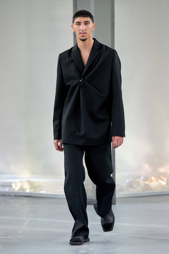 Presenting in Paris for a second season, the ANDAM Award-winner took summer suiting to new heights. Subtly skewed and mischievously intertwined, eccentric tailoring and slouchy trousers appeared in subdued hues while twinsets with reversible subtleties boasted barely-there contrasting tones. Reframing Saunders’ technical signatures, louche suits came in boxy silhouettes and temperamental textures – through swirling seams and twisted drapery manipulated with intent, nothing is as it seems.