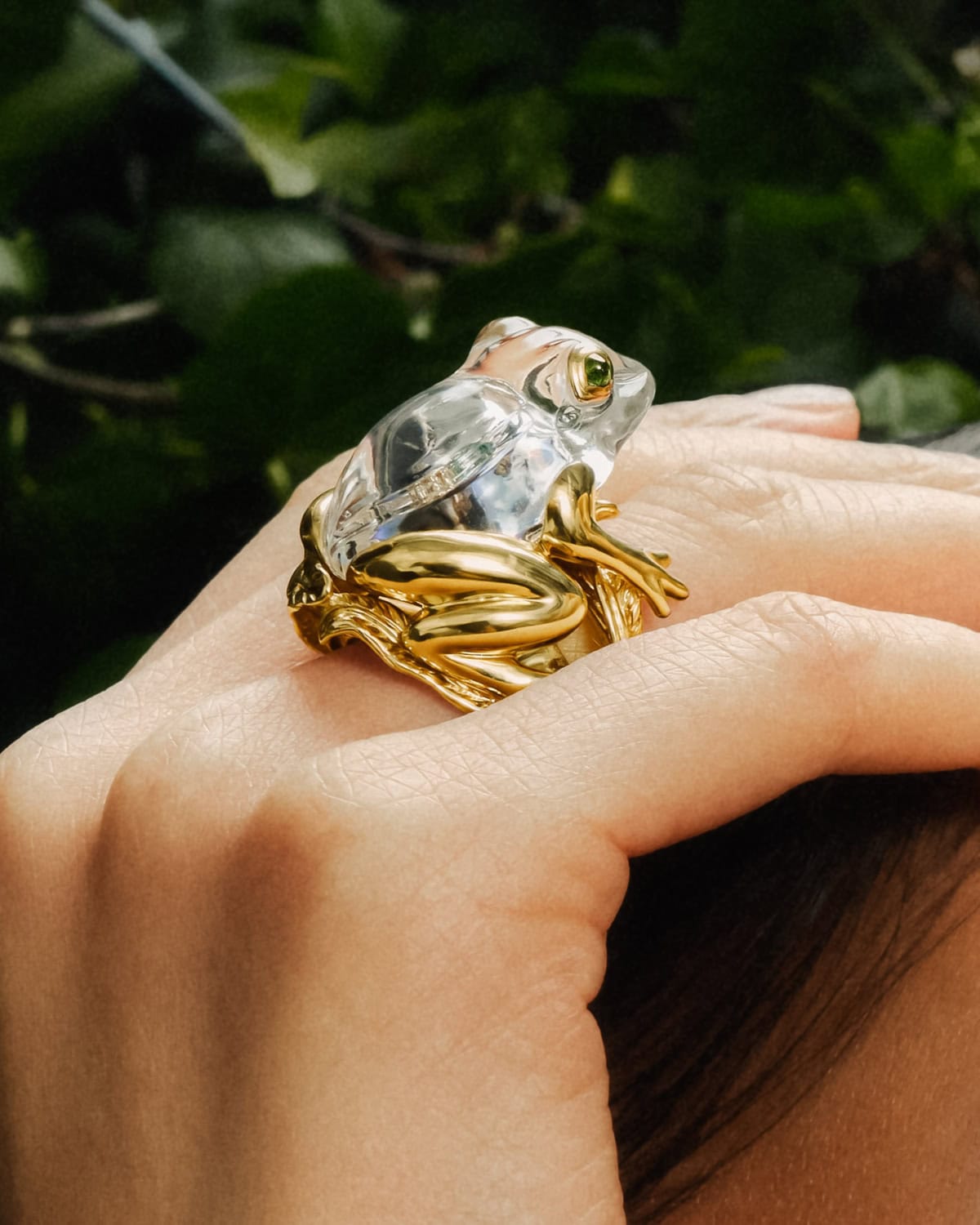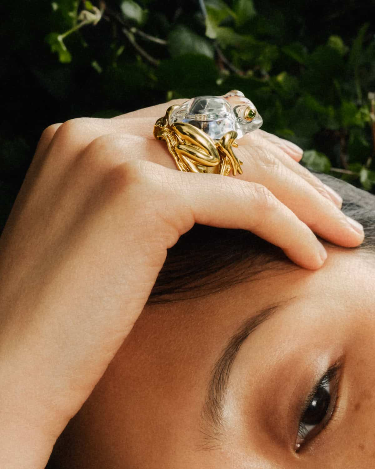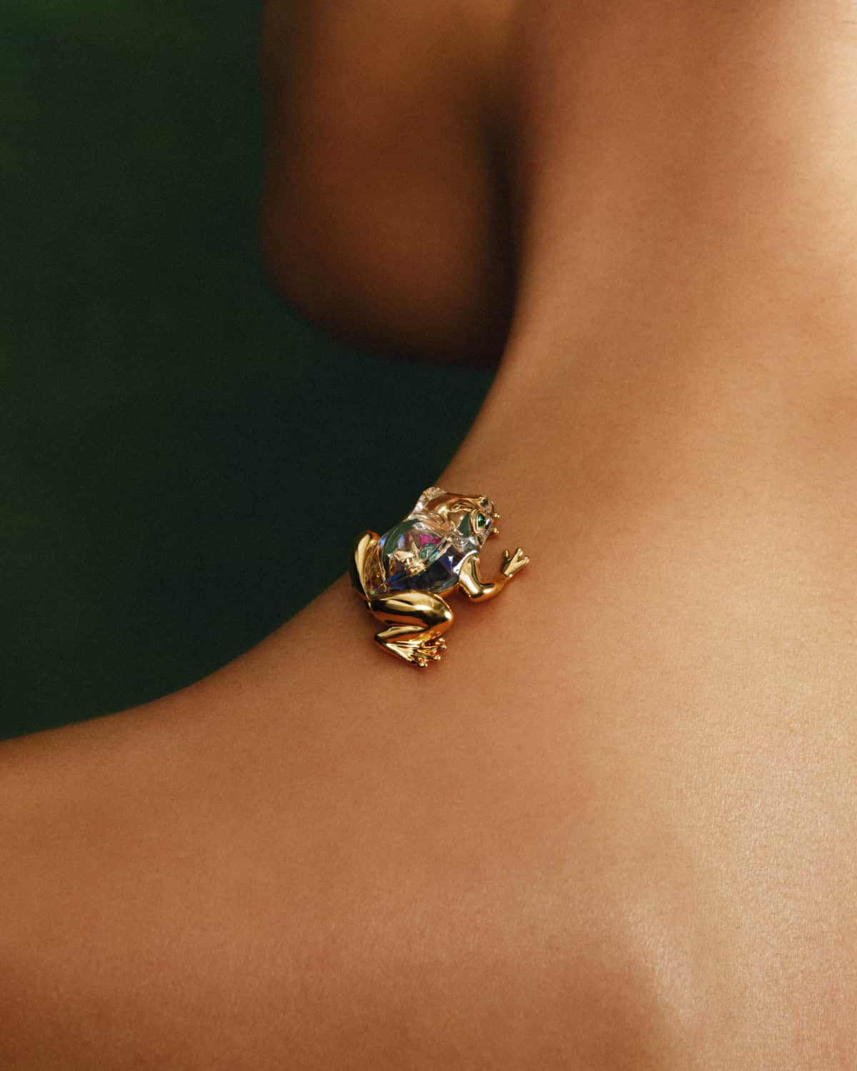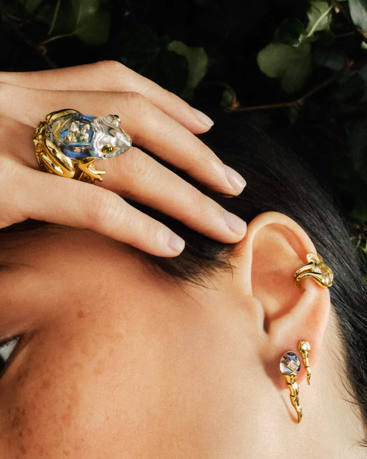 Rooted in sustainability within storytelling, her narrative-driven approach places the pieces within whimsical realms pulled from her memories of growing up in the English countryside. An enduring fascination with nature is translated into her use of motifs such as her current hero, the frog, featuring in her latest collection Enchanted Forest. The majestic creature emerges as symbolic protagonist of intuitive transformation. The artist has said of the amphibian, “it begins in water and ends on land. That metamorphosis feels deeply symbolic”, and she works to capture this transformation in her jewels.