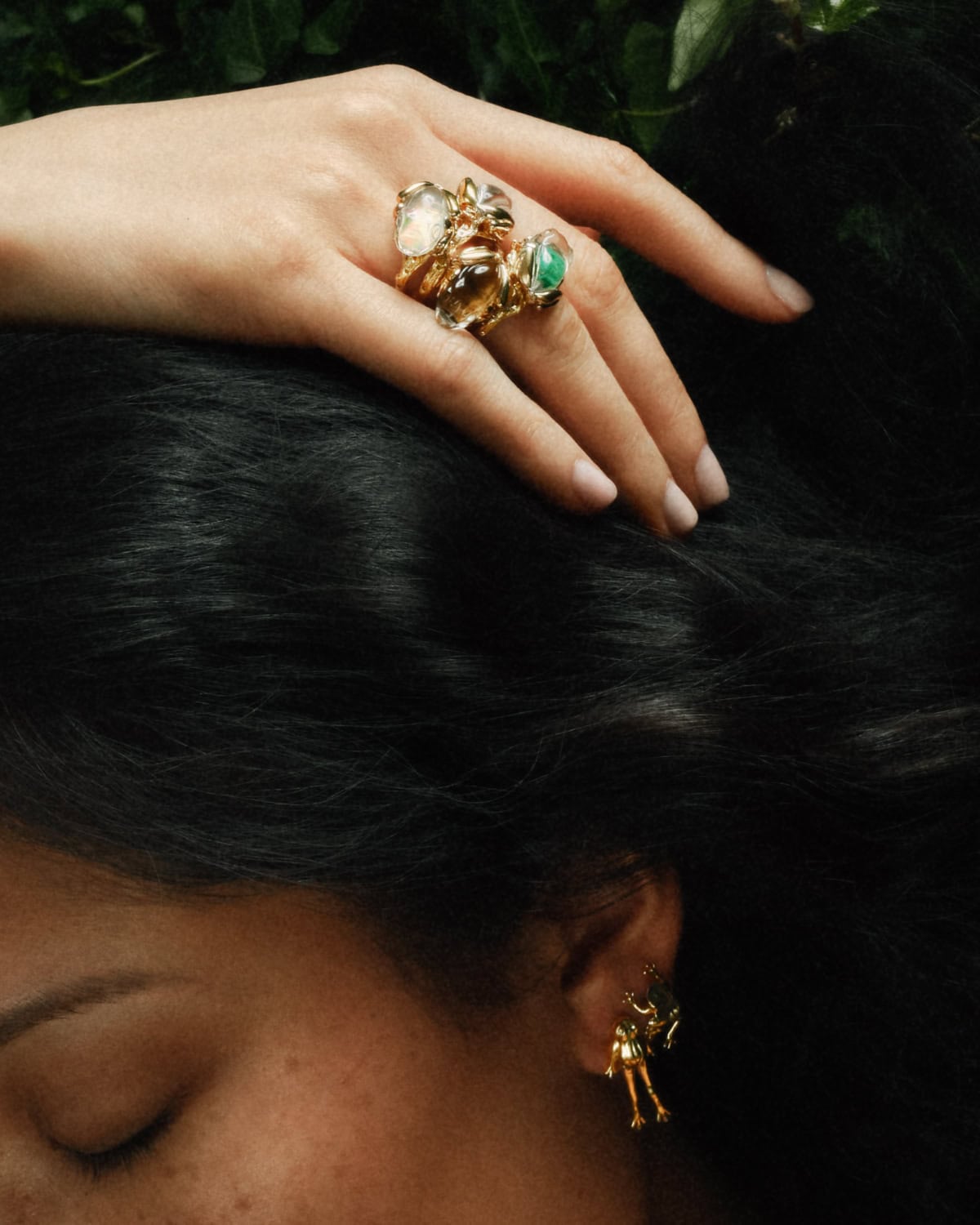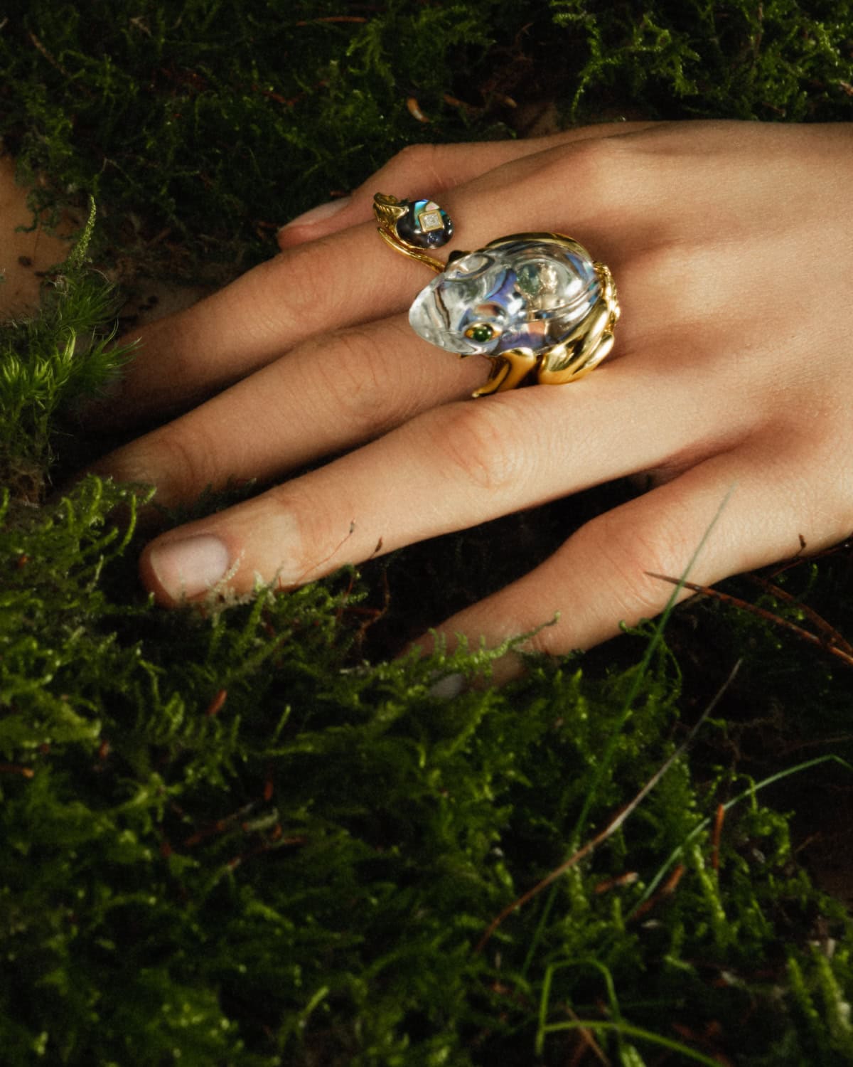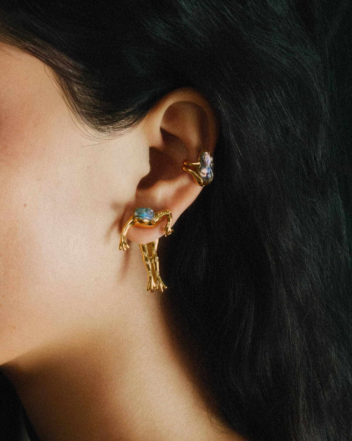 Rooted in sustainability within storytelling, her narrative-driven approach places the pieces within whimsical realms pulled from her memories of growing up in the English countryside. An enduring fascination with nature is translated into her use of motifs such as her current hero, the frog, featuring in her latest collection Enchanted Forest. The majestic creature emerges as symbolic protagonist of intuitive transformation. The artist has said of the amphibian, “it begins in water and ends on land. That metamorphosis feels deeply symbolic”, and she works to capture this transformation in her jewels.