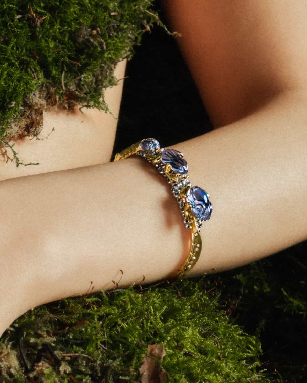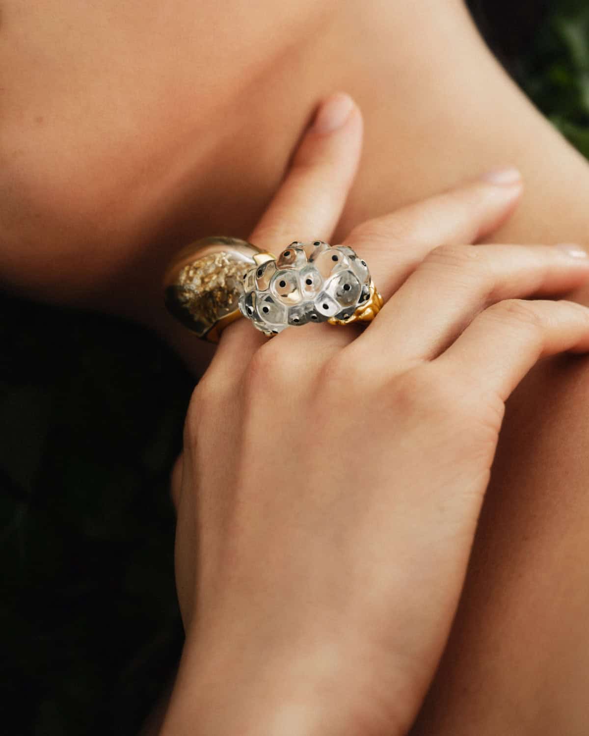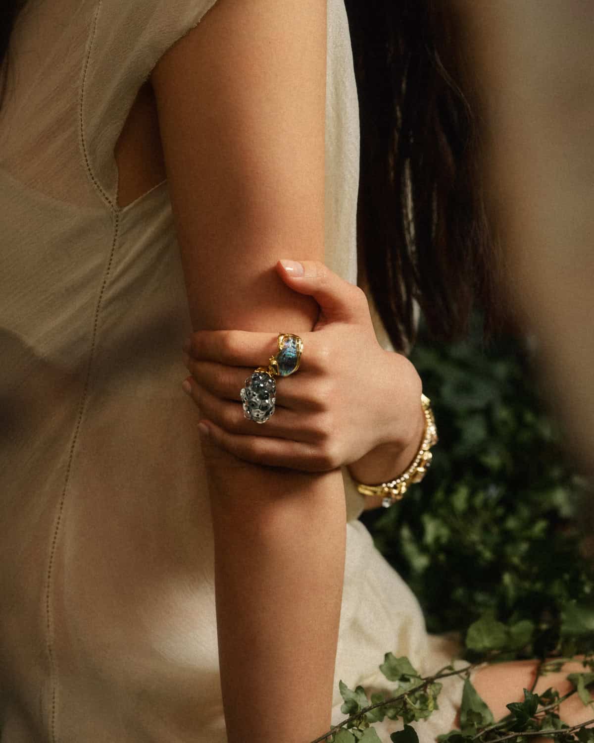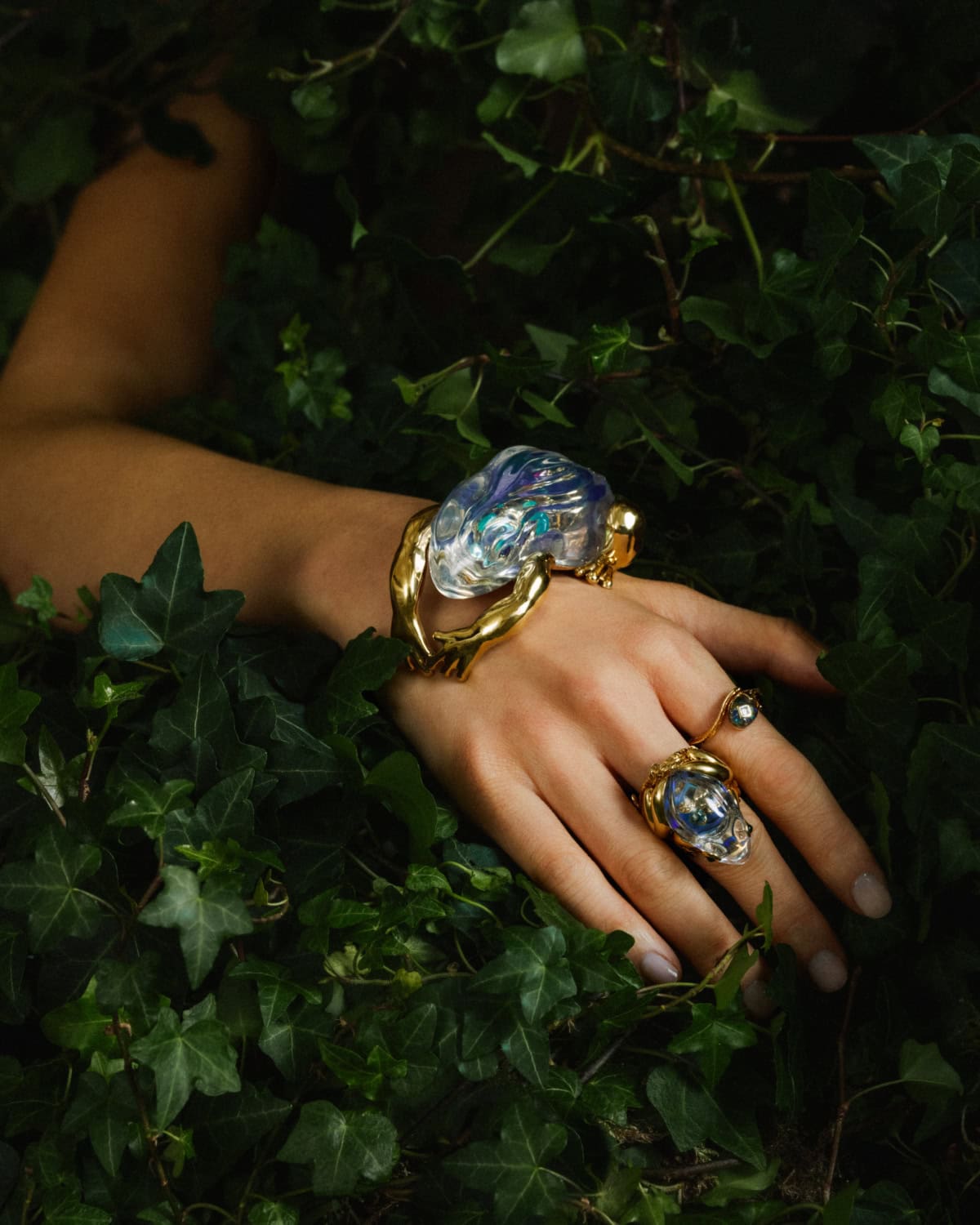 Rooted in sustainability within storytelling, her narrative-driven approach places the pieces within whimsical realms pulled from her memories of growing up in the English countryside. An enduring fascination with nature is translated into her use of motifs such as her current hero, the frog, featuring in her latest collection Enchanted Forest. The majestic creature emerges as symbolic protagonist of intuitive transformation. The artist has said of the amphibian, “it begins in water and ends on land. That metamorphosis feels deeply symbolic”, and she works to capture this transformation in her jewels.