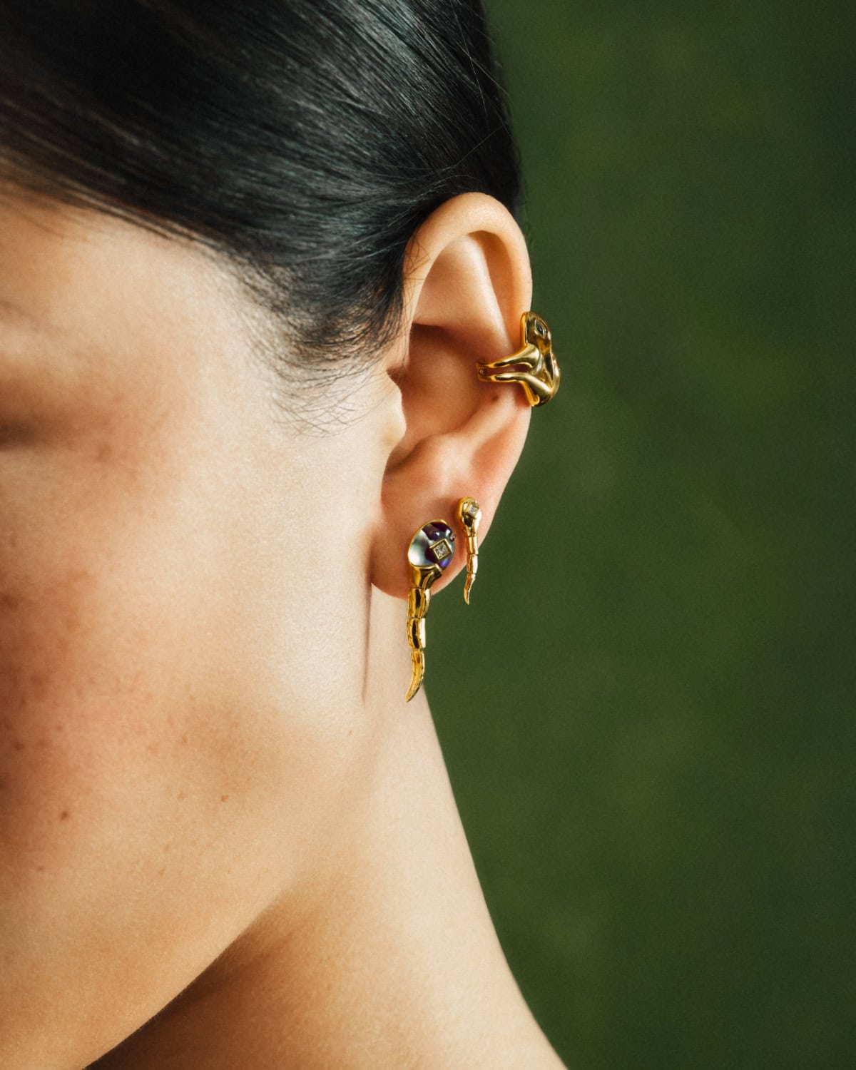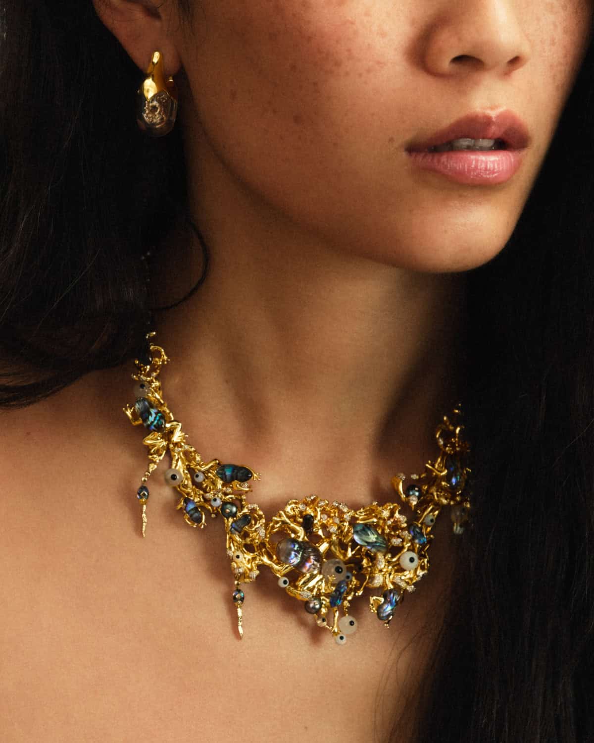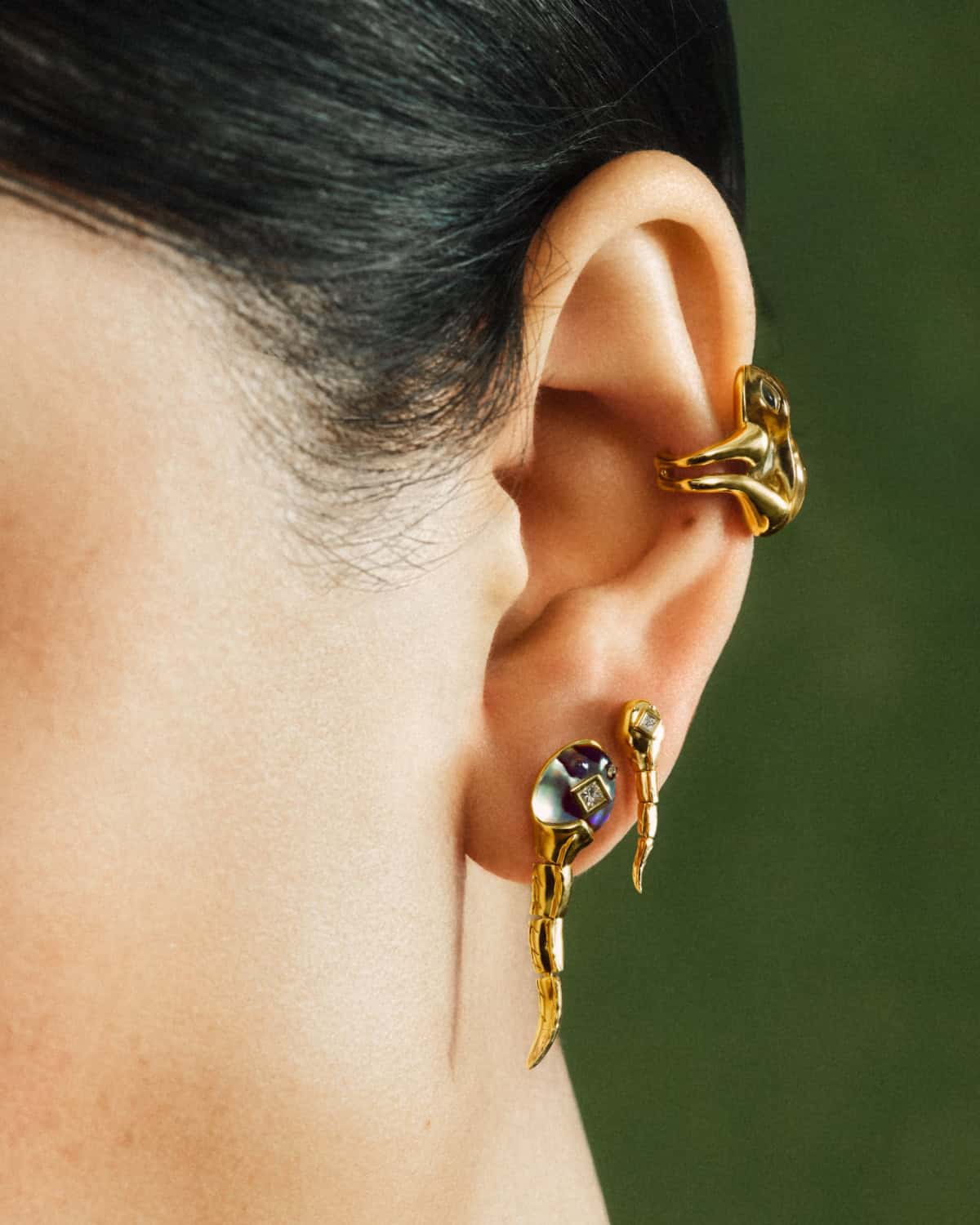 Van der Velden launched her eponymous brand in 2005 from her Amsterdam studio, where she continues to create pieces that sit at the intersection of wearable art and fine jewellery – fixating on the quiet magic and mystery of the natural world. Through dainty and statement necklaces, rings, bracelets and more, she hones in on her outdoorsy childhood – from building treehouses with her brothers to polishing her mother’s sculptures. This background in sculpture – from the influence of her mother, to her education at prestigious institutions including the Royal Academy of Art, The Hague – is incorporated into her architectural pieces. Having also studied fine art in Florence, and learning form through detailed anatomy classes, her jewellery-making would start as a side project. Her next steps were to study jewellery at Goldsmiths college where she became well-versed in the complex language of jewellery design and began working with designers at Amsterdam fashion week, adorning the runway.