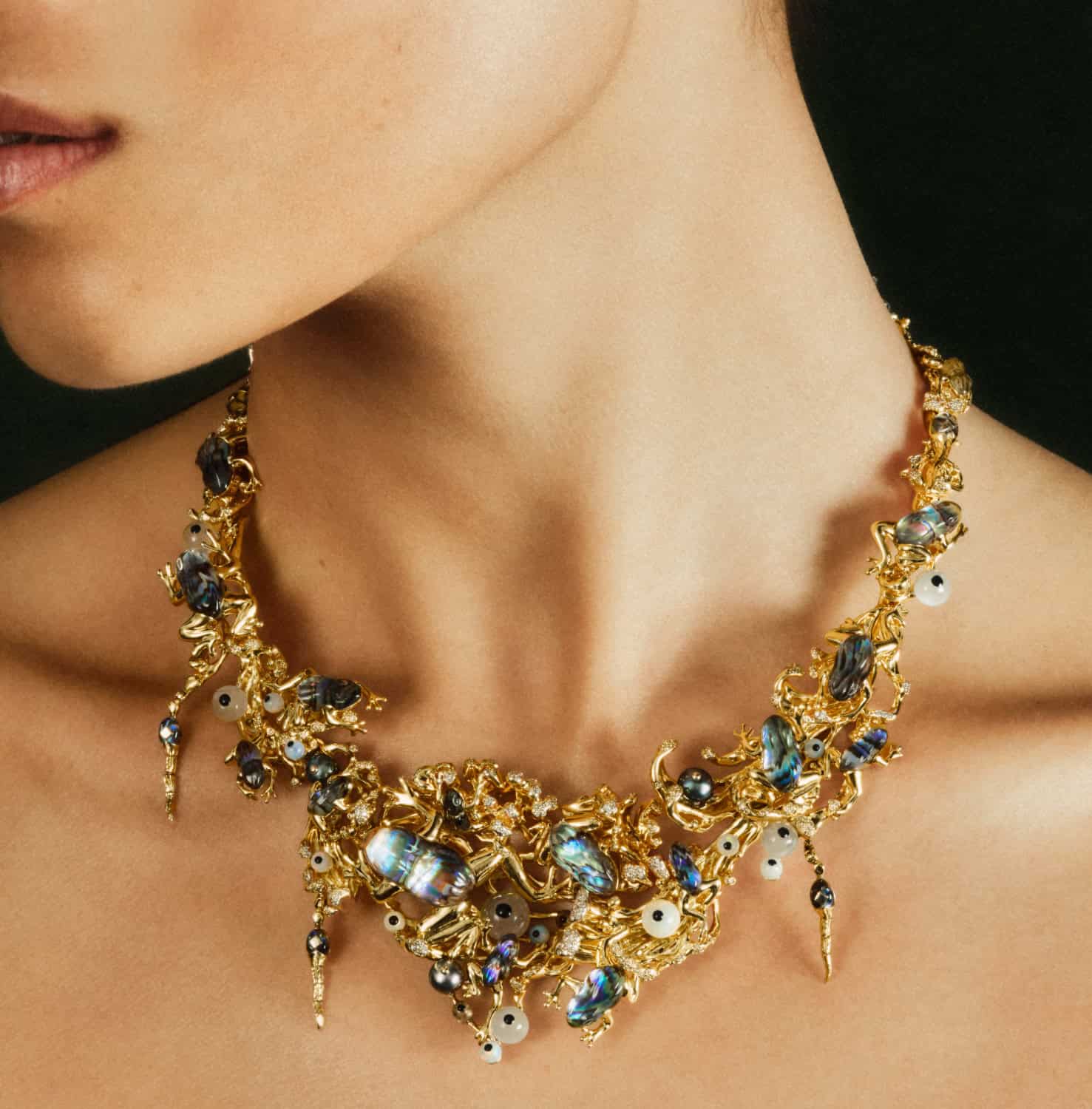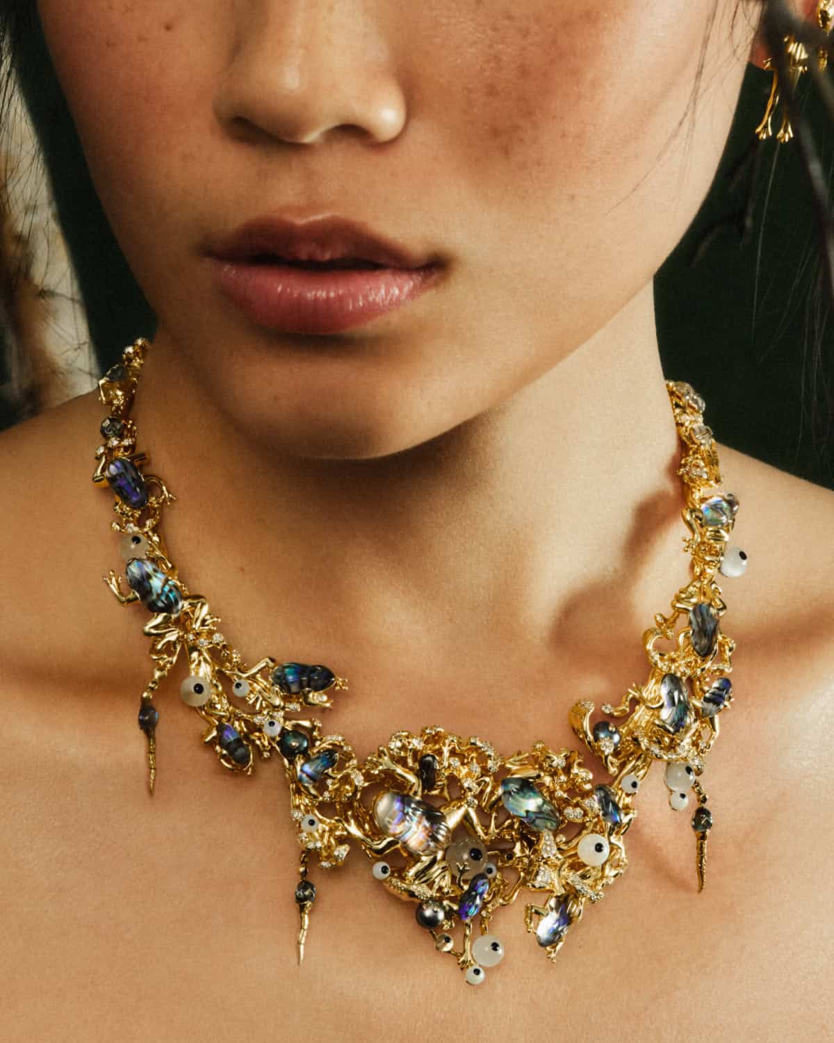 Picture this: foregrounding a wondrous backdrop of mossy green goodness, shed with pools of gleaming light, sit leaping gold frogs, scuttling scaled bugs and tree-bark reminiscent gemstones. Then, under the deep blue, live mermaids with tails of pearl and gold and transparent silvery jellyfish flutter beneath the surface. It sounds like an excerpt from an anthology of fairytales, right? Wrong. It’s actually the extraordinary world of Dutch jewellery designer Bibi van der Velden