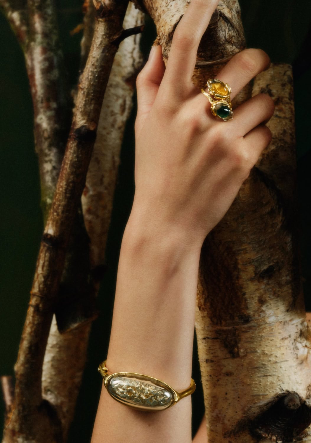 Strong in their technical precision and detailing – van der Velden’s materials of choice range from abalone, opal, malachite, rock crystal and diamonds, all wrapped with 18k recycled gold, of course. Balancing her specialist fine jewellery with high jewellery collector pieces, van der Velden uses Enchanted Forest as a tool for escapism but also a world of grounded balance; through the outlet of earrings, rings, necklaces, bangles and brooches. Mini frog studs, frog abalone ear huggers, hanging earrings and necklaces including a large frog necklace set on a tadpole chain. Both stackable and statement rings feature amongst Tadpole-to-Frog bangles, which arguably highlight the cultivated essence of this collection the most. Enchanted Forest flaunts the designers’ latest advancements in rock crystal carving, which proves a great challenge in its construction but offers a great reward in its outcome; jewellery that flirts with transformative dynamicity.