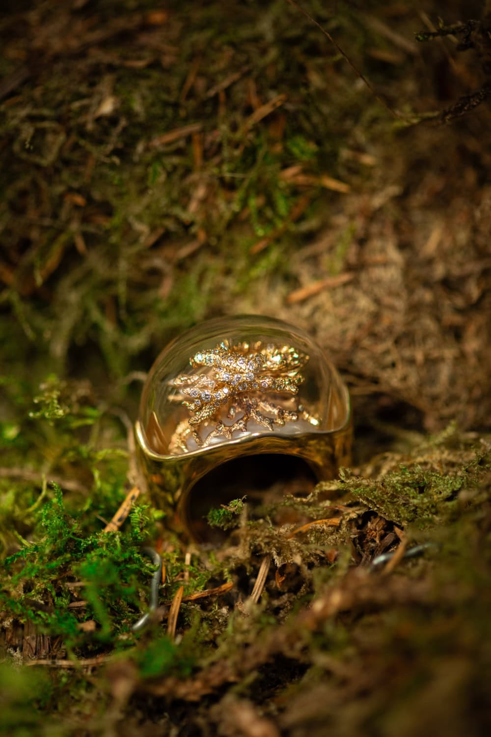 The terrarium pieces within the Enchanted Forest collection are a particularly clear expression of that. They allow me to fully explore my sculptural language within fine jewellery – miniature landscapes where trees and root systems are cast in yellow gold, set with pavé diamonds, grounded by a mother-of-pearl forest floor and enclosed within carved rock crystal. They feel like self-contained worlds – true explorations of form, material and imagination.