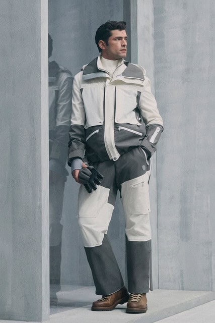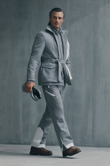 Titled Ars Imitatur Naturam, the collection positioned nature not as a theme but as a guiding principle. Softly structured blazers refined the silhouette, paired with ties that brought formality back into focus alongside garment-dyed trousers with cargo and utility pockets. Outerwear was central, from double-breasted coats finished with metal buttons to technical fabrics treated with a sartorial hand. The range was broad and assured, moving easily from relaxed cargos and knit-led daywear to evening tuxedo looks and fully realised snow-sport silhouettes. A palette of deep neutrals and saturated tones underscored the season, while tweeds and Donegal were reworked in lighter constructions. Shearling and suede appeared throughout, grounding the collection in tactility, while textured cardigans and patterned knitwear anchored looks with quiet confidence.