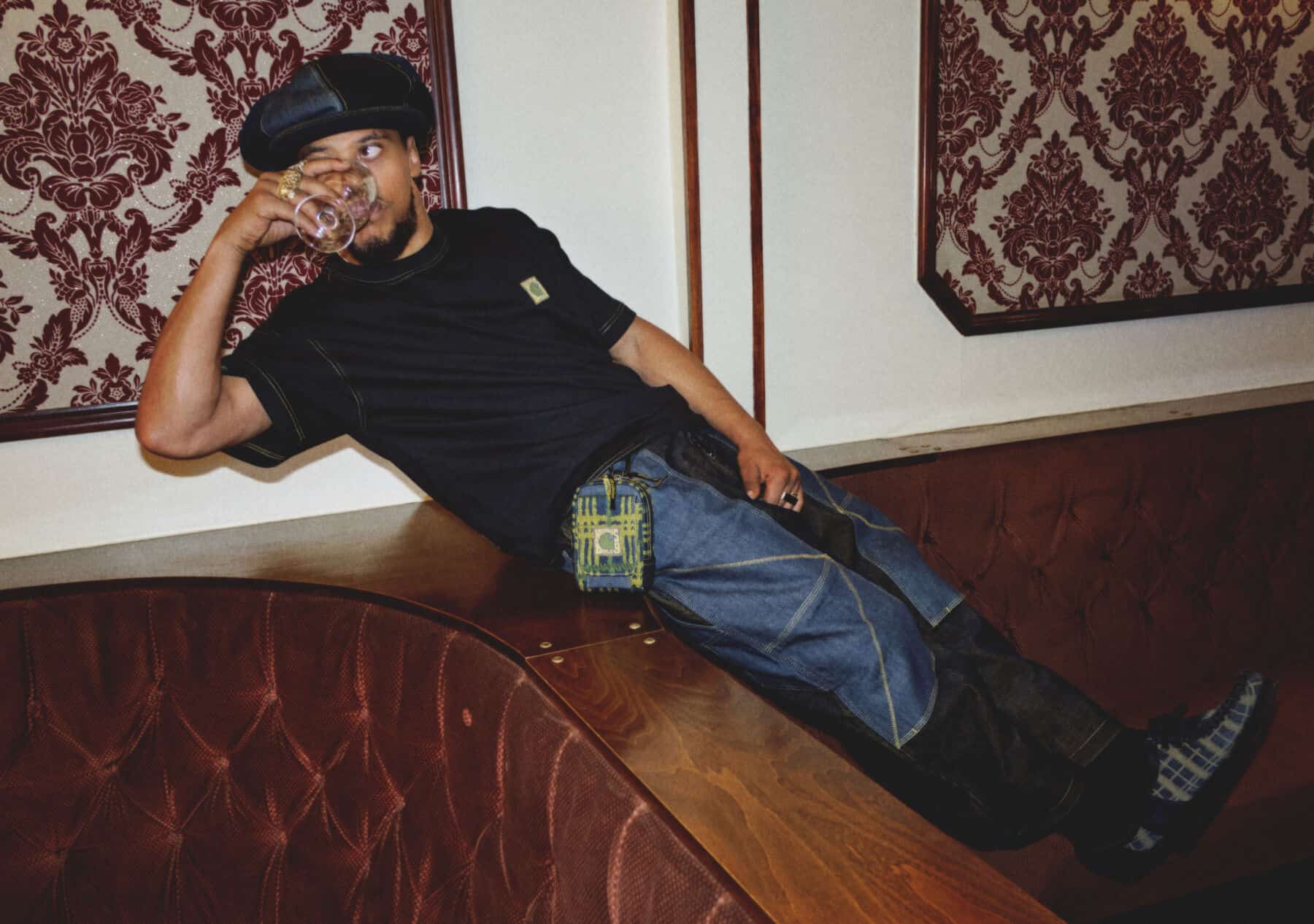 This continuous dialogue between fashion and music is something also embraced by Carhartt WIP, the latest brand to collab with Daley on a 13-piece capsule. A brand beloved by musicians across the globe, with everyone from Eazy-E to Moodymann pledging their allegiance, Carhartt WIP’s dedication to endorsing local music scenes mirrors Daley’s with striking similarity. Dalston’s NTS Radio, for instance, has enjoyed support from the streetwear label since the beginning, with Daley himself appearing on various radio shows across the years. Aligned in their approach, the pieces on offer balance Daley’s utilitarian sensibilities and Carhartt WIP’s subcultural heritage with deft flair. Drawing from a colour palette featuring rich blues, muted greens and mustard yellows (a reference to Daley’s dual Scottish-Jamaican heritage), the offering roots itself in classic Carhartt WIP silhouettes like the chore coat and double knee pant. The details are distinctly Daley though, with custom pin badges and Reggae Klub-inspired graphics spattered throughout, whilst the designer’s signature oversized baker boy hat is reimagined with double-denim panelling.