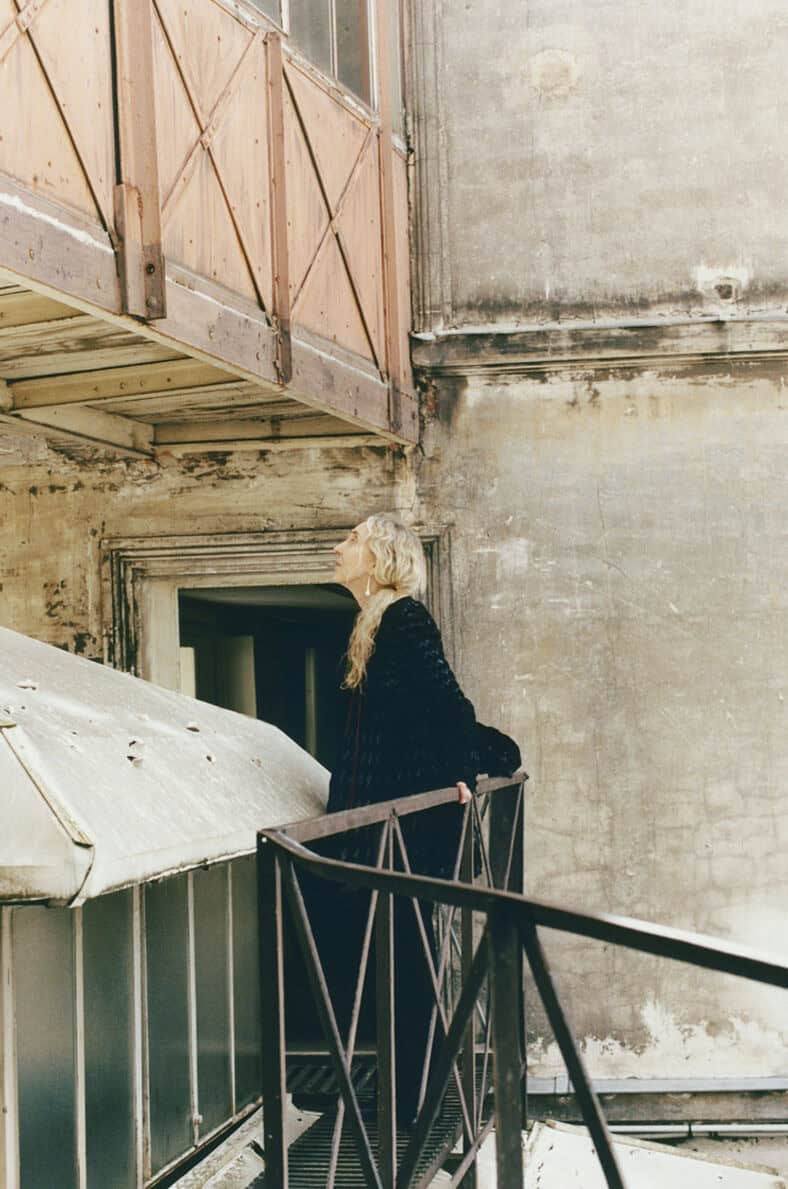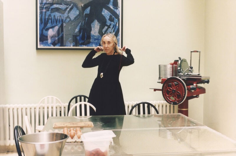 Carla wears a black wool Alaïa dress, AW01. She’s photographed in front of a Julian Schnabel painting in the kitchen of Fondation Azzedine Alaia, where the late designer loved to cook and host friends.