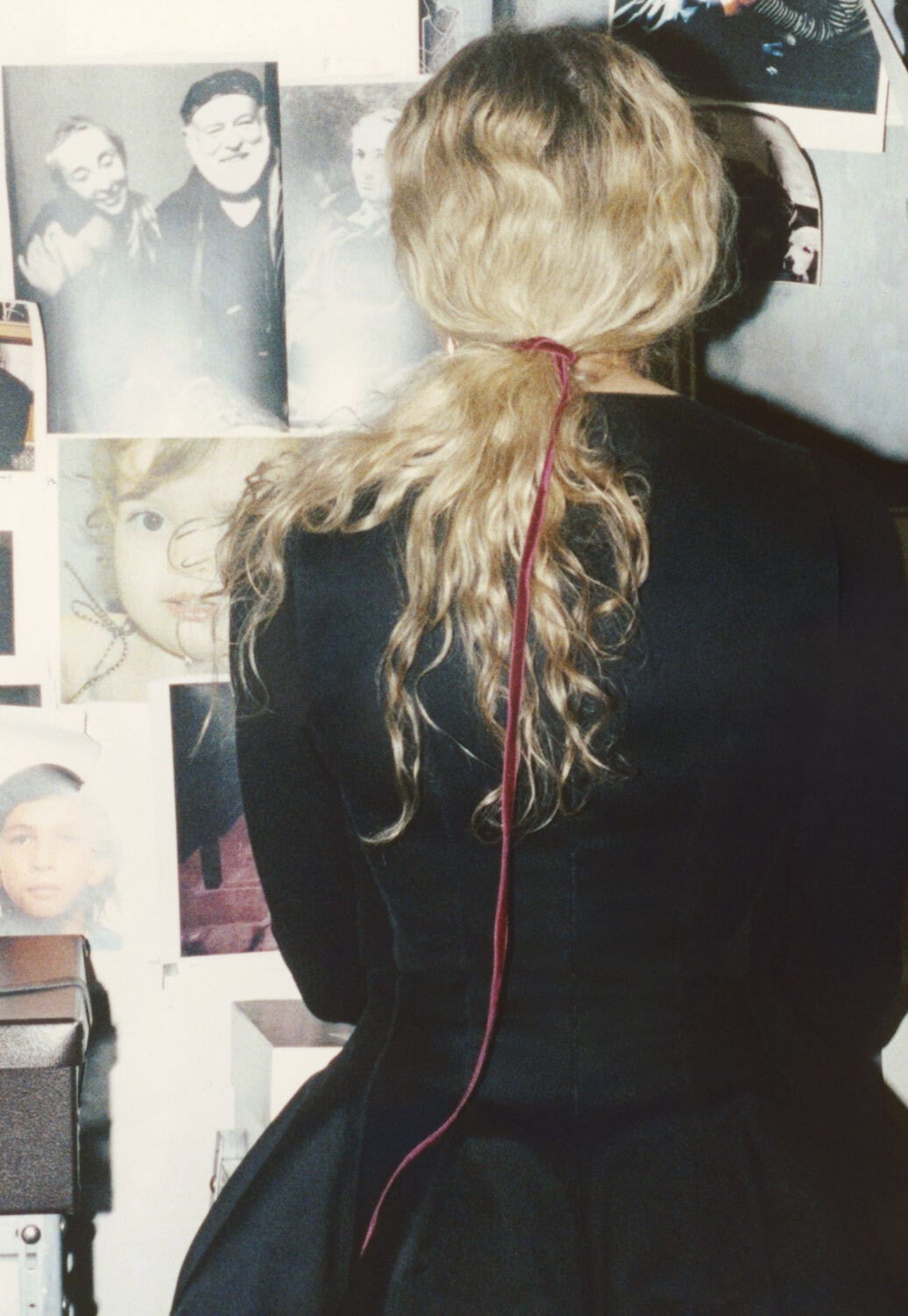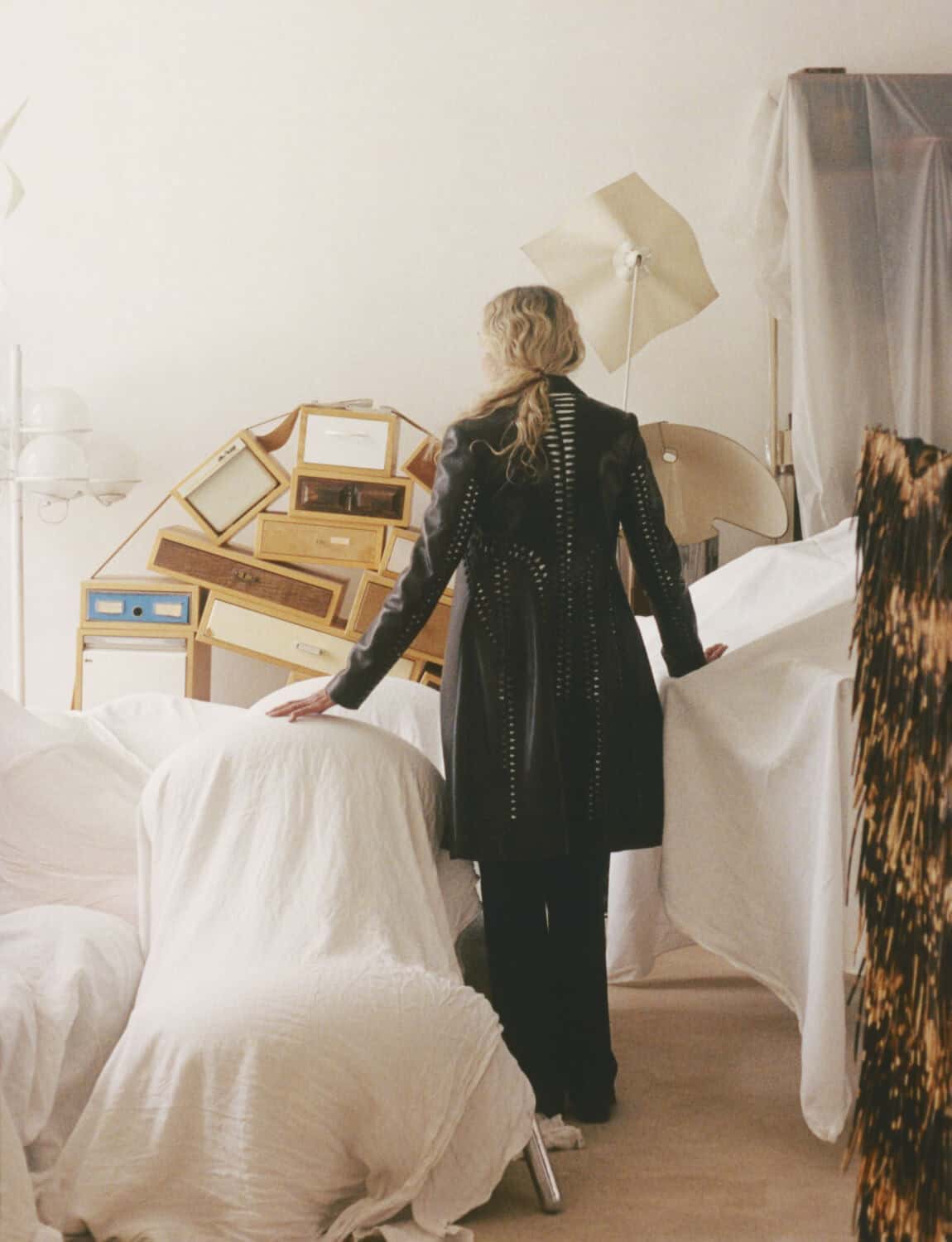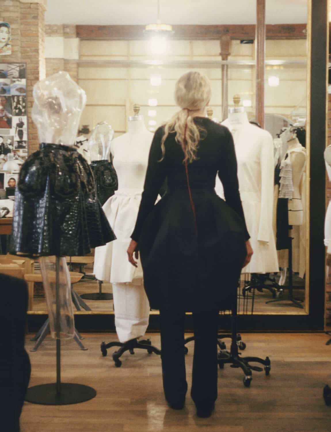 from left: Carla in front of Azzedine’s wall of memories, featuring pictures of people he cherished. She wears a black cotton dress, Couture 09; Carla in Azzedine’s apartment, wearing a black leather coat from AW09