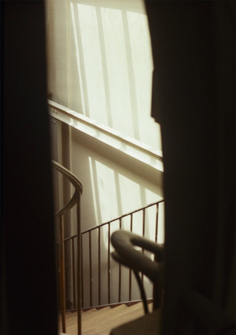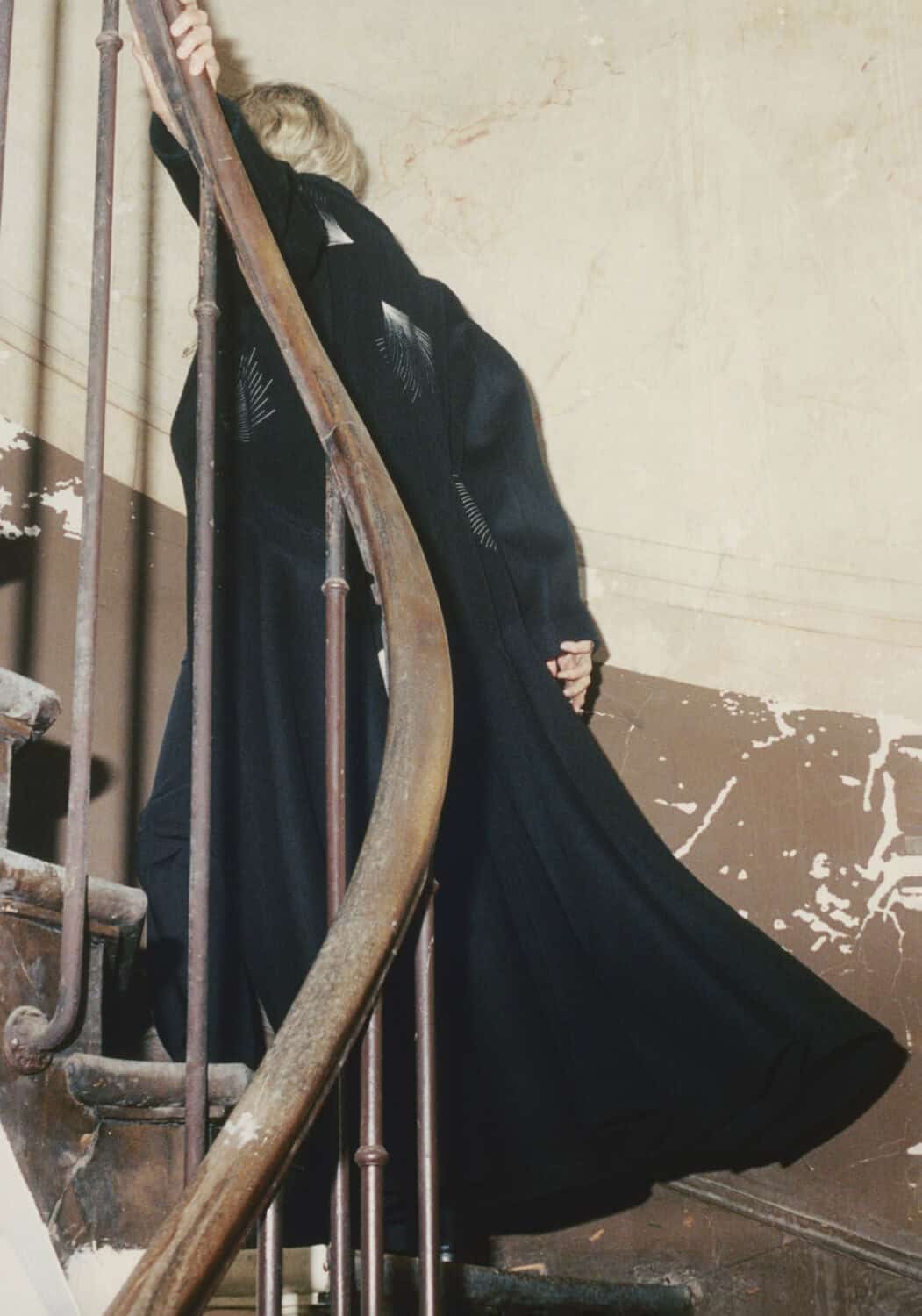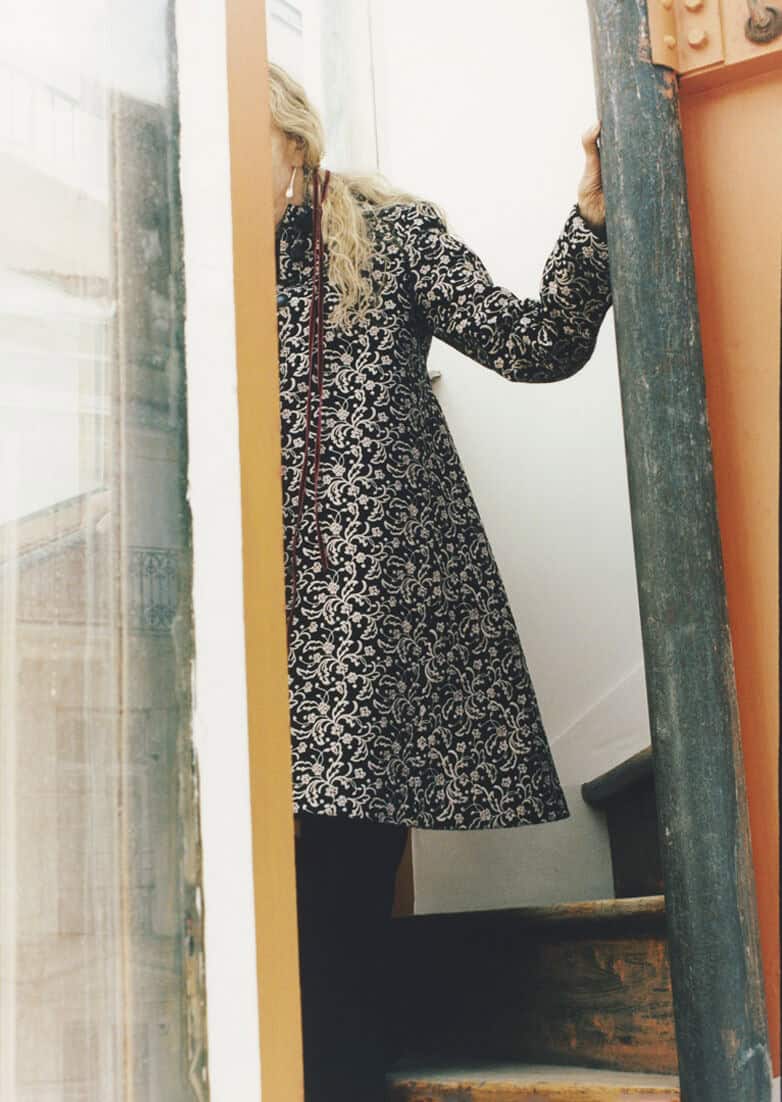 from left: in Azzedine’s apartment wearing an embroidered coat, AW16; wearing an embroidered felt coat, AW86; a view of the stairs up to Azzedine’s apartment