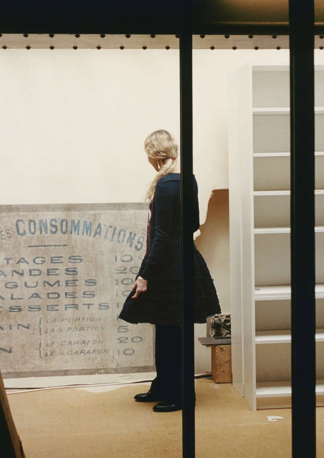 from left: Carla in the archive, standing in front of an 18th-century painting of a restaurant menu, wearing a dark blue knitted dress, AW08