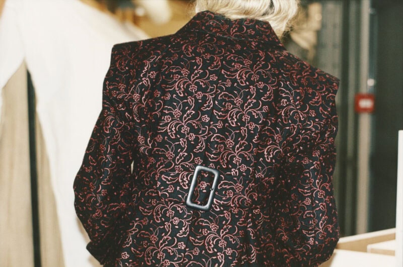 Carla in the foundation’s fashion history archives wearing an embroidered coat, AW15