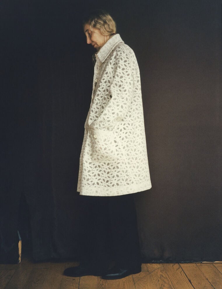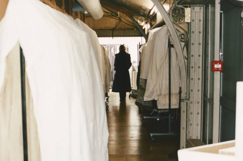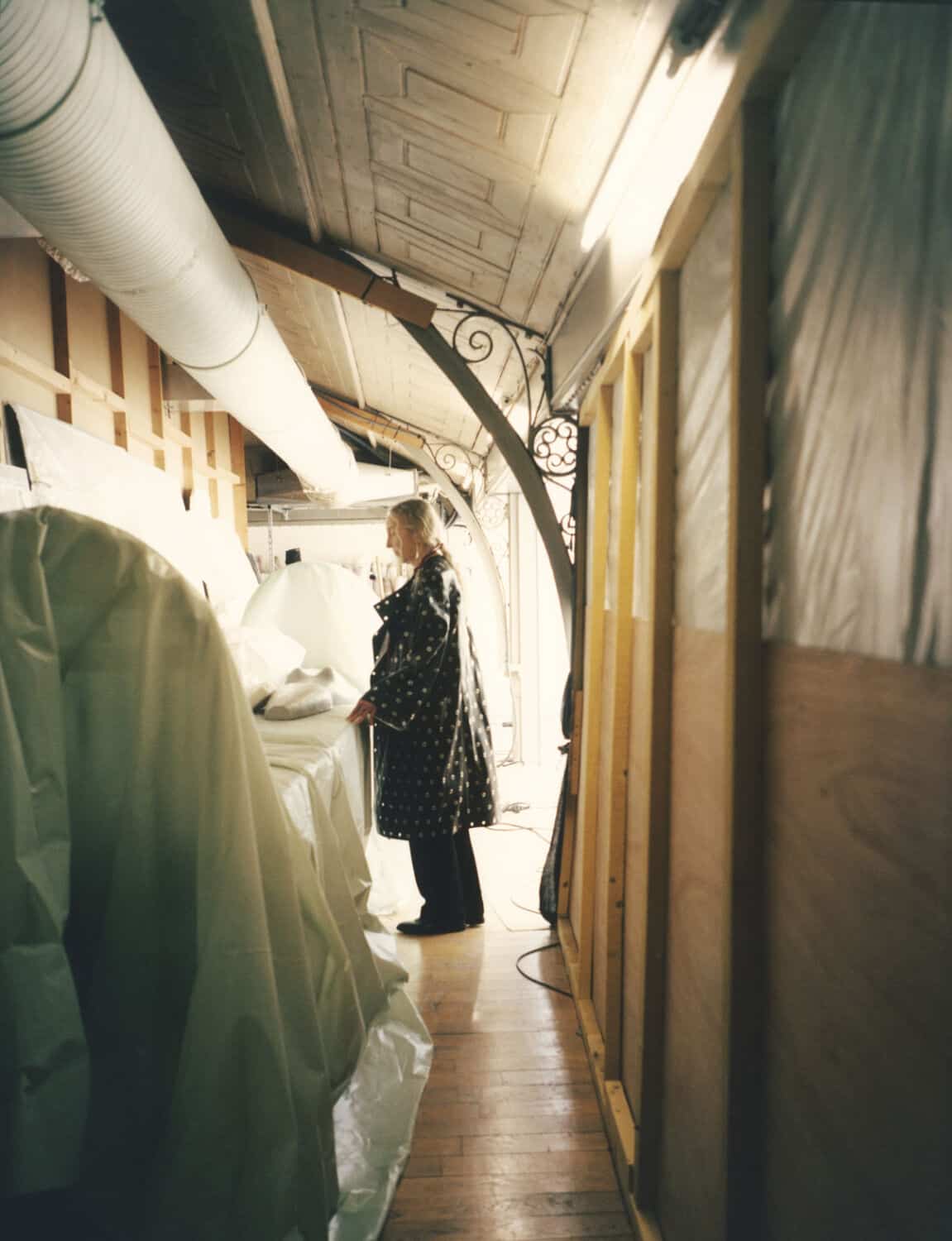 from left; white embroidered coat from Azzedine’s final collection, SS18; on the gangway leading to the archives, wearing an embroidered black sequin tunic, AW14