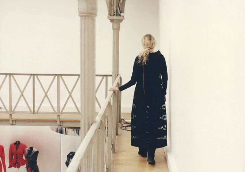 on the mezzanine over the exhibition gallery wearing a black viscose dress with nylon see-through motif, SS15