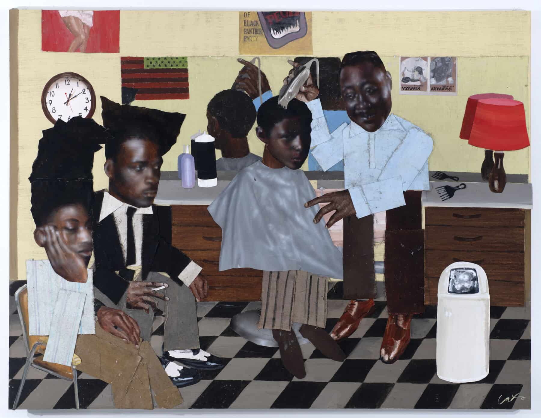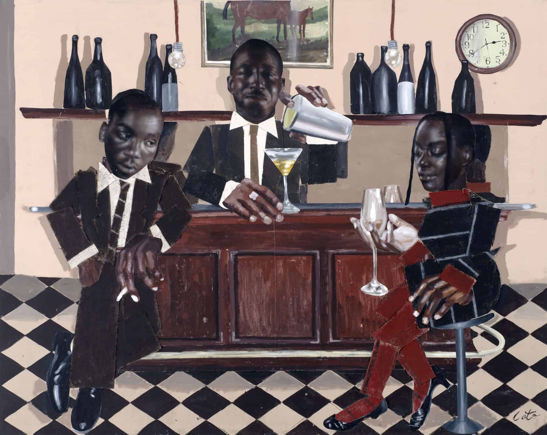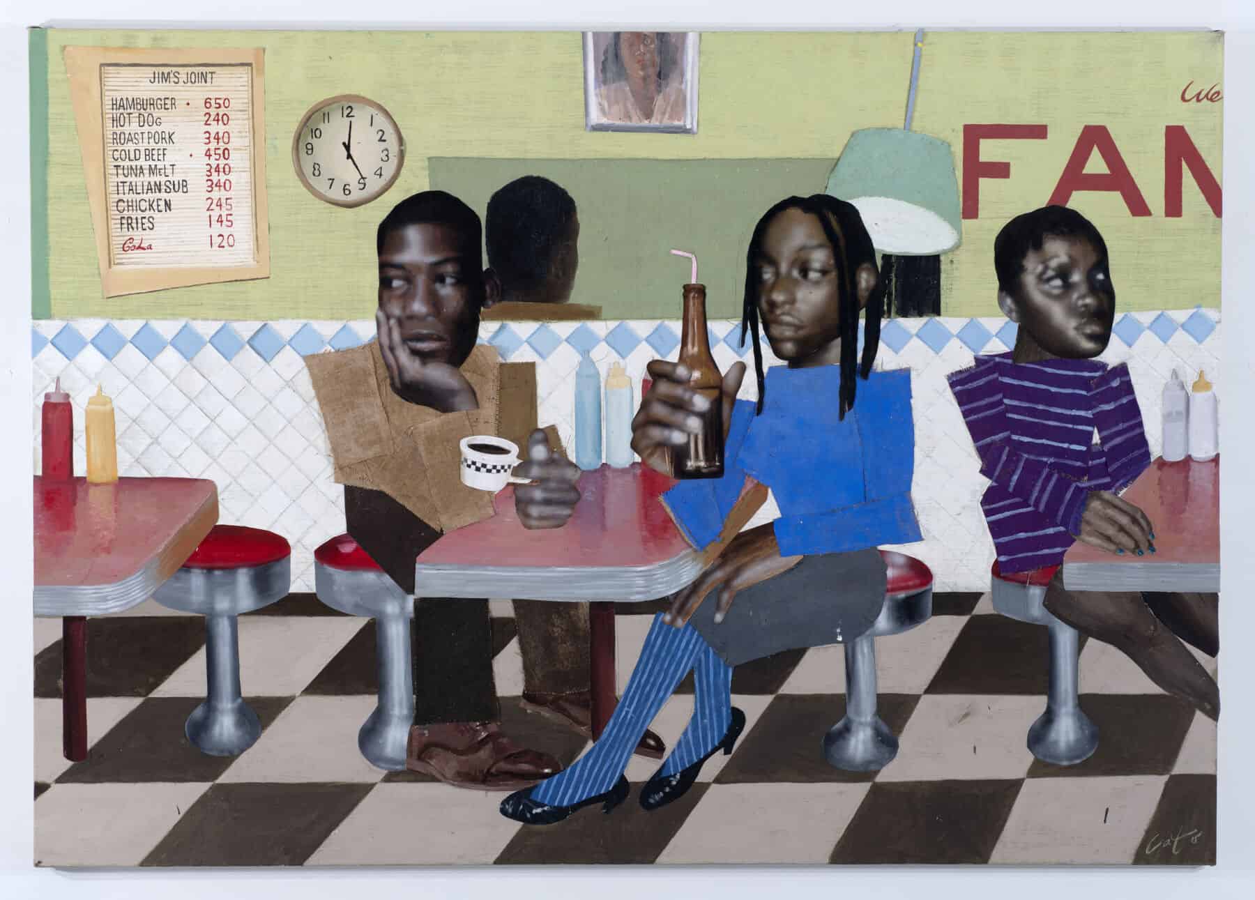 For Toby Grant, streets and shop windows are all he needs to make great art. Going by Cato within the art world, Grant, who was born in Brighton and now lives in Peckham, presents larger-than-life scenes (literally, big hands and big heads are a Cato signature) of the Black communities who reside in the South London district. These are the subjects that form the basis of Grant’s biggest solo exhibition at Saatchi Yates, open to the public from today. Barbershops, diners, living rooms and other private spaces, where residents have coalesced for years, become the backdrops of Grant’s layered paintings, where each element is painted onto unstretched canvas before being cut out and pasted onto wall-filling pieces that possess a scrapbook-like quality. “I’ve always made my private spaces, my bedroom [for example], into my own world, [it’s] where I can dream things up,” Grant says. “[It’s also] where people can express themselves without being seen.”