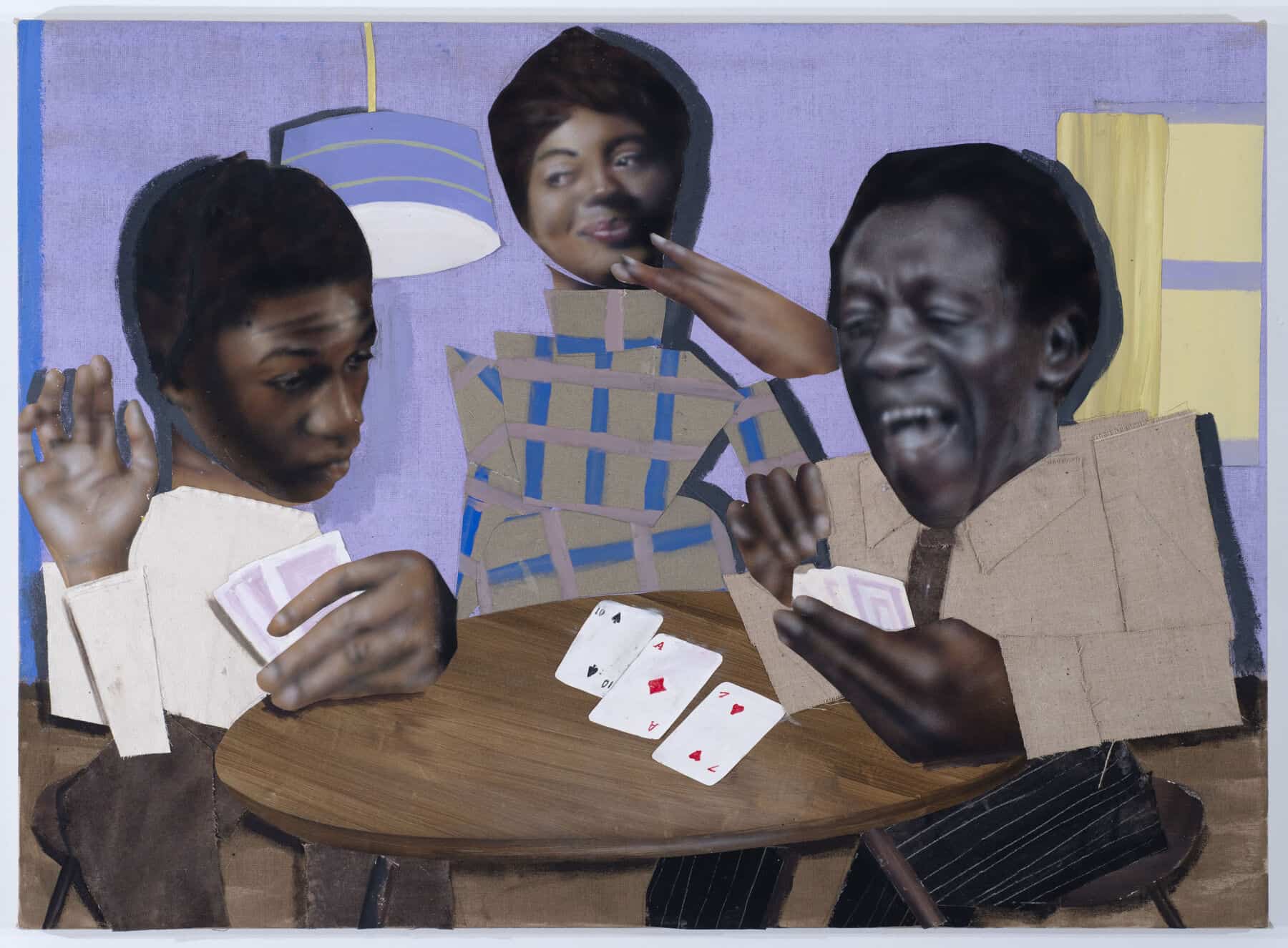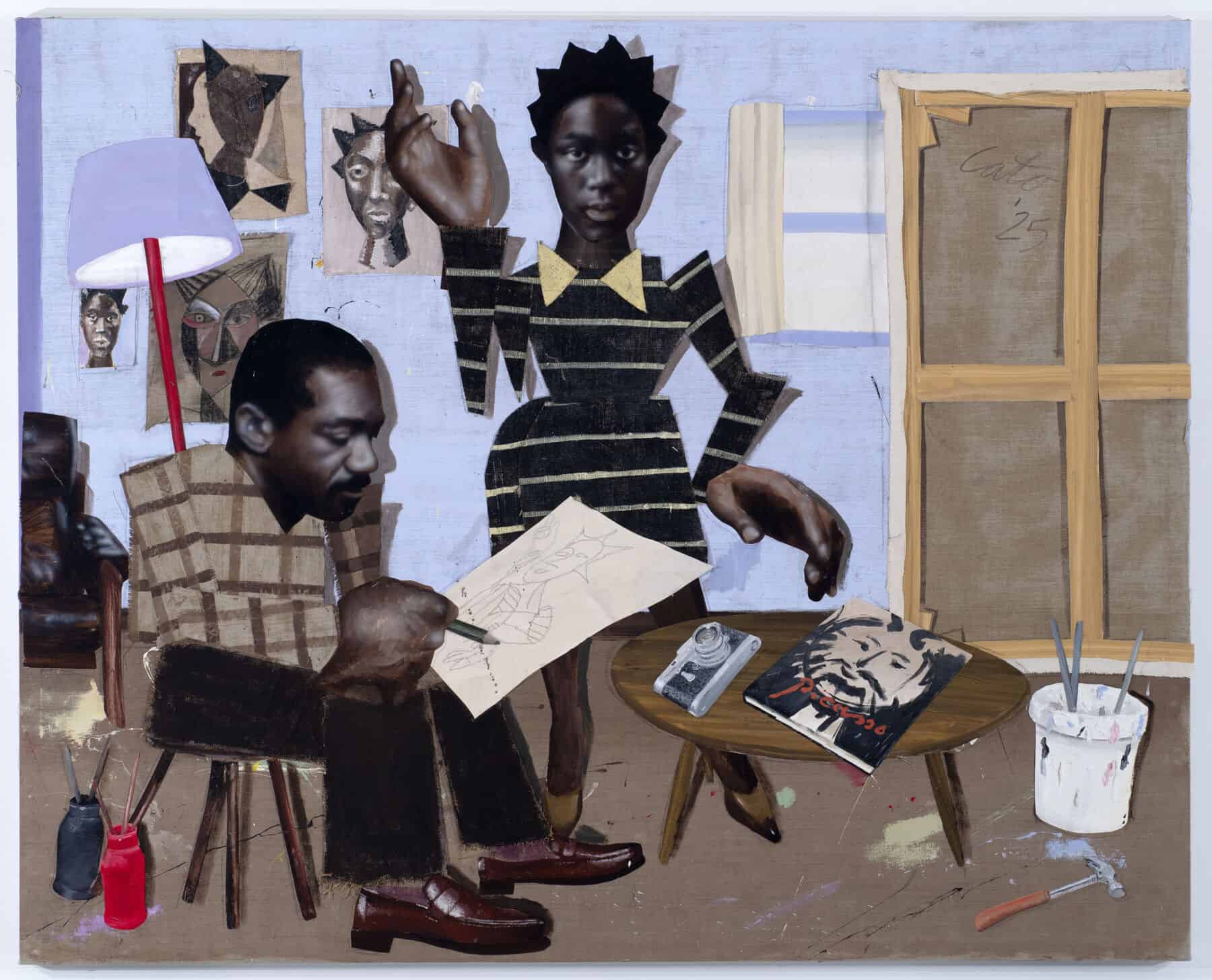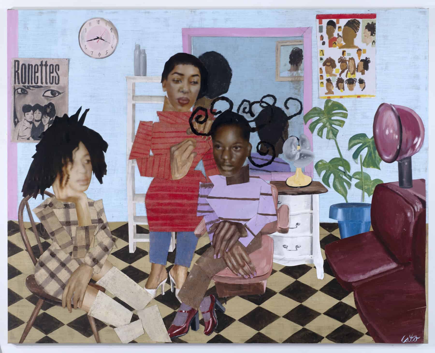 For Toby Grant, streets and shop windows are all he needs to make great art. Going by Cato within the art world, Grant, who was born in Brighton and now lives in Peckham, presents larger-than-life scenes (literally, big hands and big heads are a Cato signature) of the Black communities who reside in the South London district. These are the subjects that form the basis of Grant’s biggest solo exhibition at Saatchi Yates, open to the public from today. Barbershops, diners, living rooms and other private spaces, where residents have coalesced for years, become the backdrops of Grant’s layered paintings, where each element is painted onto unstretched canvas before being cut out and pasted onto wall-filling pieces that possess a scrapbook-like quality. “I’ve always made my private spaces, my bedroom [for example], into my own world, [it’s] where I can dream things up,” Grant says. “[It’s also] where people can express themselves without being seen.”