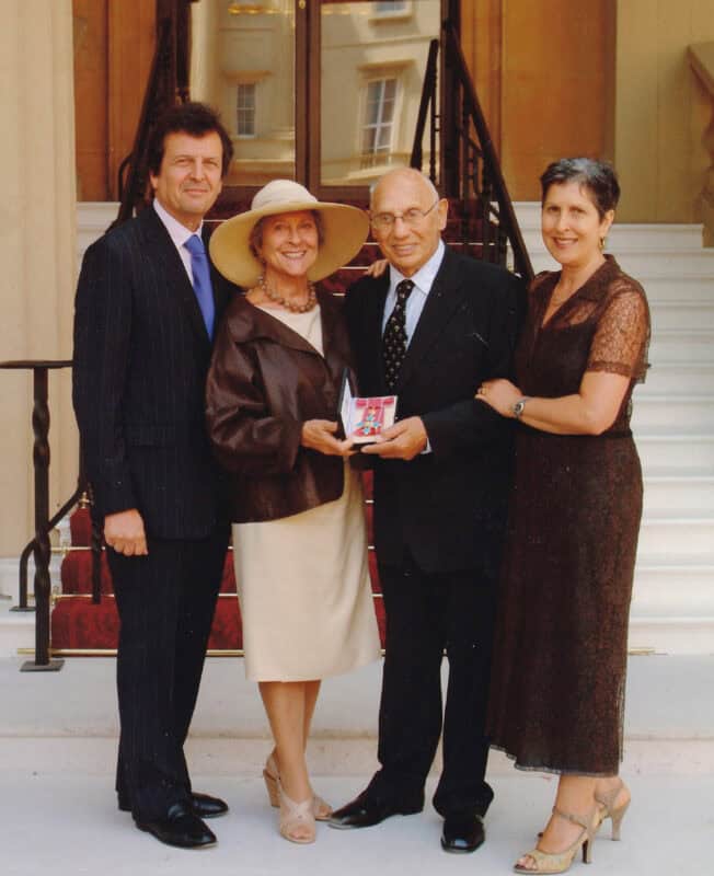 Mrs B with her husband Sidney, son Simon and daughter Caroline, accepting her CBE for services to fashion in 2006