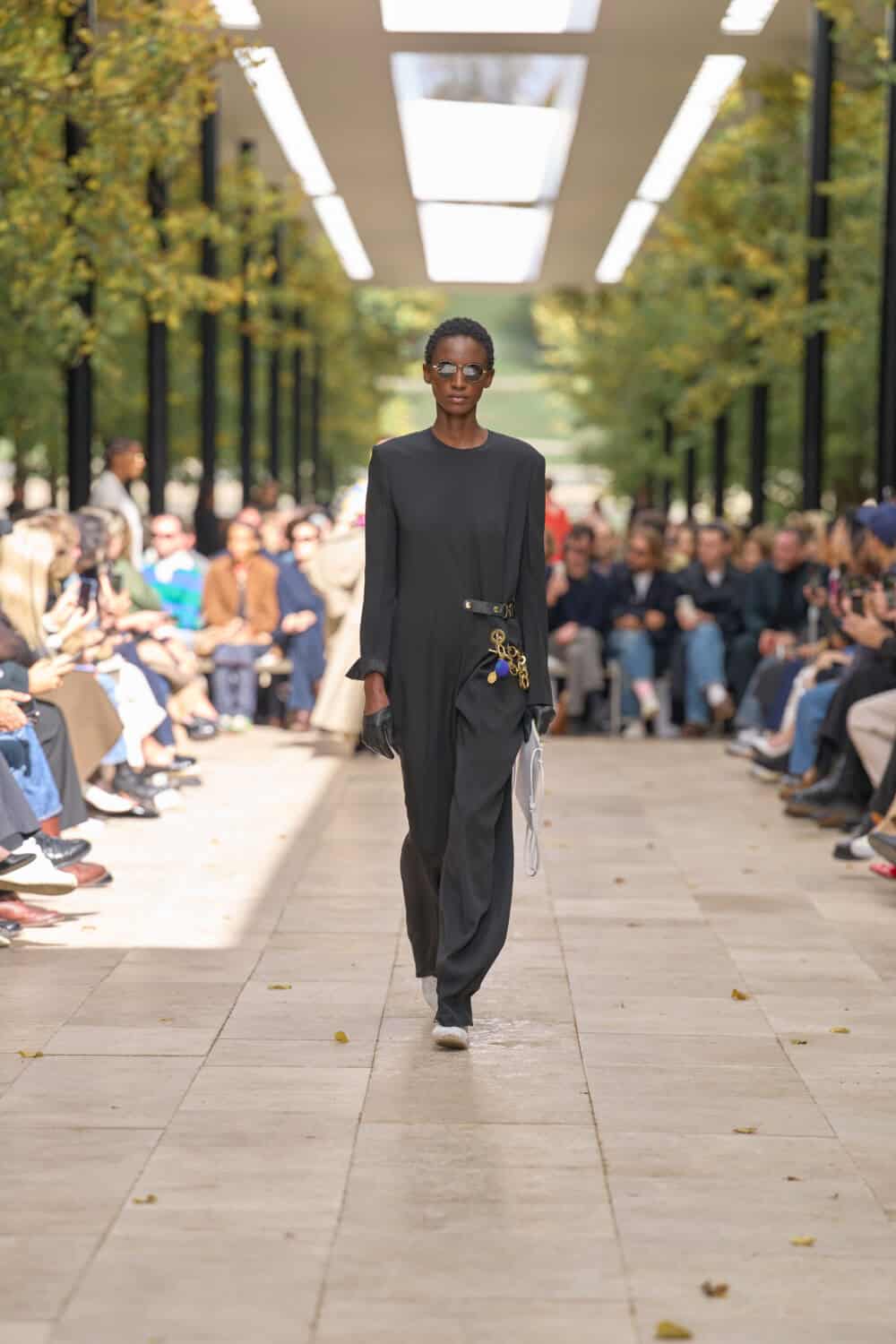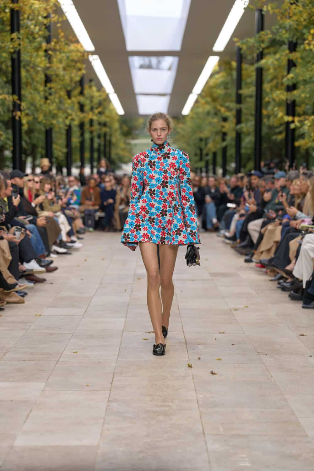 The ‘60s spirit was alive in daisy-printed micro-minis, knickers peeking out from underneath, paired with round sunglasses and half-hand gloves. Knitwear came stamped with bold Celine logo intarsia, while a cream blazer sliced with a pure white panel seemed to ripple with movement. For evening, a black floor-length gown bloomed into a layered skirt, with one stripy arm adding a touch of colour, and later, a purple sequin dress sparkled with unapologetic optimism.