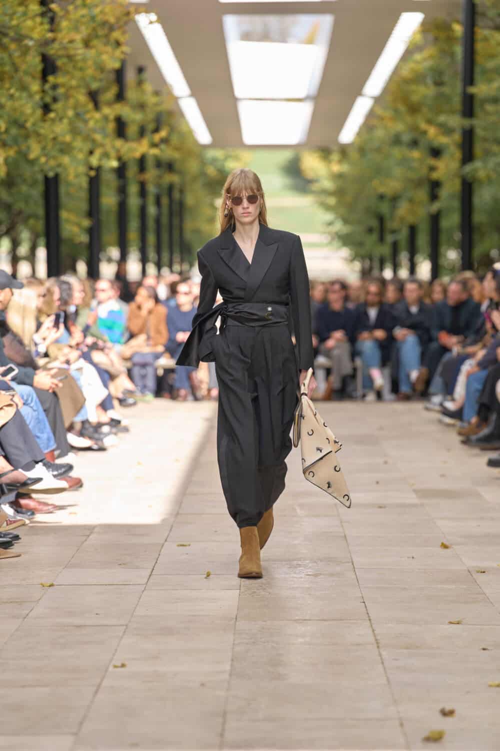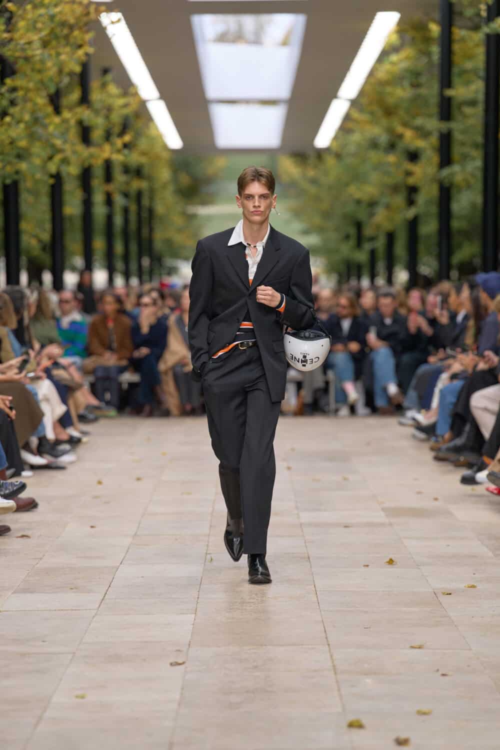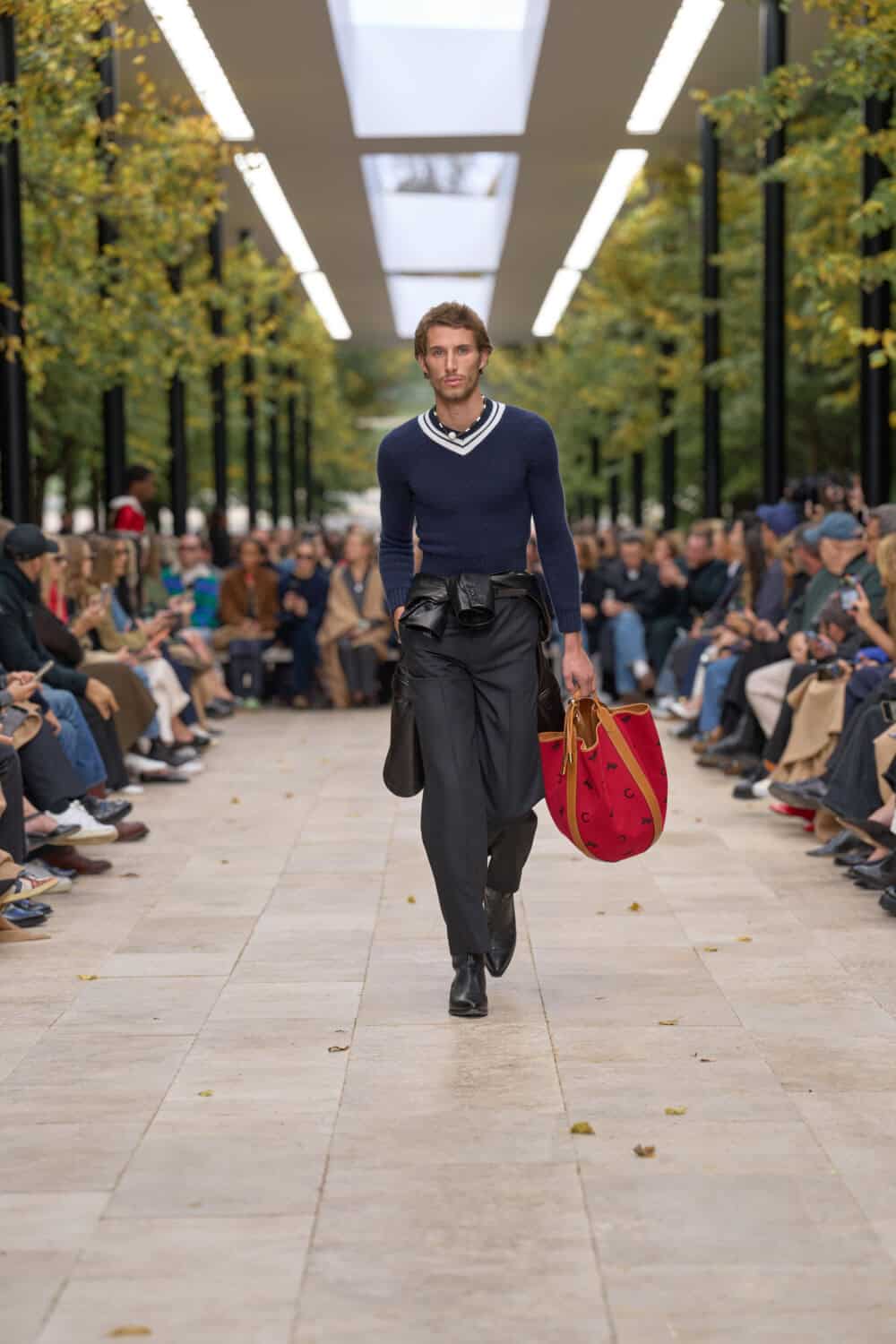 Michael Rider’s ready-to-wear debut for Celine unfolded en plein air at the Parc de Saint-Cloud, perched on an elevated runway beneath the day’s blue sky. Sunlight and a soft breeze gave the clothes room to move, and what came out was a confident continuation of the resort show he staged in July.