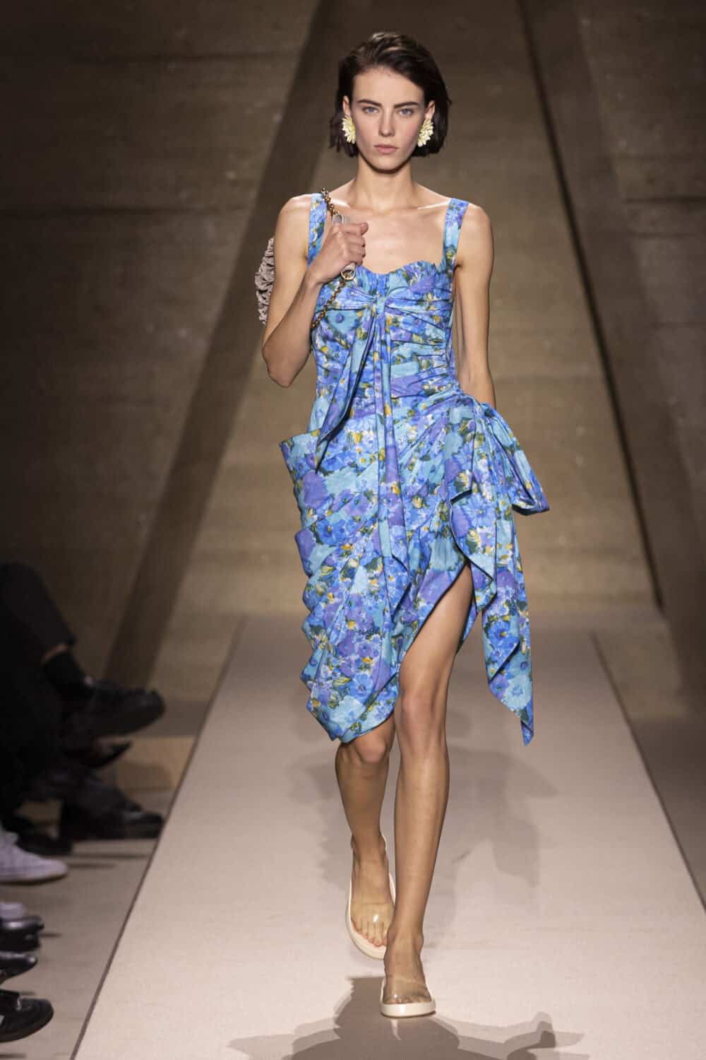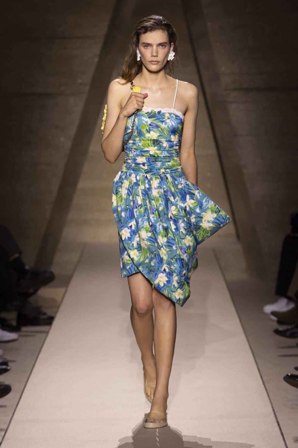 Her aim was to achieve “an airiness through pleating knotting and wrapping. Spontaneous but precisely studied.” A few cotton and lace gypsy dresses apricot and lemon nodded to her boho look and she amped up the charm with accessories sending out nicely shell and watermelon slice clutch bags and a joyful leather hydrangea pouch that came in all the soft pastel Chloé colours.