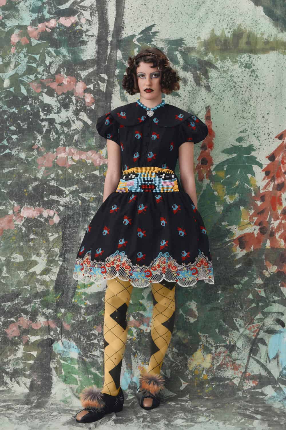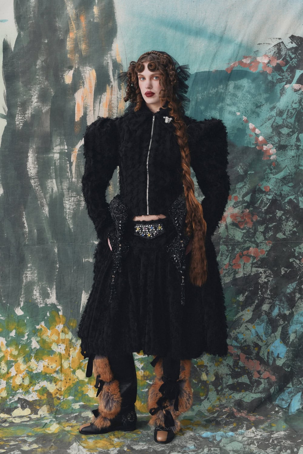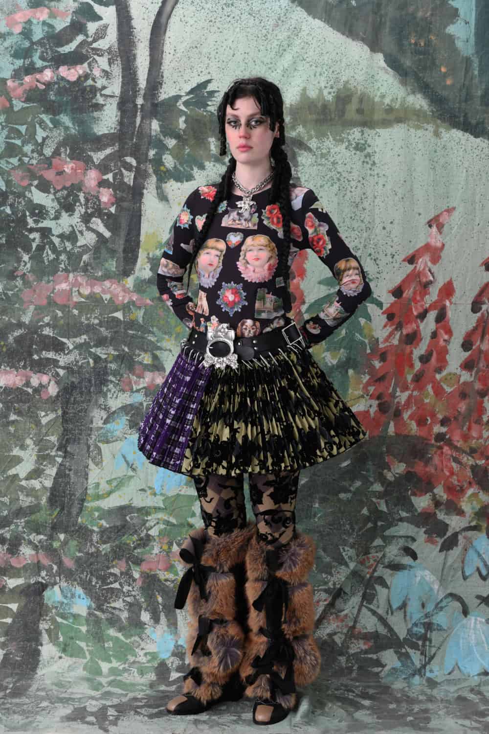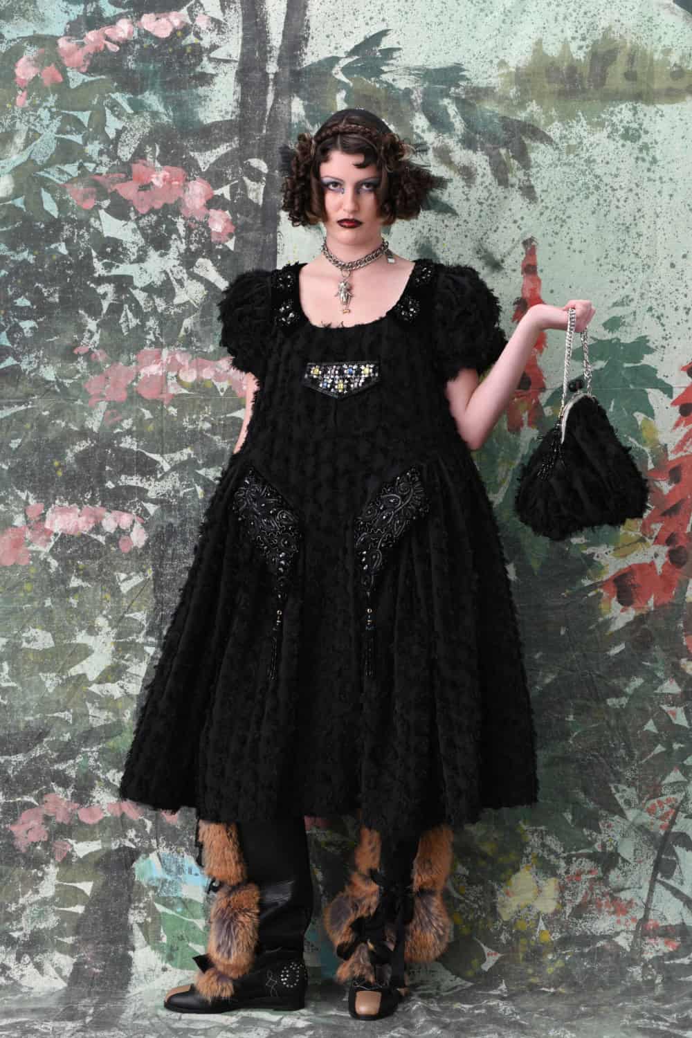 The famous carabiner skirts came in intense patchworks of texture and pattern, styled with Peter Pan collar shirts and lashings of accessories – carpet bags heaving with charms, pearl and cameo necklaces and butterfly bedazzlements. Chopova Lowena creates a total world. It’s immersive, beautifully resized and oh so true to itself.