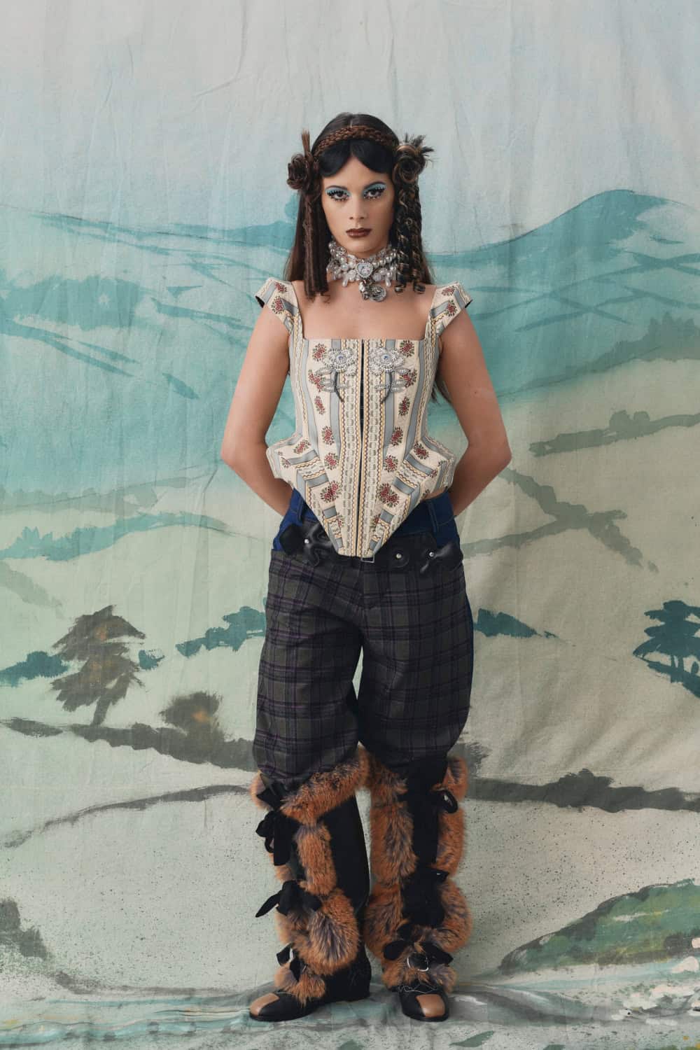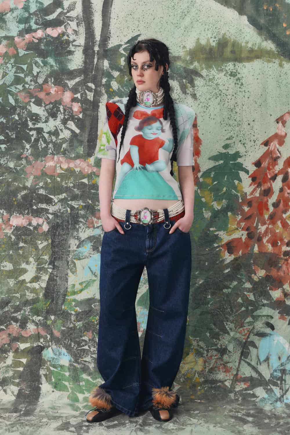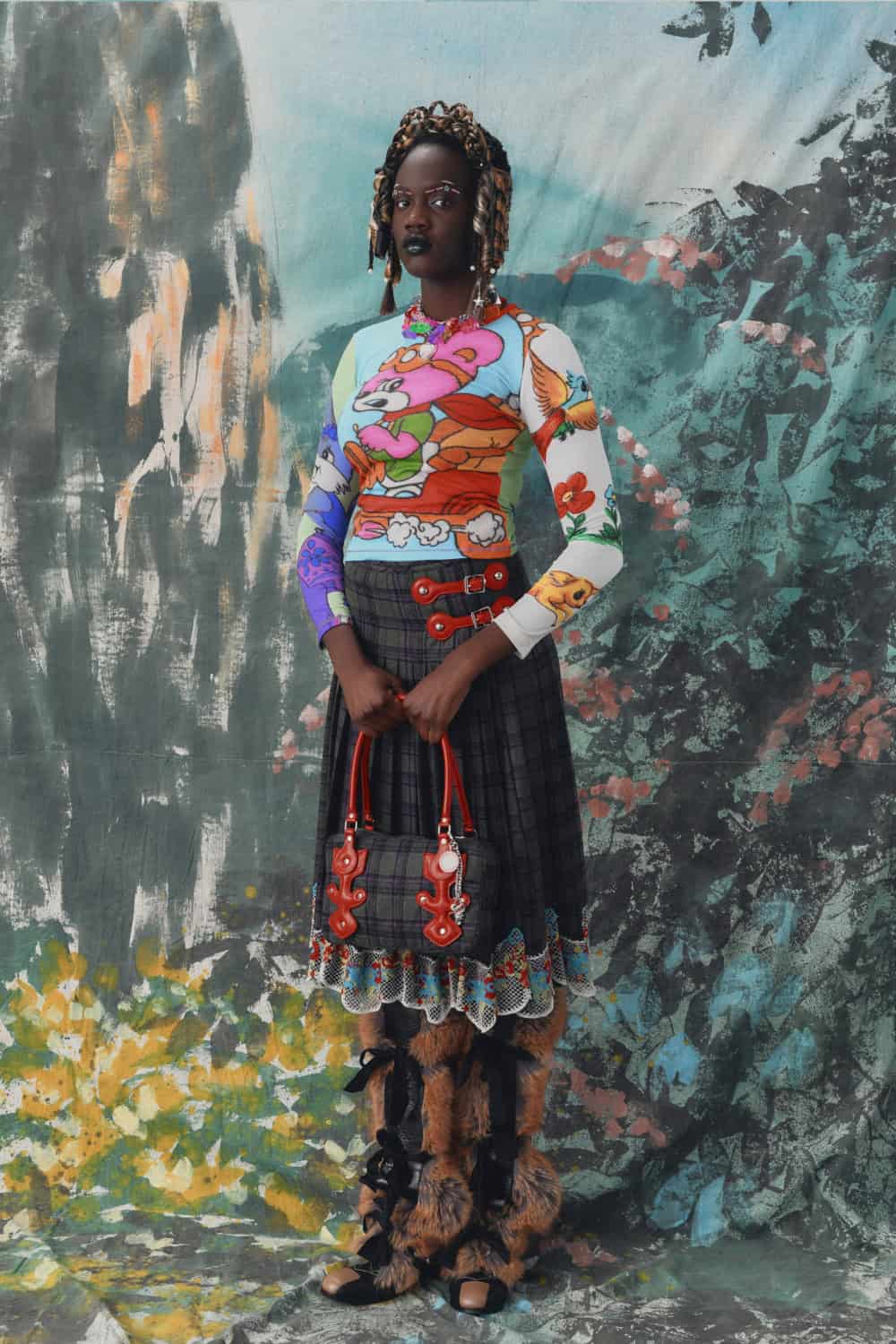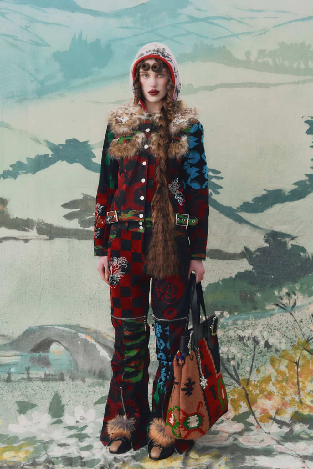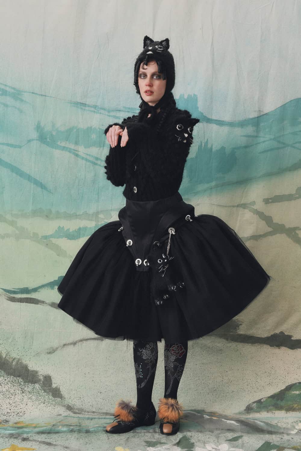 The famous carabiner skirts came in intense patchworks of texture and pattern, styled with Peter Pan collar shirts and lashings of accessories – carpet bags heaving with charms, pearl and cameo necklaces and butterfly bedazzlements. Chopova Lowena creates a total world. It’s immersive, beautifully resized and oh so true to itself.