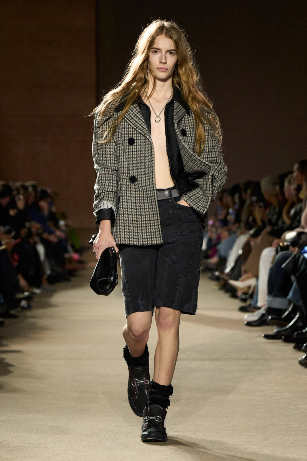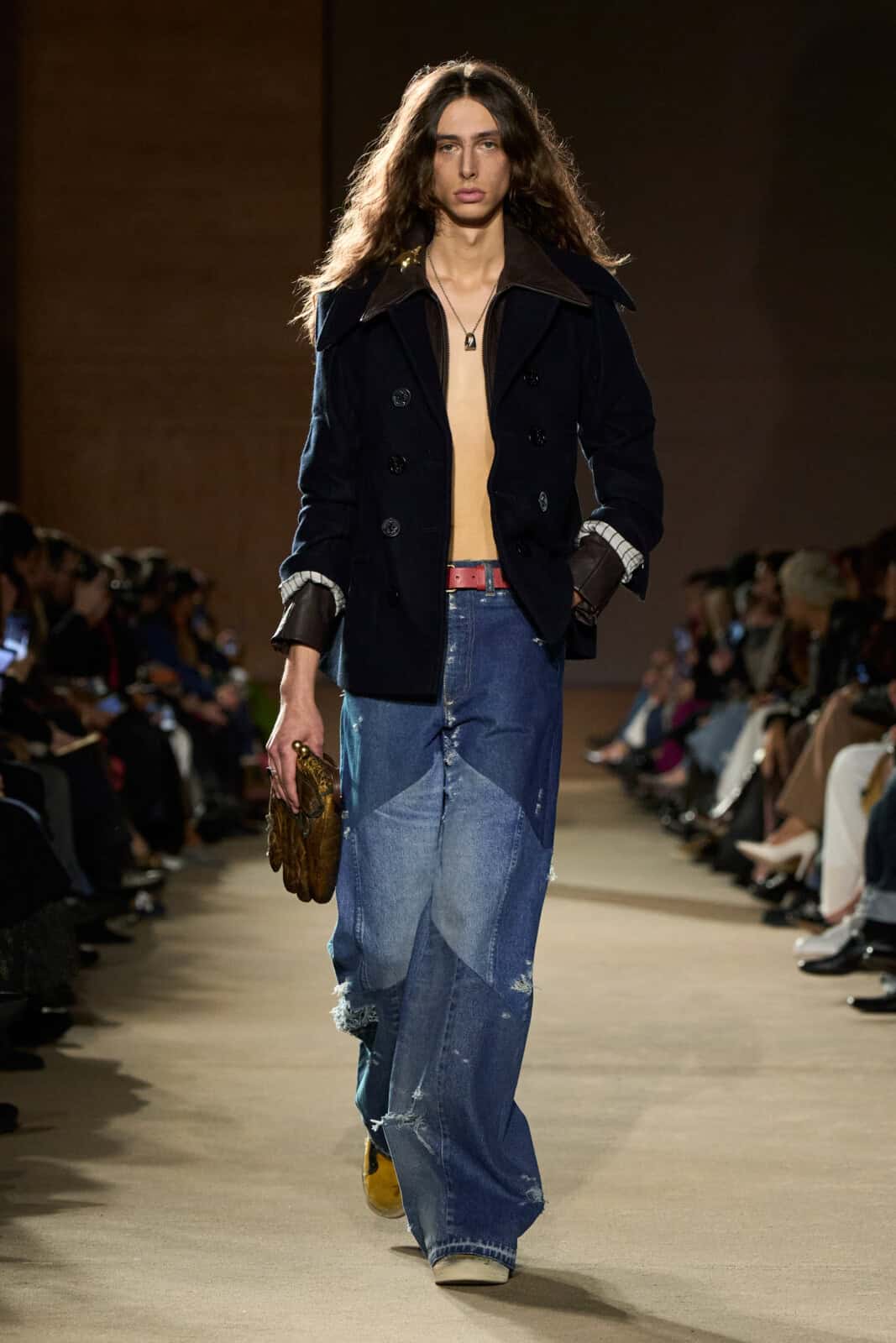 Fittingly, vintage was a big inspiration here, with a youthful, updated twist. Varsity jackets, patchwork denim and lots of jorts for the skater types, should they want to invest in that kind of thing. Blazers were spliced three ways, featuring different suiting fabrics on each panel. Most models were shirtless underneath their sporty jackets (when you’re a rebel, shirts aren’t totally necessary). Like Dorothy’s famous footwear, there were pops of colour in the form of red slouchy pants. shorts and dresses, but overall, the tones were pretty muted. The best dresses closed the show, black velvet with silver star motifs.