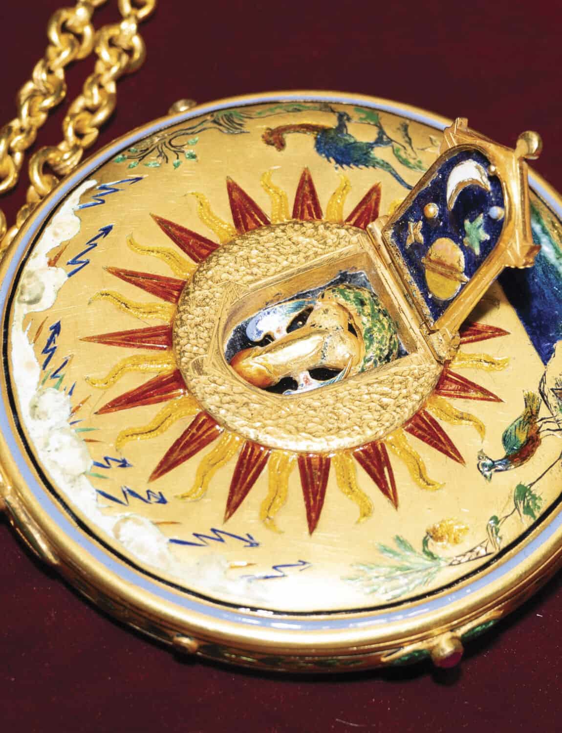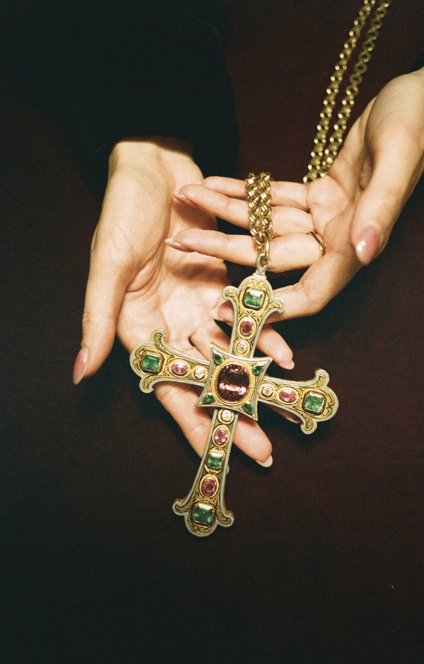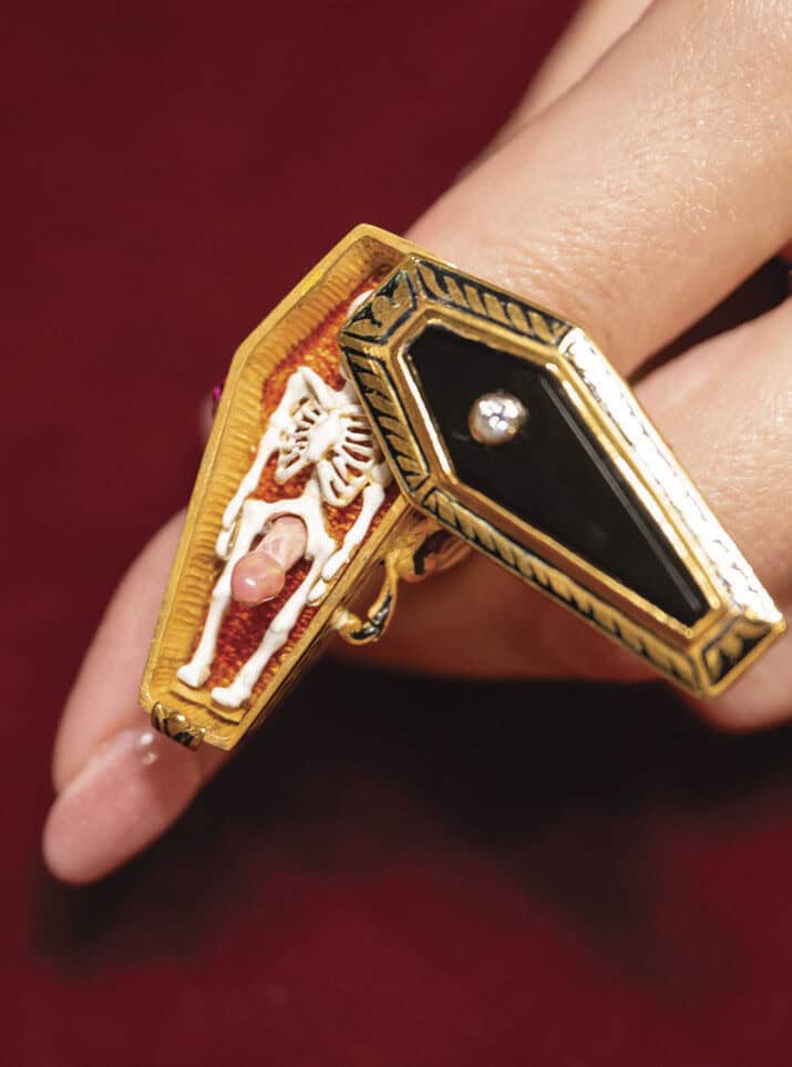 from left: coffin ring in 18k yellow gold and enamel with onyx and diamond, which slides open to reveal a skeleton and its pop-up penis; a Byzantine cross pendant in engraved and enamelled 18k yellow gold with diamonds, emeralds, pink sapphires and a central pink tourmaline, circa 1970s; the back of the pendant set with the antique cameo depicting the Judgement of Paris has a hidden compartment for a golden phallus