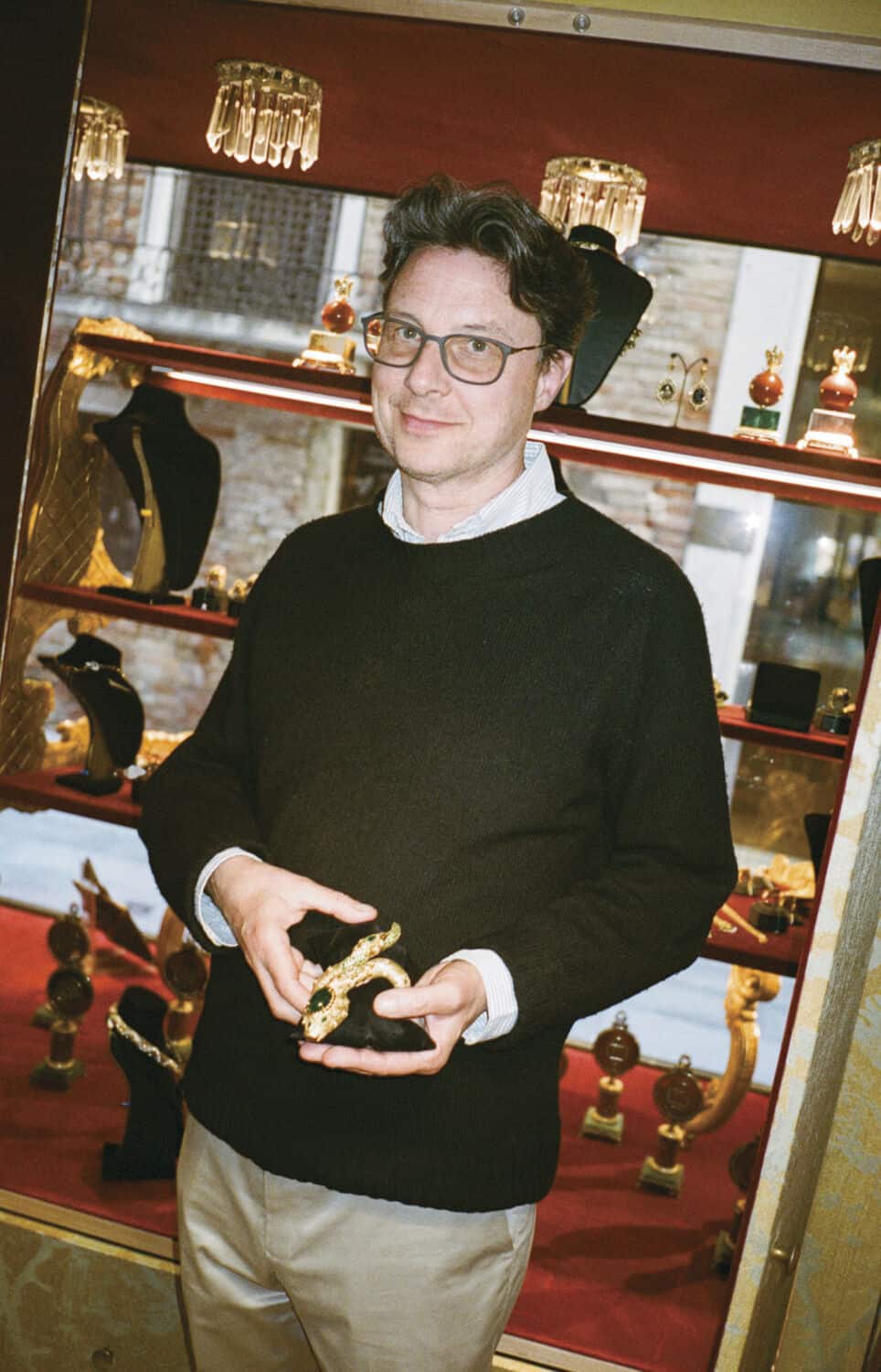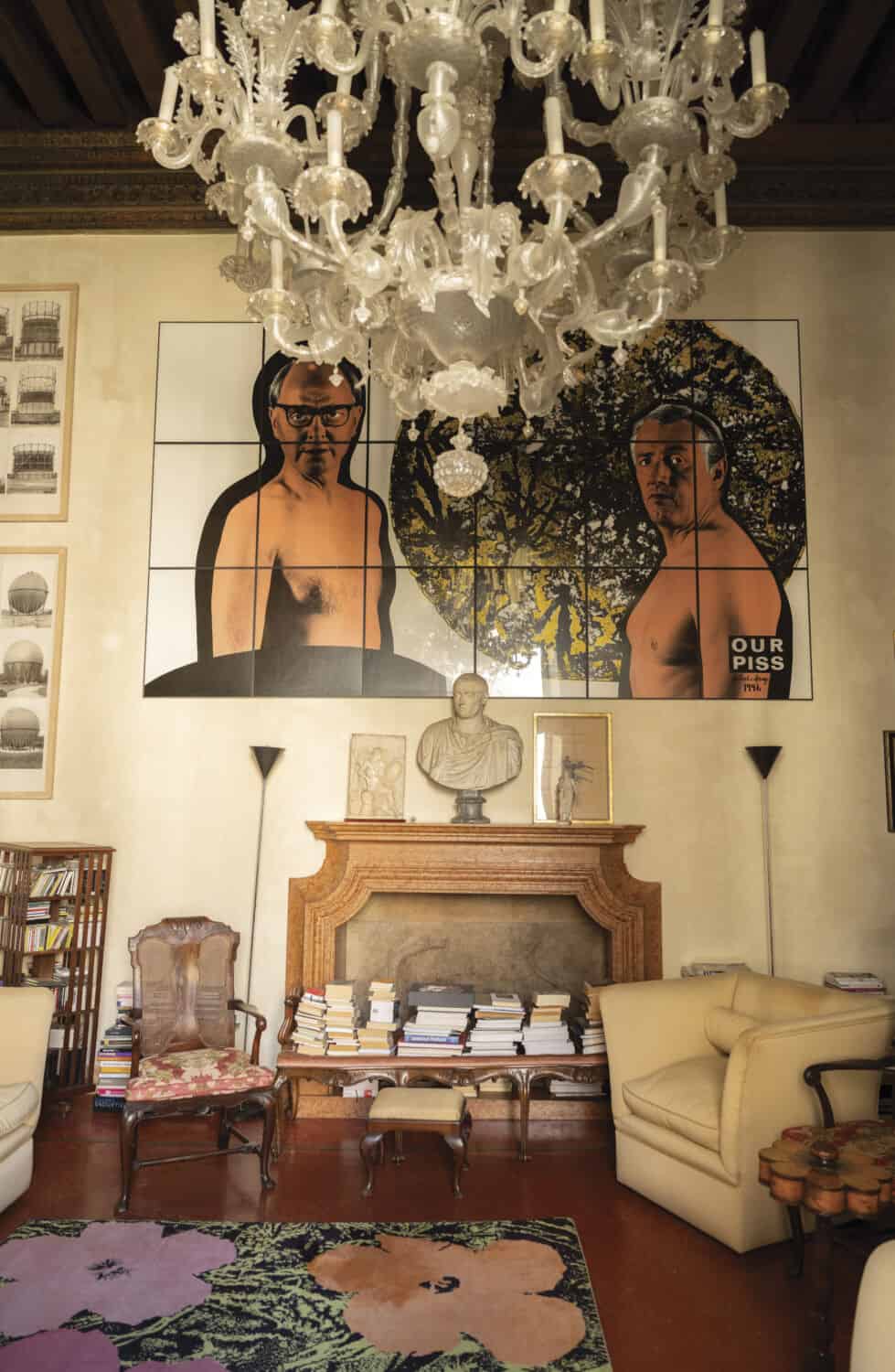 from left: a window at the Calle Vallaresso boutique, heaving with precious objects; inside Attilio Codognato’s art-filled palazzo, where the siblings’ father lived with his collection, which included works by Gilbert and George, Marcel Duchamp, Cy Twombly and Andy Warhol