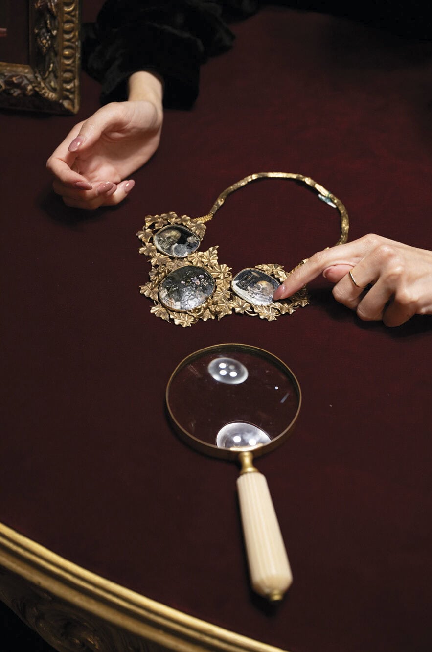 from left: Mario Codognato holds a snake in 18k yellow gold with diamonds and emerald, one of the last pieces designed by his father Attilio; Cristina Codognato wears an 18k yellow gold and polychrome enamel pendant set with a late-17th-century antique cameo depicting the Judgement of Paris