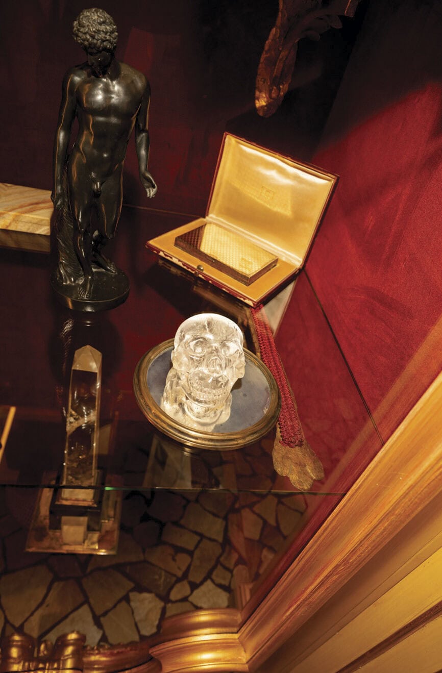 from left: a rock crystal skull and other collectibles inside the Codognato boutique; an 18k garland necklace featuring three hand-painted memento mori enamel miniatures, circa 195
