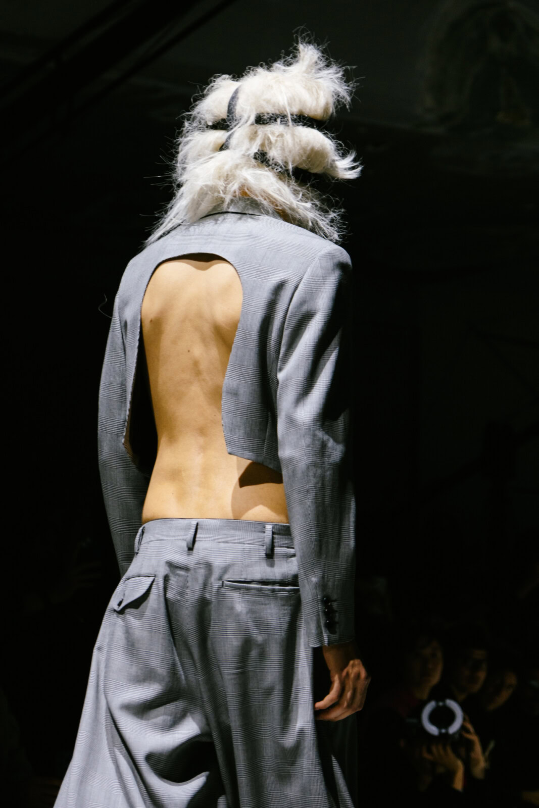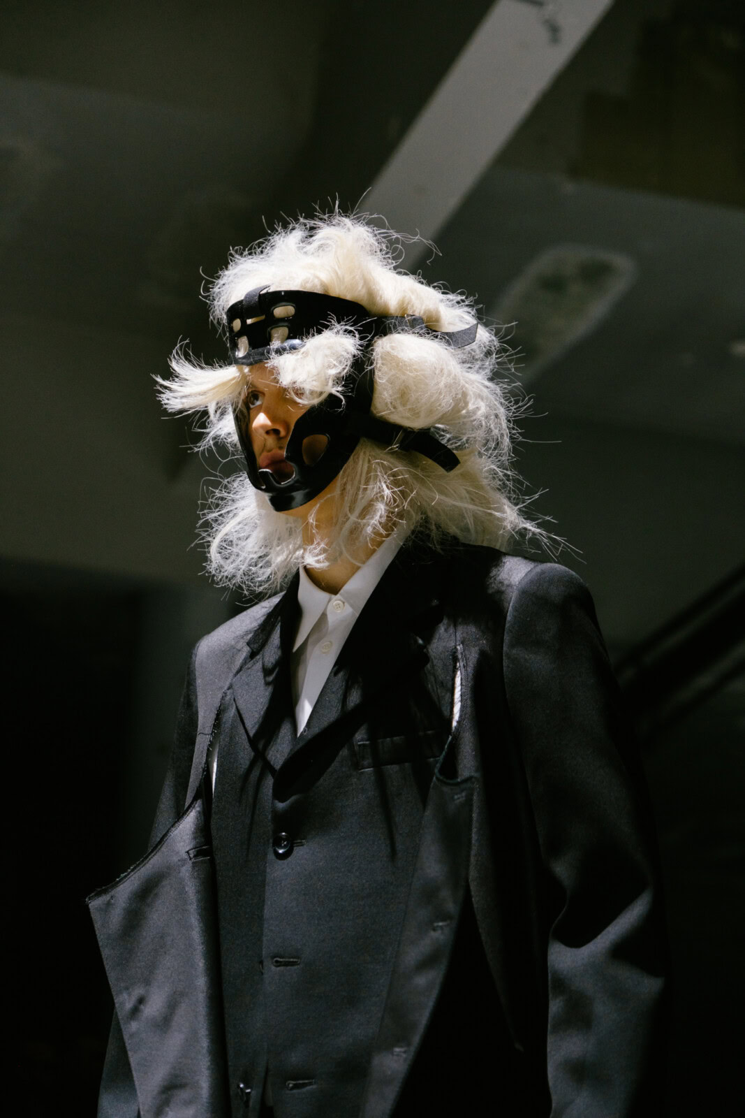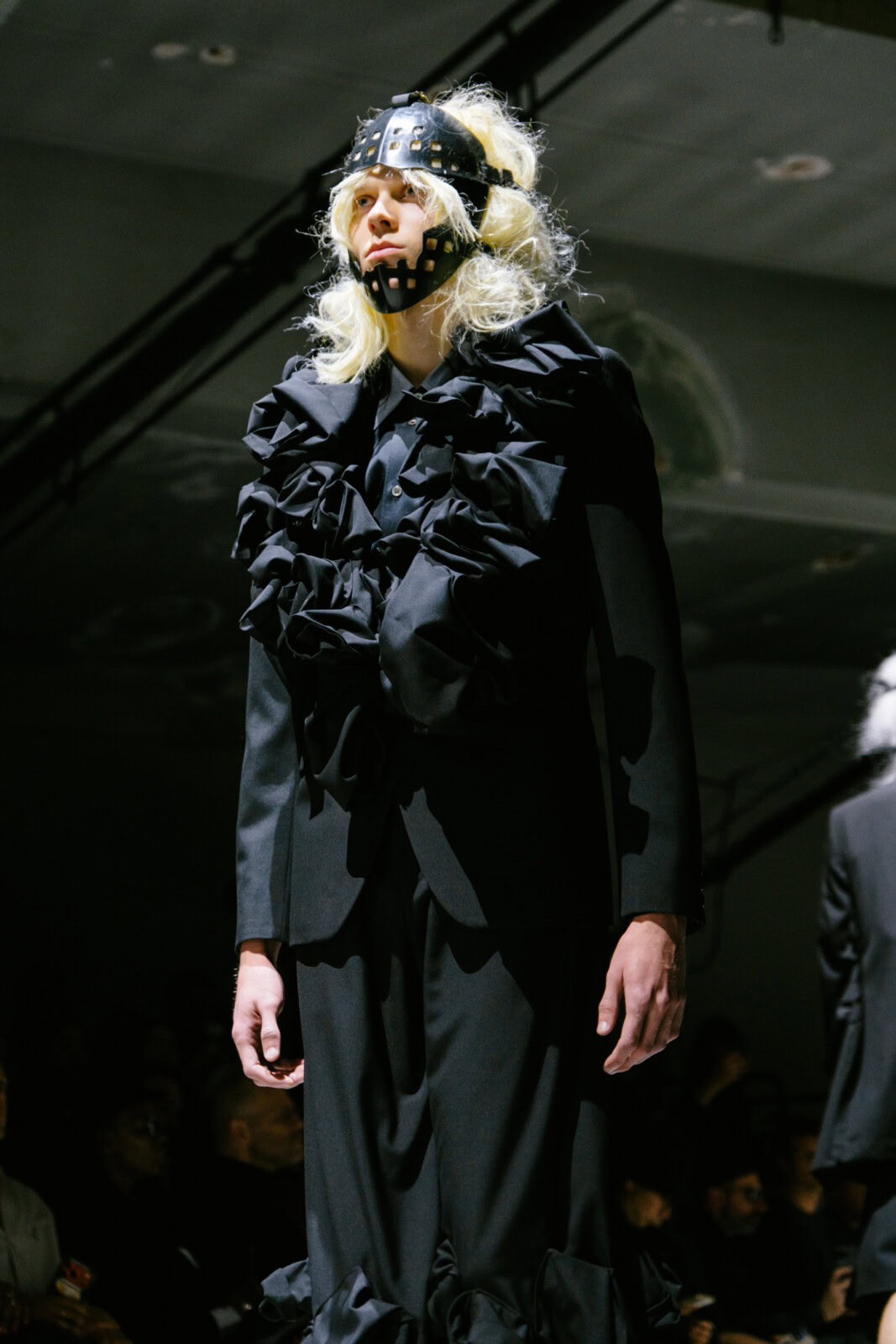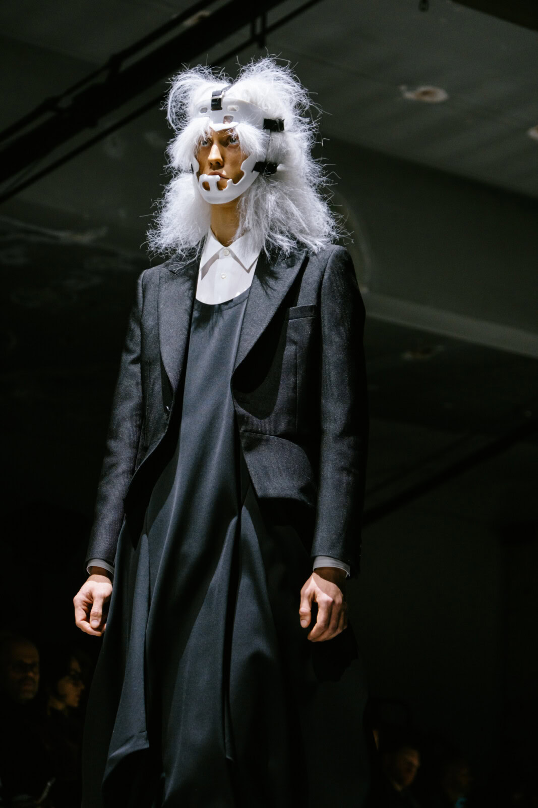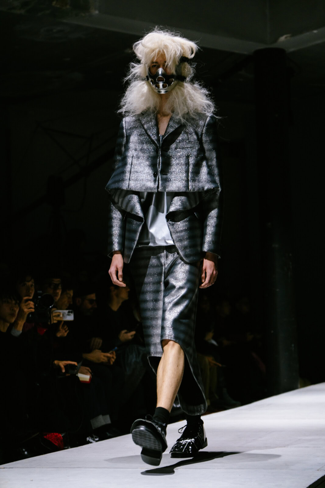 Models came with frazzled wigs and hockey masks that looked a little bit like Hannibal Lecter’s. Their clothes, however, weren’t menacing at all. Some suits came cut in shiny silver fabrics, others in gentle brocades. A focal point was the classic men’s tuxedo which was retooled in a variety of ways. Blazers were sliced in half to expose the midriff or came with cut outs at the back and were elongated to echo the silhouette of a tailcoat. Sometimes trousers were replaced with school boy shorts and shirts were swapped out for dresses that stretched beyond the knee. The most beautiful moment, however, were a series of all white looks that came out in unison to close the show. The suits were scrunched and warped into ruffles what looked like flower bulbs beginning to blossom. A sense of hopelessness, in bloom.