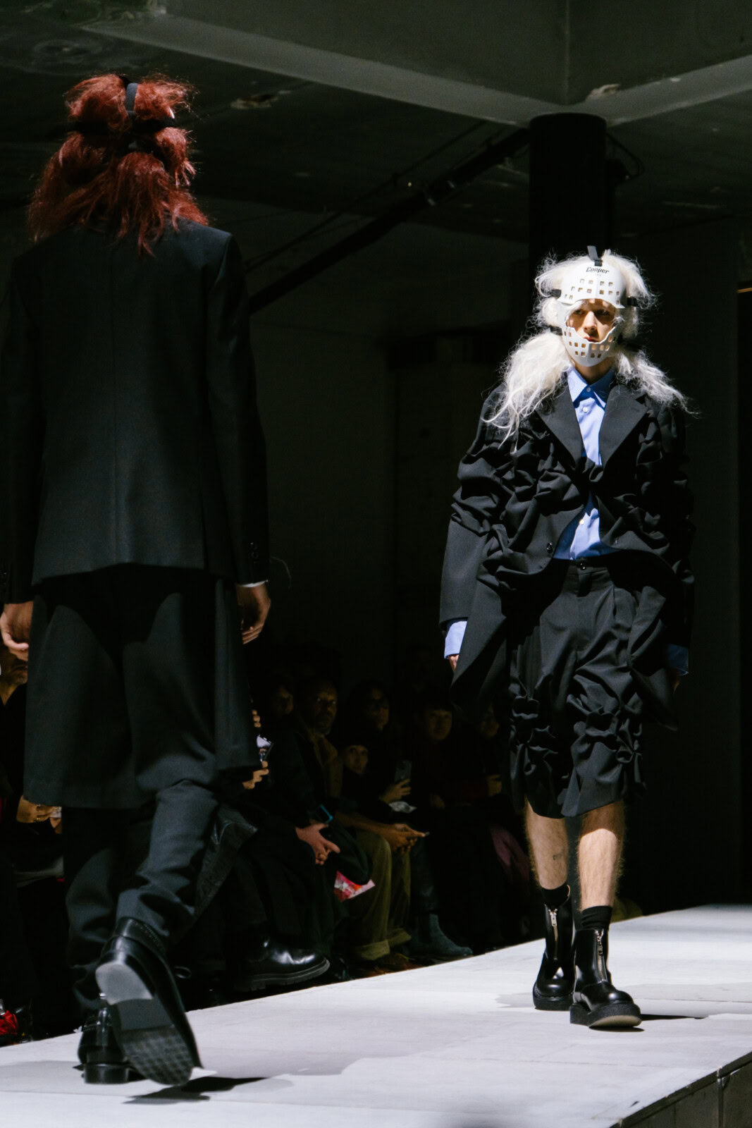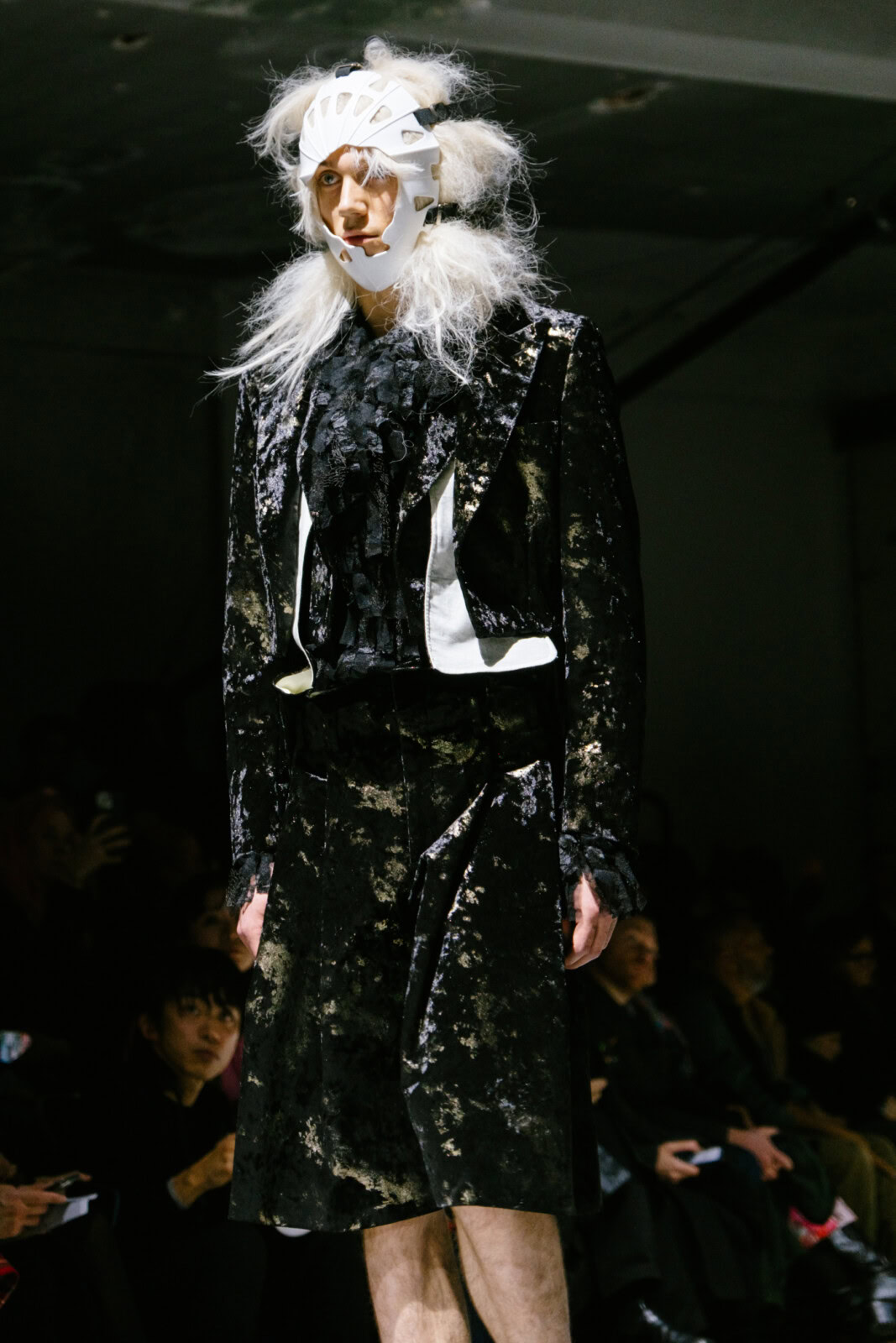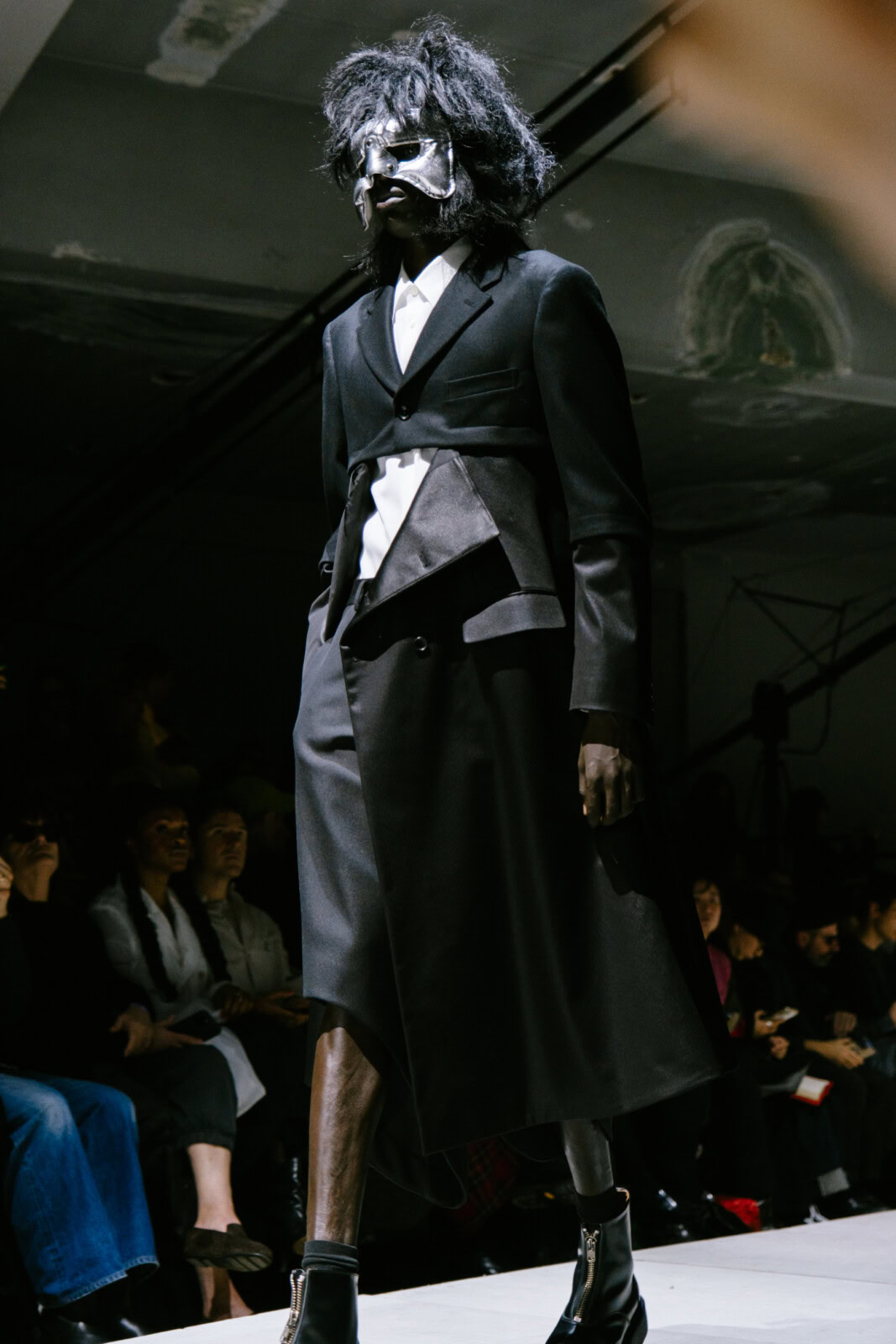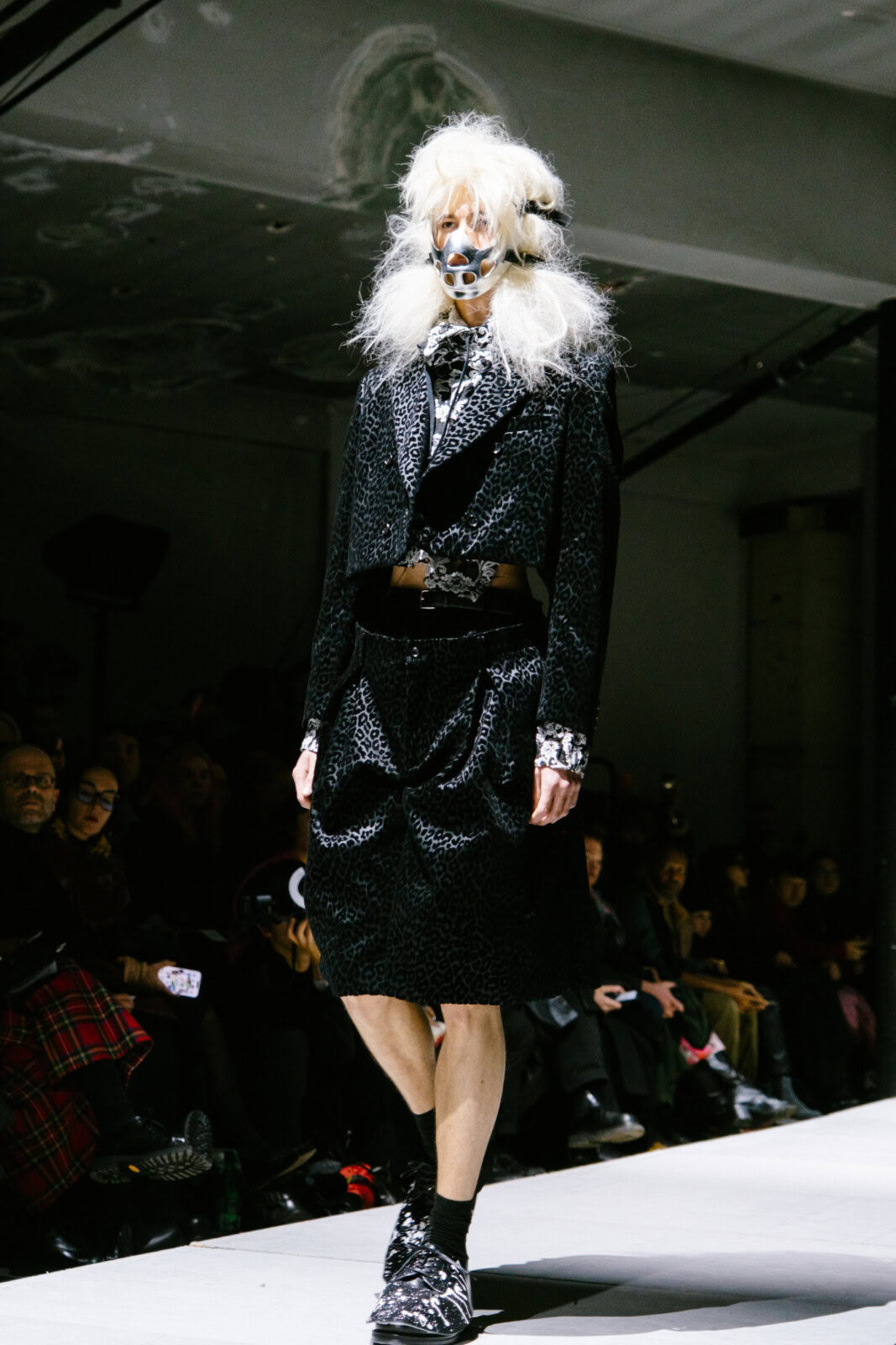 Models came with frazzled wigs and hockey masks that looked a little bit like Hannibal Lecter’s. Their clothes, however, weren’t menacing at all. Some suits came cut in shiny silver fabrics, others in gentle brocades. A focal point was the classic men’s tuxedo which was retooled in a variety of ways. Blazers were sliced in half to expose the midriff or came with cut outs at the back and were elongated to echo the silhouette of a tailcoat. Sometimes trousers were replaced with school boy shorts and shirts were swapped out for dresses that stretched beyond the knee. The most beautiful moment, however, were a series of all white looks that came out in unison to close the show. The suits were scrunched and warped into ruffles what looked like flower bulbs beginning to blossom. A sense of hopelessness, in bloom.