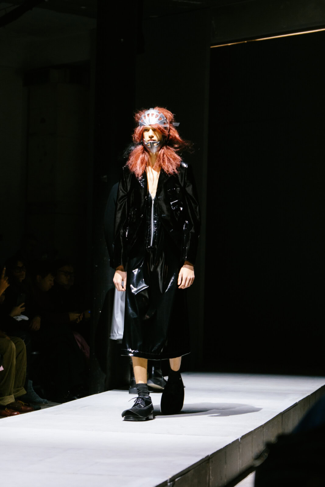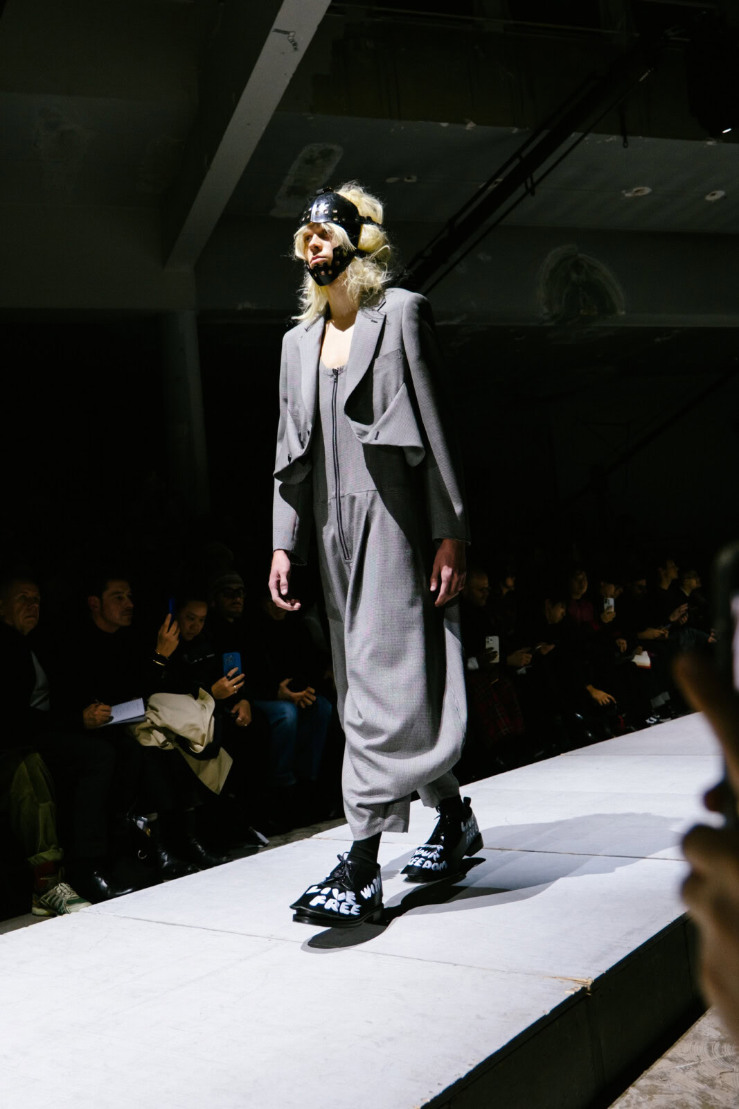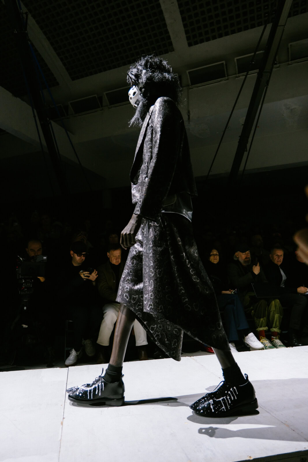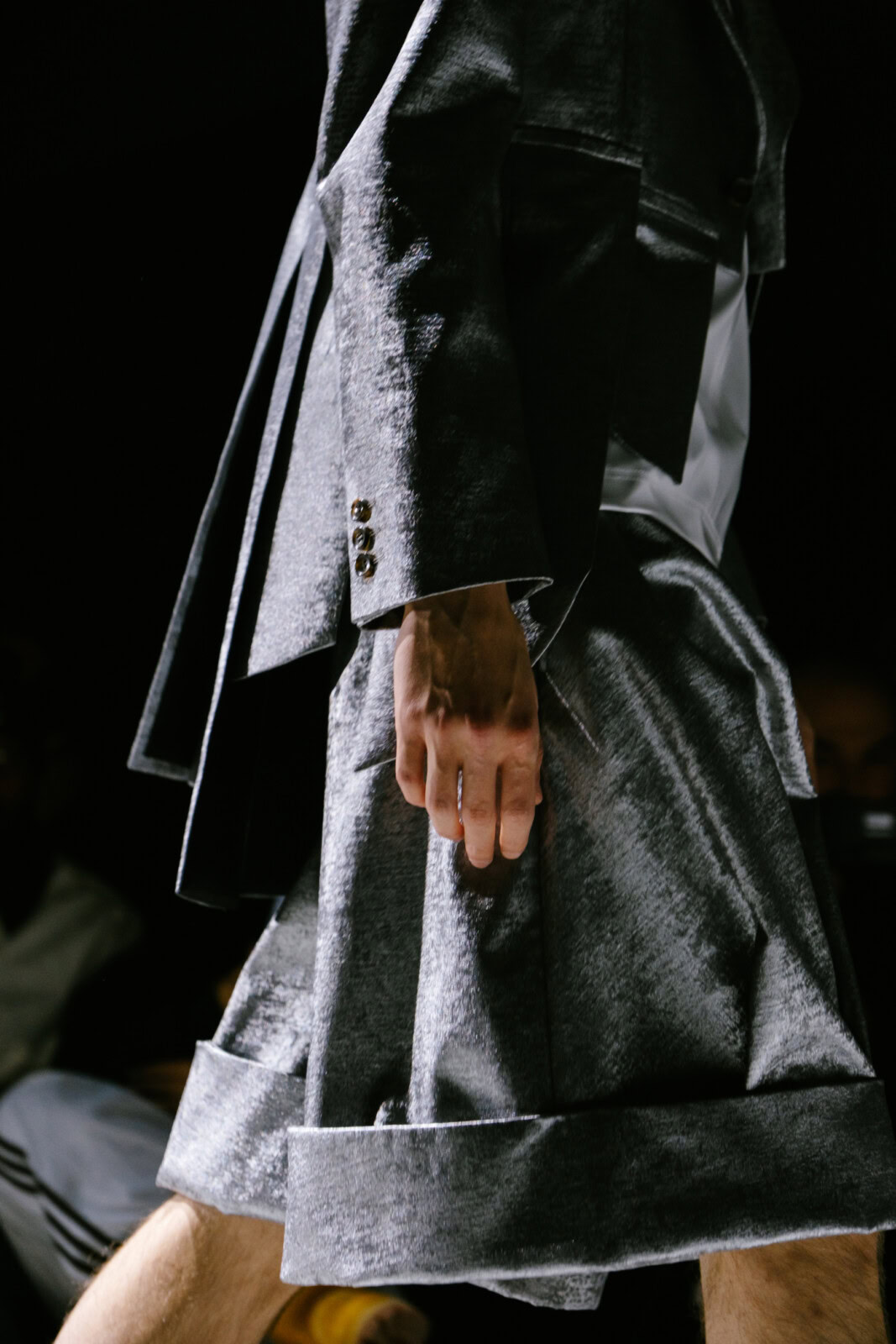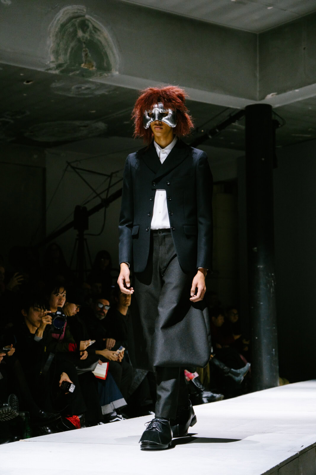 Models came with frazzled wigs and hockey masks that looked a little bit like Hannibal Lecter’s. Their clothes, however, weren’t menacing at all. Some suits came cut in shiny silver fabrics, others in gentle brocades. A focal point was the classic men’s tuxedo which was retooled in a variety of ways. Blazers were sliced in half to expose the midriff or came with cut outs at the back and were elongated to echo the silhouette of a tailcoat. Sometimes trousers were replaced with school boy shorts and shirts were swapped out for dresses that stretched beyond the knee. The most beautiful moment, however, were a series of all white looks that came out in unison to close the show. The suits were scrunched and warped into ruffles what looked like flower bulbs beginning to blossom. A sense of hopelessness, in bloom.