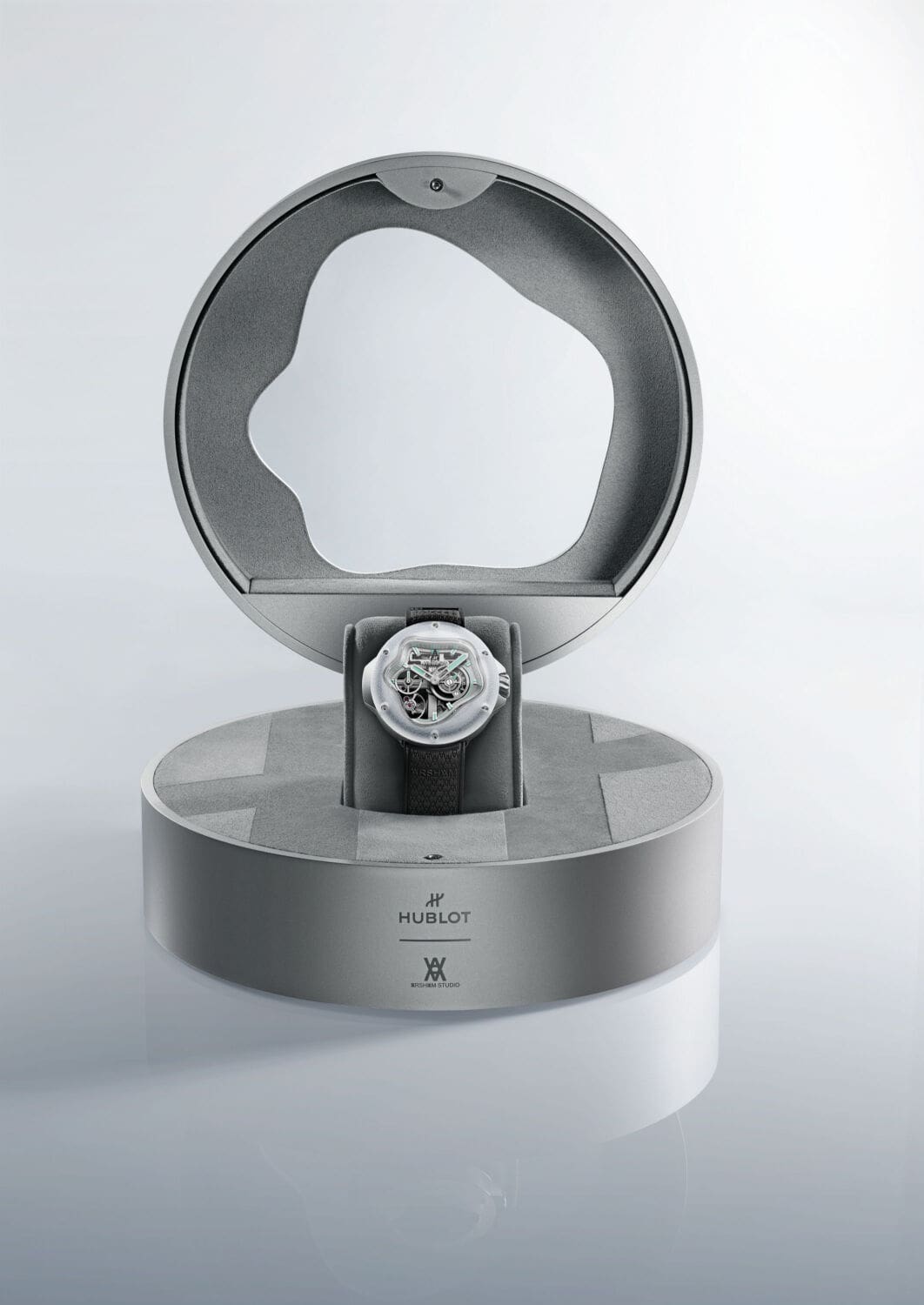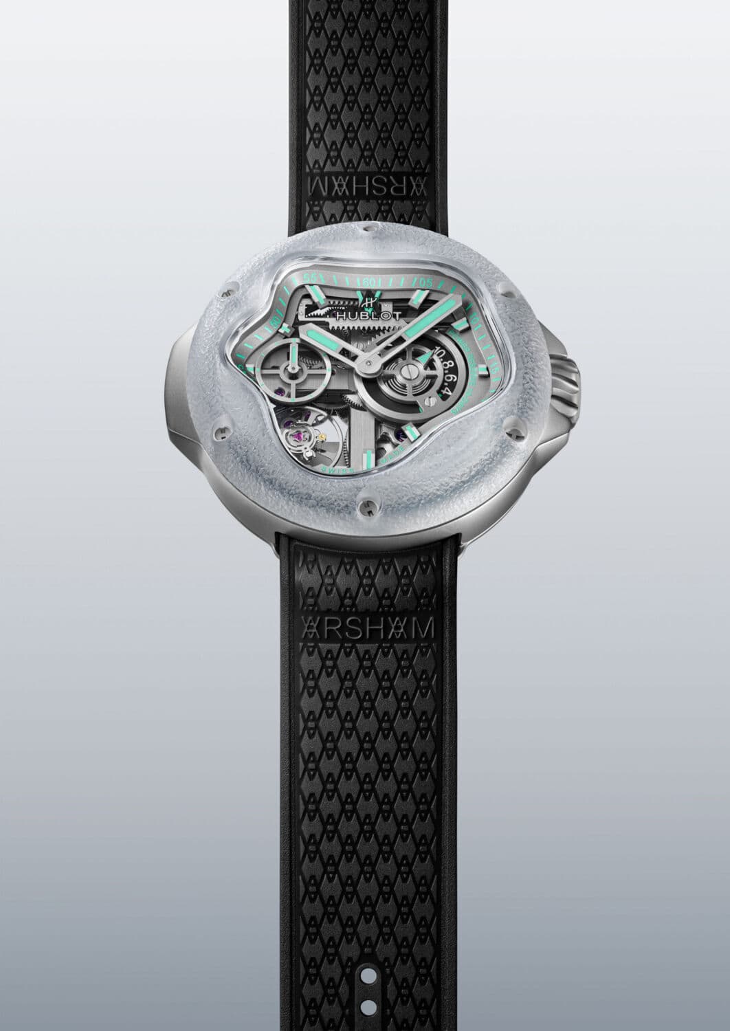 “It’s a testament to Hublot’s Art of Fusion, seamlessly blending fine watchmaking and art to create a timepiece that is visually stunning while pushing the boundaries of innovation. This watch invites us to see time in a new light, through Arsham’s unique and fluid vision,” says Julien Tornare, CEO of Hublot. Unveiled in Singapore, much to the delight of the artist’s many fans who approached him for selfies, the new timepiece is a sleek and modern creation that throws conventional watchmaking on its head. Made from sapphire, both polished and frosted as well as titanium, the result is a three year labour of love resulting in an asymmetrical sculptural design that resembles a drop of water that happened to splash on the wrist and take solid form.