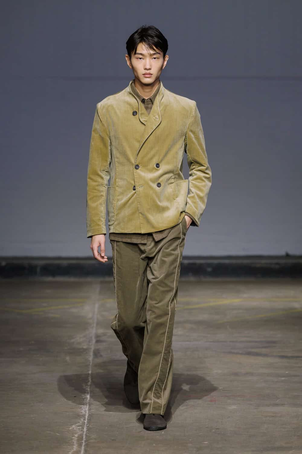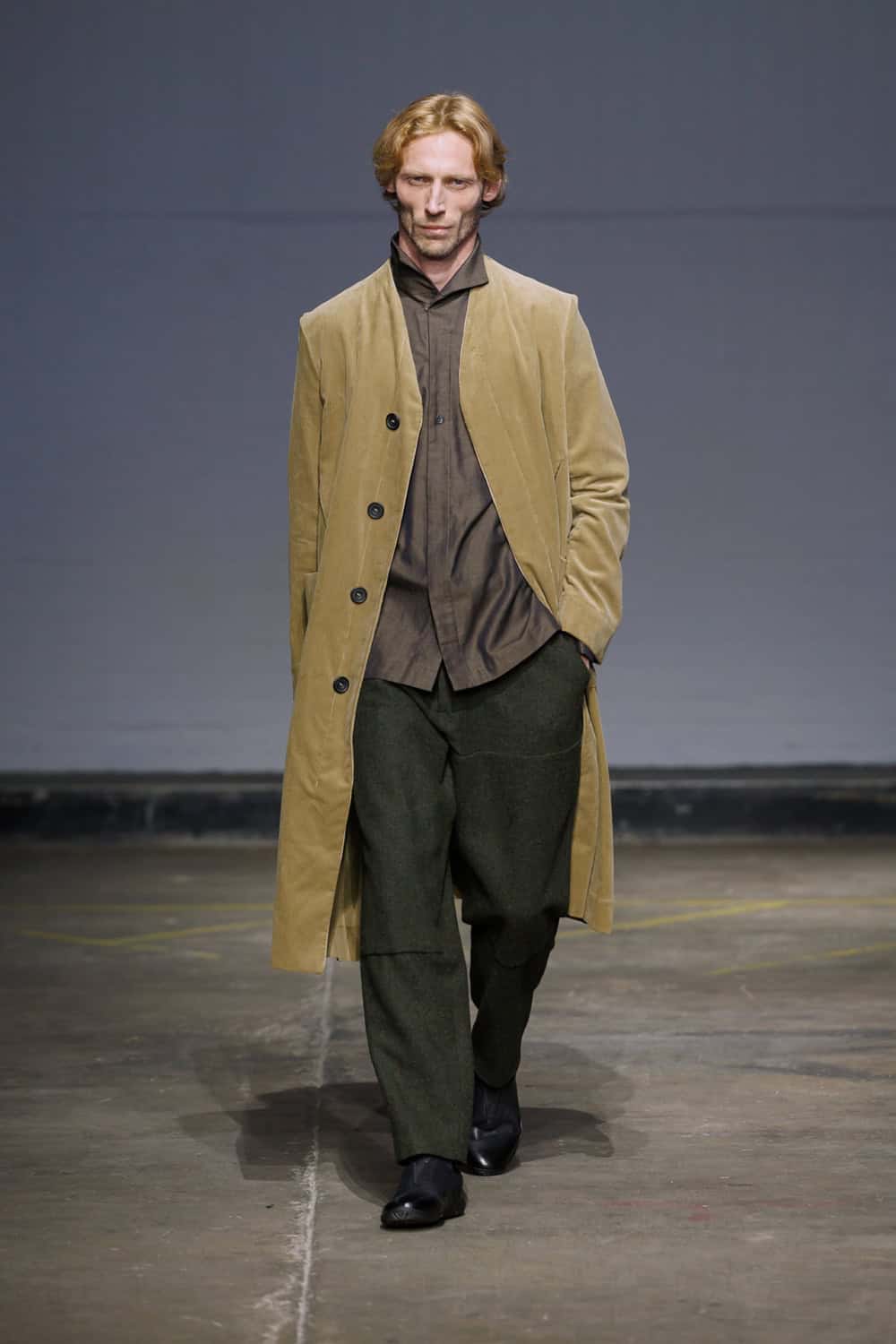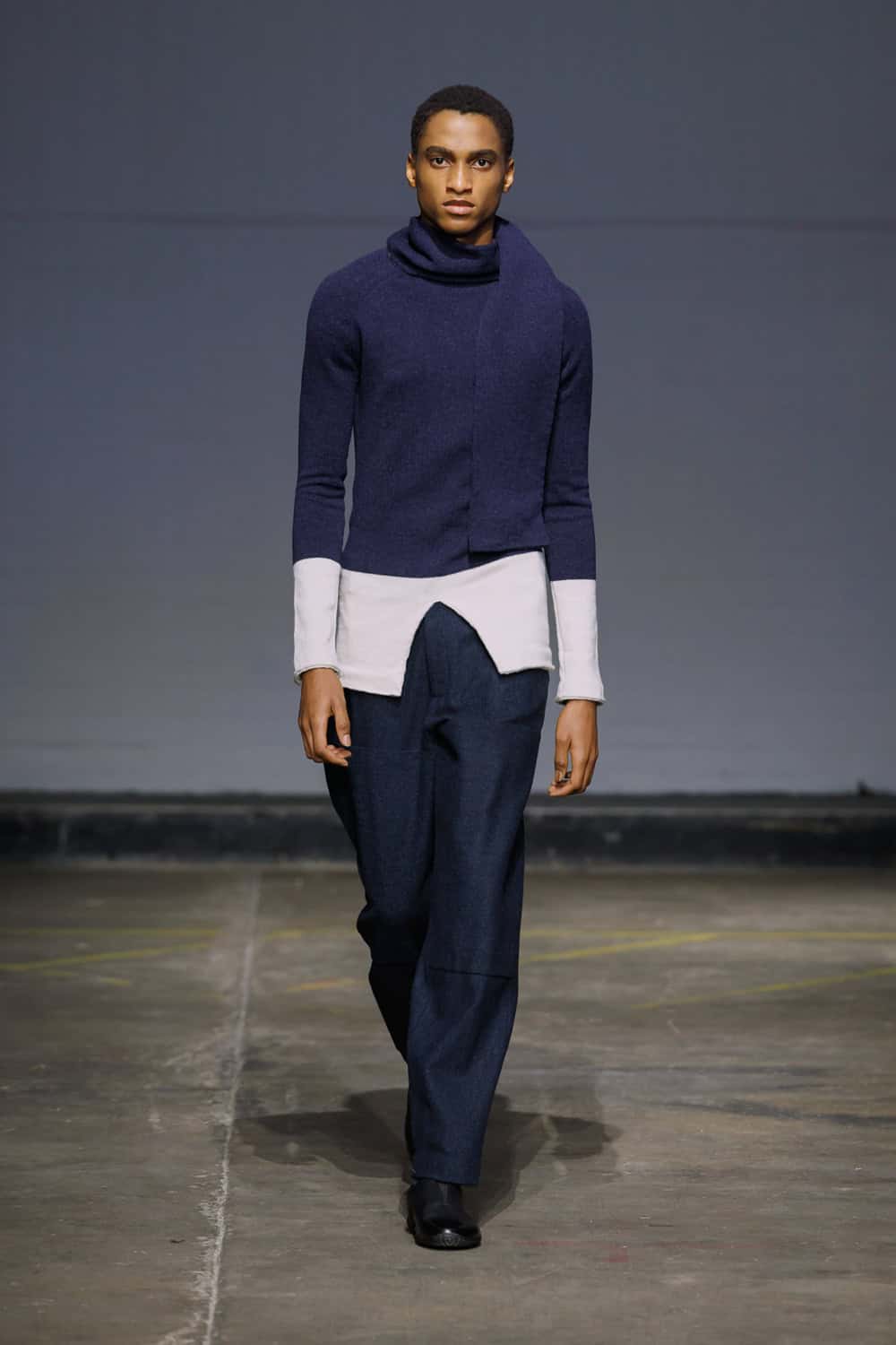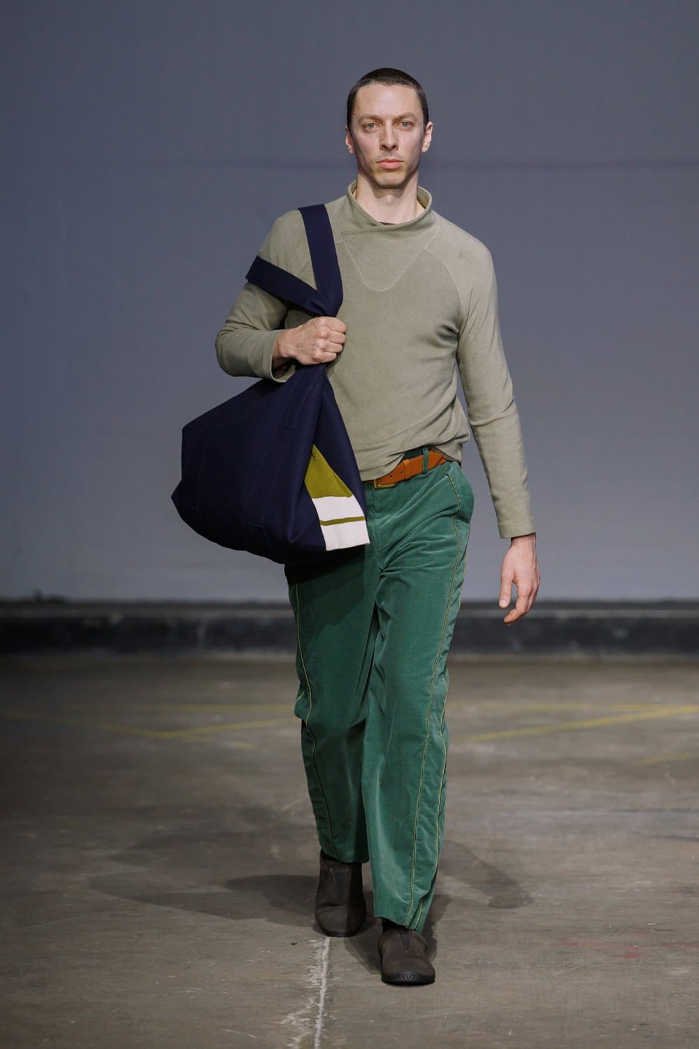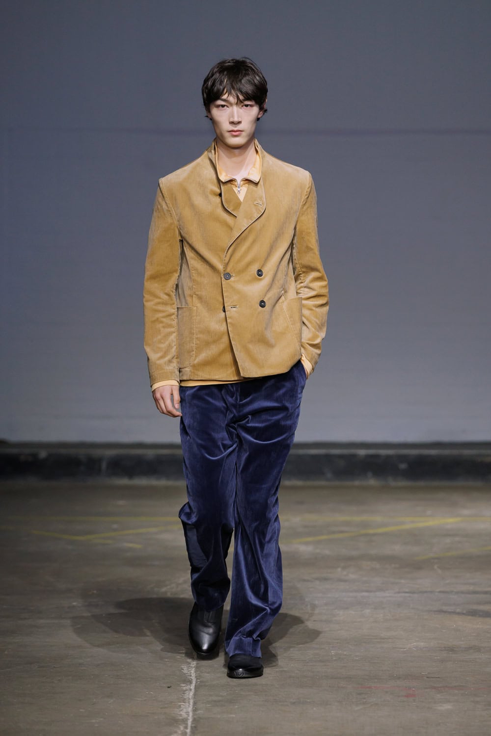 Earlier this month, Luke Derrick made the shortlist to this year’s LVMH Prize. As one of only a handful of menswear designers showing as part of London Fashion Week this season, the CSM alum has found a sweet spot through tweaking classic menswear codes with modern flair. He thinks about the inner city lad, who wants a decent fit, something smart to wear, without committing to a prim and proper suit. His trousers, cut from corduroy and heavy wools, adopt the slouch of a pair of trackies, with sporty piping up the side.